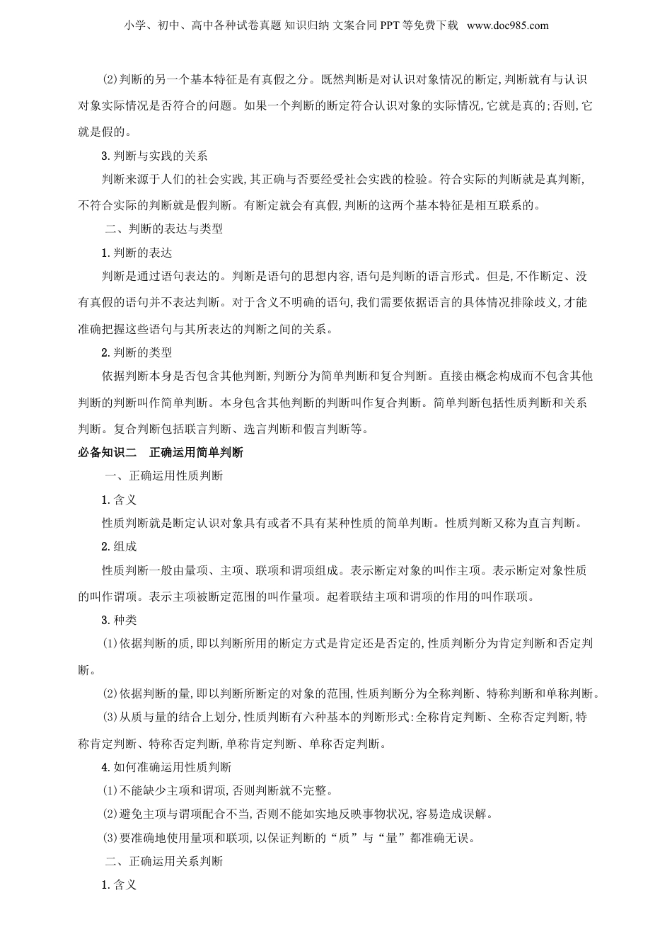 小学、初中、高中各种试卷真题知识归纳文案合同PPT等免费下载www.doc985.com2025年高考政治一轮复习精讲精练第五课正确运用判断【课标要求】知道判断的基本特征;了解形成恰当判断的条件;学会正确运用判断;结合具体的判断活动,区分判断的不同类型。【核心素养】科学精神:通过分析比较判断的不同类型的特点,理解性质判断和关系判断的含义、结构、种类。提高思维能力,培养合作学习的能力和竞争与合作并存的意识,发扬科学精神。正确理解复合判断,通过分析判断的不同类型及其种类,提高思维能力。公共参与:根据形成恰当判断的条件,自觉进行正确判断。根据准确运用性质判断的要求,形成正确的性质判断。理解运用联言判断的意义,明确运用选言判断、假言判断应注意的问题,能够正确作出联言判断、选言判断、假言判断。【命题预测】1.高频考点:判断的基本特征;性质判断的基本形式;关系判断中的“关系的性质”;联言判断的结构及其逻辑性质;选言判断的结构、种类及其逻辑性质;假言判断的结构、种类及其逻辑性质。2.题型预判:选择题和非选择题均会考查。命题常常结合生活中遇到的问题来进行考查。【思维导图】【考点梳理】必备知识一:判断的概述一、判断及其基本特征1.含义:判断就是对认识对象有所断定的思维形式。2.基本特征(1)对认识对象有所断定,是判断的一个基本特征。断定的方式有两种:一是肯定,二是否定。如果既不肯定什么,又不否定什么,就不是判断。小学、初中、高中各种试卷真题知识归纳文案合同PPT等免费下载www.doc985.com(2)判断的另一个基本特征是有真假之分。既然判断是对认识对象情况的断定,判断就有与认识对象实际情况是否符合的问题。如果一个判断的断定符合认识对象的实际情况,它就是真的;否则,它就是假的。3.判断与实践的关系判断来源于人们的社会实践,其正确与否要经受社会实践的检验。符合实际的判断就是真判断,不符合实际的判断就是假判断。有断定就会有真假,判断的这两个基本特征是相互联系的。二、判断的表达与类型1.判断的表达判断是通过语句表达的。判断是语句的思想内容,语句是判断的语言形式。但是,不作断定、没有真假的语句并不表达判断。对于含义不明确的语句,我们需要依据语言的具体情况排除歧义,才能准确把握这些语句与其所表达的判断之间的关系。2.判断的类型依据判断本身是否包含其他判断,判断分为简单判断和复合判断。直接由概念构成而不包含其他判断的判断叫作简单判断。本身包含其他判断的判断叫作复合判断。简单判断包括性质判断和关系判断。复合判断包括联言判断、选言判断和假言判断等。必备知识二正确运用简单判断一、正确运用性质判断1.含义性质判断就是断定认识对象具有或者不具有某种性质的简单判断。性质判断又称为直言判断。2.组成性质判断一般由量项、主项、联项和谓项组成。表示断定对象的叫作主项。表示断定对象性质的叫作谓项。表示主项被断定范围的叫作量项。起着联结主项和谓项的作用的叫作联项。3.种类(1)依据判断的质,即以判断所用的断定方式是肯定还是否定的,性质判断分为肯定判断和否定判断。(2)依据判断的量,即以判断所断定的对象的范围,性质判断分为全称判断、特称判断和单称判断。(3)从质与量的结合上划分,性质判断有六种基本的判断形式:全称肯定判断、全称否定判断,特称肯定判断、特称否定判断,单称肯定判断、单称否定判断。4.如何准确运用性质判断(1)不能缺少主项和谓项,否则判断就不完整。(2)避免主项与谓项配合不当,否则不能如实地反映事物状况,容易造成误解。(3)要准确地使用量项和联项,以保证判断的“质”与“量”都准确无误。二、正确运用关系判断1.含义小学、初中、高中各种试卷真题知识归纳文案合同PPT等免费下载www.doc985.com断定认识对象之间关系的判断,叫作关系判断。2.组成关系判断一般由关系者项、关系项和量项三部分组成。表示关系承担者的叫作关系者项。按照关系者出现的顺序可以称为第一关系者项、第二关系者项、第三关系者项……对于不同关系者项来说,谁在前、谁在后,会影响关系判断的性质。表示关系者之间关系的叫作关系项。表示关系者项范围的叫作量项。3.弄清不同对象之间关系的意义在社会生活中,...