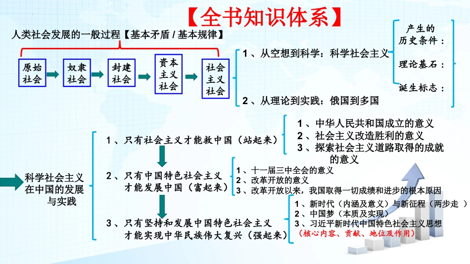 2024届高考二轮复习必修1《中国特色社会主义》知识体系精编人类社会发展的一般过程【基本矛盾/基本规律】原始社会奴隶社会封建社会资本主义社会社会主义社会1、从空想到科学:科学社会主义2、从理论到实践:俄国到多国产生的历史条件:理论基石:诞生标志:科学社会主义在中国的发展与实践1、只有社会主义才能救中国(站起来)2、只有中国特色社会主义才能发展中国(富起来)3、只有坚持和发展中国特色社会主义才能实现中华民族伟大复兴(强起来)1、中华人民共和国成立的意义2、社会主义改造胜利的意义3、探索社会主义道路取得的成就的意义1、十一届三中全会的意义2、改革开放的意义3、改革开放以来,我国取得一切成绩和进步的根本原因1、新时代(内涵及意义)与新征程(两步走)2、中国梦(本质及实现)3、习近平新时代中国特色社会主义思想(核心内容、贡献、地位及作用)【全书知识体系】第一课社会主义从空想到科学、从理论到实践的发展原始社会地位:人类社会发展的最初(最低)阶段生产力发展水平的标志:石器(旧石器时代到新石器时代)生产关系的特点社会组织:氏族、部落、部落联盟发展:原末,生产工具的改进大大推动了生产力的发展(共同劳动个体劳动)解体(1)原始社会人们共同占有生产资料。(2)人们在生产中结成平等互助的关系。(3)平均分配劳动产品根本原因:生产力的发展过程:生产力的发展私有制的确立贫富分化加剧氏族成员地位不平等原始社会解体奴隶社会地位:第一个阶级社会、人类迈入文明时代及人类历史最早的国家产生生产力发展水平的标志:金属工具的广泛使用生产关系的特点最早形成两大对立阶级:奴隶主阶级和奴隶阶级主要矛盾:奴隶阶级和奴隶主阶级之间的矛盾(阶级的含义:在一定生产关系中处于不同地位的集团。)国家历史进步性:P4解体:(1)奴隶主占有生产资料并完全占有奴隶;(2)奴隶毫无人身自由,在奴隶主的强制下劳动;(3)奴隶劳动的全部产品归奴隶主占有和支配,奴隶主只给奴隶最低限度的生活资料。产生:国家是阶级矛盾不可调和的产物(根本原因:生产力的发展直接原因:阶级的产生)本质:阶级统治的工具封建社会生产力发展水平的标志:铁器封建制生产关系的特点历史进步性:生产力发展的表现:P5地主阶级剥削农民的基础:封建土地所有制地主阶级剥削农民的主要方式:收取地租封建国家的显著特点:君主专制、等级森严政治压迫及思想钳制两个基本阶级:农民阶级和地主阶级主要矛盾:农民阶级和地主阶级之间的矛盾解体:根本原因是封末社会生产力和商品经济的发展,资本主义生产关系萌芽。(1)地主占有绝大部分土地,农民有自己的劳动工具甚至少量土地;(2)农民有一定的人身自由,能够比较自主地劳动;(3)地主通过收取地租等方式,占有农民大部分劳动成果。农民的劳动成果除缴纳地租外,还能留下一部分归自己支配。资本主义社会1.开始的标志:资产阶级革命的胜利2.资本主义生产关系特点3.资本主义生产关系建立的条件及其实现途径:4.资本主义社会代替封建社会的历史进步性:P85.资本主义经济危机6.基本矛盾:生产社会化和生产资料资本主义私人占有之间的矛盾(资本主义社会一切矛盾和冲突的根源)7.主要矛盾:无产阶级和资产阶级之间的矛盾8.资本主义终究要被社会主义所取代:根本原因由社会发展规律所决定(1)资本家占有一切生产资料,劳动者失去生产资料;(2)劳动者不得不出卖自己的劳动力,受雇于资本家,成为雇佣工人。(3)资本家在生产过程中占有工人创造的剩余价值。(1)主要表现:(2)基本特征:生产过剩(3)实质:生产相对过剩(4)原因:①直接原因②根本原因科学社会主义的理论产生的历史条件创立思想来源:空想社会主义历史前提:资本主义的发展和工人运动的兴起理论基石诞生标志:1848年2月,《共产党宣言》发表唯物史观(内容及其意义)剩余价值学说(内容及其意义)(1)形成及意义(2)局限性1、主要内容(P15-16)2、意义(1)(2)(3)科学社会主义的实践1、无产阶级夺取政权的第一次伟大尝试:1871年巴黎公社成立2、俄国十月革命的历史意义3、社会主义生产关系的特点4、社会主义从一国到多国的实践5、社会主义...
