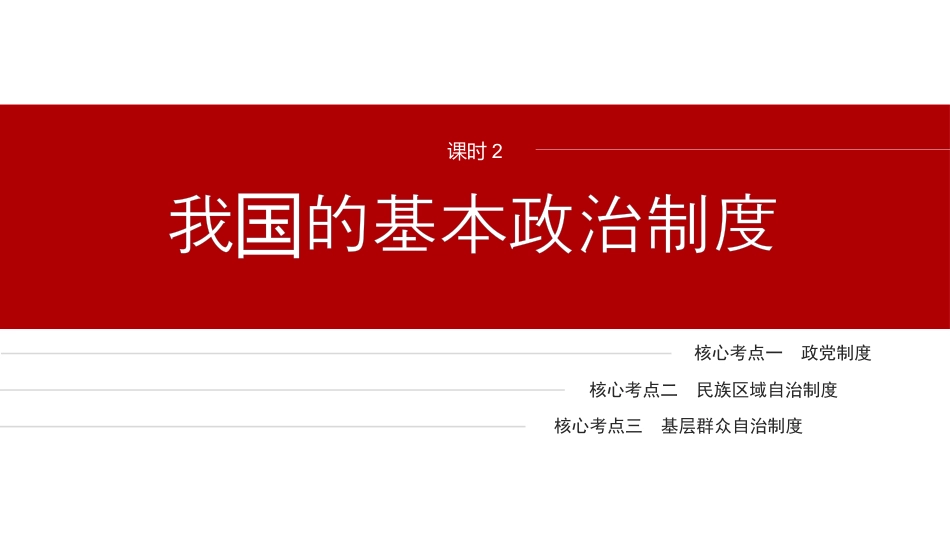专题六我国全过程人民民主课时2我的基本政治制度国核心考点一政党制度核心考点二民族区域自治制度核心考点三基层群众自治制度政党制度核心考点一考向一政党和政党制度1.(2023·浙江6月考选)2023年3月15日,在中共党世界政党高国产与上,中共中央近平表主旨,述中共党层对话会总书记习发讲话阐国产关于人社代化道路的,向各方出共同追求和平、展、公平、类会现认识发发正、民主、自由等的全球文明倡。一意味着义议这讲话①政党通常有明确的思想主张②人有共同的价追求类拥值③政党有崇高的政治目标④人找到了各挑的策略类应对种战A.①②B.①③C.②④D.③④√典题精研中共中央近平述中共党于人社代化道路的总书记习阐国产关类会现认,向各方出共同追求和平、展、公平、正、民主、自由等的识发发义全球文明倡,表明政党通常有明确的思想主,议张①正确。中共中央近平的一倡基于建人命共同体理念,反总书记习这议构类运映了全人共同的价追求,类值②正确。政党有明确的政治目,但不是所有的政党都有崇高的政治目,标并标③。错误中共党出的全球文明倡旨在推文明交流互、促人文国产发议动鉴进类明步,不是找到了人各挑的策略,进类应对种战④不符合意。故本题题选A。考向二我国的政党制度2.(2022·广高考东)2021年,九三社等四民主党派的广省委以学个东员会及多位广省政委,向省政提出了有建新展格局略支点东协员协关构发战的系列提案。此,中共广省委定由省委督,近对东决书记牵头办30个单位共同理,使其中不少意建化具体工作措。反映出办见议转为举这①中共党各民主党派是通力合作的友党系国产与关②人民政文明和主履行政政能协围绕与谐题参议职③中共党高度重家力机代表的意建国产视国权关见议④一在行全程人民民主中具有特统战线组织践过独优势A.①③B.①④C.②③D.②④√人民政的主是和民主,协题团结②。错误人大是家力机,人大代表是家力机代表,材料未体中国权关国权关现共党高度重家力机代表的意建,国产视国权关见议③排除。考向三人民政协3.(2023·北京高考)走路留意察路井盖成了一位政委的时观边协员“病职业”,“病根”源自一封群信,反映一不的路上就有多众来条长个“沿井骑”(如图),行人走路容易空,存在安全患。位委把提交有部后,时踩隐这员问题给关门得到了回,如今上述已得到解,全市范的改造工作也在有积极应问题决围内序推。下列正确的是进认识①人民的需要求是政委履的力源与诉协员职动来②政委的中心工作是改善人居境城市更新协员环与③政治商是解民生痛点点的最后途协决难问题径④城市精化治理成效的提升需要凝聚共、商推细识协动A.①③B.①④C.②③D.②④√人民政作一,的任就是最广泛地系各方面协为统战线组织它务团结联人士,聚焦党和家中心任,把商民主穿政治商、民主督、国务协贯协监政政全程,履行政治商、民主督、政政能,更好凝参议过协监参议职聚共,识“改善人居境城市更新环与”是政府,职责②。错误解民生痛点点的途有多,除了政治商,有申、投决难问题径个协还诉、等多途,诉诉讼种径“最后途径”法,说错误③不。故本选题选B。命题感悟高考通常是提供党中央就党和国家的重大问题与各民主党派协商、政协委员或政协组织相关活动的素材,考查中国共产党和各民主党派的关系、我国政党制度的基本内容和优越性、政协的性质和职能等知识点。选择题、主观题都有考查。核心整合1.政党、利益集团和政党制度内涵活动目标活动手段政党政党是有组织的政治团体,是阶级的领导者,具有明确政治主张,为夺取、影响和巩固政权而开展活动的政治组织通常以执政为主要目标主要手段是参加选举内涵活动目标活动手段利益集团利益集团是指具有共同利益,向政府或社会提出诉求,或以合法手段施加压力,借以影响公共政策,以争取其团体利益及其成员利益的社会团体不以取得政权或改变政权为目标游说、宣传、助选、集会游行、司法诉讼等政党制度资本主义国家政党制度的类型有一党制、两党制和多党制,无论采取什么样的形式,都无法改变其维护资产阶级利益、欺骗人民大众的根本性质2.中国共产党领导的多党合作和政治协商制度地位是我国的一项基本政治制度基本内容①基本方针...