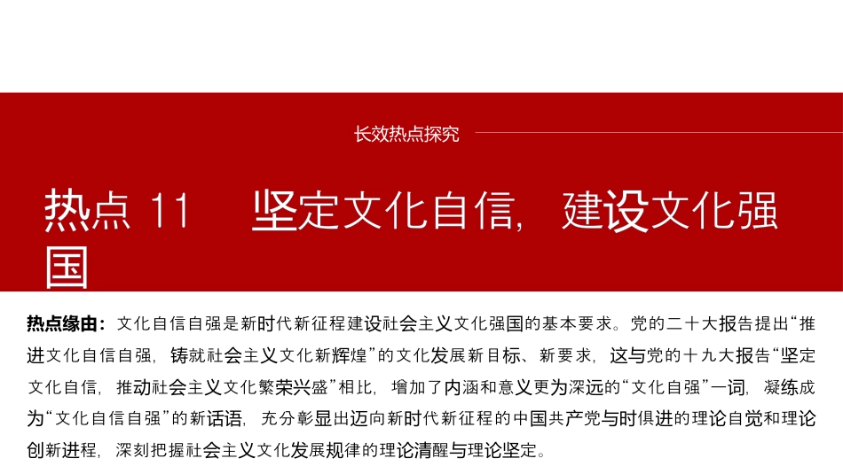 专题十一文化传承与文化创新长效热点探究点热11定文化自信,建文化强坚设国热点缘由:文化自信自强是新代新征程建社主文化强的基本要求。党的二十大告提出时设会义国报“推文化自信自强,就社主文化新煌进铸会义辉”的文化展新目、新要求,党的十九大告发标这与报“定坚文化自信,推社主文化繁盛动会义荣兴”相比,增加了涵和意更深的内义为远“文化自强”一,凝成词练为“文化自信自强”的新,充分彰出向新代新征程的中共党俱的理自和理话语显迈时国产与时进论觉论新程,深刻把握社主文化展律的理醒理定。创进会义发规论清与论坚命题方向1以意义类题目考查发展非遗文创产业对增强文化自信的意义党的二十大告指出,报“全面建社主代化家,必持中设会义现国须坚特色社主文化展道路,增强文化自信,旗、聚民心、国会义发围绕举帜育新人、文化、展形象建社主文化强兴设会义国”。展非这为发遗产业指明了前方向,提出了更高要求。进考法探究3月22日,2023三角地非文品展在上海虹世界中心长区遗创产桥开幕。如生的金蟾、小巧精致的、紫光檀嵌栩栩银壶银丝书签……各做工种精致的非文工品琳琅目,充分呈了民非文展的丰遗创艺满现间遗创产业发成果。近年,非文品硕来遗创产频频“出圈出彩”,非物文化以看让质遗产得、摸得着、用得到的方式走近百姓、融入生活,掀起消潮。见屡屡费热不少地加快推区进“非+遗”展新模式,打造非文集市,非产业发遗创为遗品搭建上下展示、售平台,非文品火起、洋起,也产线线销让遗创产来来收了海外消者的喜。获费爱合材料,用文化承文化新的知,明展非文增结运传与创识说发遗创产业对强文化自信的意。义答案(1)非文品展示了中文化的特魅力,推中文化走遗创产华独动华向世界,增强了中文化的播力、影力和感召力,能激文化自华传响够发信。(2)展非文,有助于承和弘中秀文化,发遗创产业传扬华优传统实现优秀文化的造性化和新性展,激全民族文化新造活力,传统创转创发发创创提升文化力,增强文化自信。软实(3)文化相互交融、相互促展,文化自信离不的展与经济进发开经济发和政治制度的完善,非文可以成重要的支点,促社遗创产业为经济进会主的展,有利于夯文化自信的基。义经济发实础命题方向2以说明类题目考查中国式现代化道路是中国人民基于文明自觉的正确选择[追根溯源增自信]中式代化道路,天下公、民惟邦本、厚德物、信修睦、国现与为载讲天人合一、尊重自然、求同存、和而不同等秀思想高度契合,异优传统是中人民基于文明自的正确。国觉选择代化是中民族孜孜以求的想。片之后,无仁人志实现现华梦鸦战争数士在追求代化的道路上披棘、摸索,都以失而告。中共现荆斩艰难败终国党一成立,就肩起了代化的史重任。新民主主革命期,产经负实现现历义时提出要中由落后的成先的工;新中成立后,逐步提将国农业国变进业国国出了“四代化个现”的想;改革放以,第一次提出了构开来“中式的代国现化”重大命;入新代,近平提出了中式代化的中特题进时习总书记国现国色、本要求和重大原。党的二十大中式代化人口模巨质则将国现总结为规大的代化、全体人民共同富裕的代化、物文明和精神文明相的现现质协调代化、人自然和共生的代化、走和平展道路的代化。现与谐现发现中式代化道路是中人民基于文明自的正确。合材料,国现国觉选择结用文化承文化新知,句的理解。运传与创识谈谈你对这话答案中式代化道路是中共党中人民把克思主基本国现国产领导国马义原理中具体相合,同中秀文化相合;吸收借外与国实际结华优传统结鉴文化的有益成果,推中秀文化造性化新性展;来动华优传统创转与创发在中革命、建、改革放和新代的大中探索形成,是我国设开时伟实践并代化的唯一正确道路。国实现现命题方向3以短评类题目综合考查文化自信自强中文明是悠久而的文明。中秀文化含的天下公、华灿烂华优传统蕴为民邦本、政以德、革故鼎新、任人唯、天人合一、自强不息、厚为为贤德物、信修睦、仁善等,是中人民在期生生活中累的载讲亲邻国长产积宇宙、天下、社、道德的重要体,克思主多重大观观会观观现与马义许点具有在契合性。观内一百多年,我党持用克思主科的世界和方法解来们坚运马...