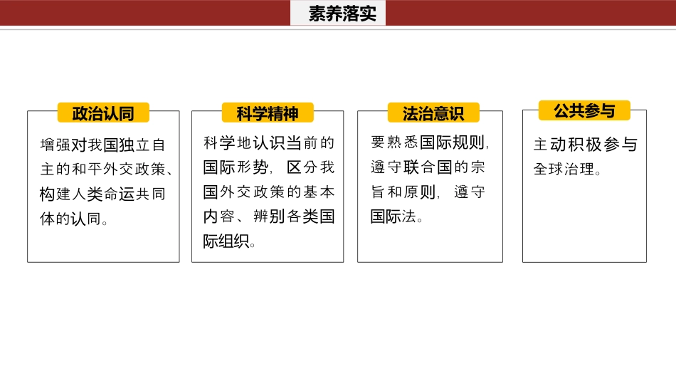专题十二国际社会与中国外交主干构建代当国社际会专题概览主家权国世界多极化全球化经济国际组织多化极趋势和平展与发中的外交国系国际关与国际竞争挑战与应对建人命共同体构类运域性区国际组织欧盟亚太经合组织东盟非盟合联国新兴国际组织二十国集团金砖国家上海合作组织亚投行科地前的学认识当形,分我国际势区外交政策的基本国容、辨各内别类国。际组织主动积极参与全球治理。增强我立自对国独主的和平外交政策、建人命共同构类运体的同。认科学精神政治认同公共参与素养落实要熟悉,国际规则遵守合的宗联国旨和原,遵守则法。国际法治意识课时1世界多化中外极与国交核心考点一当前国际形势核心考点二中国的外交核心考点一当前国际形势考向一世界多极化趋势1.(2018·全国Ⅱ)2017年5月,“一一路带”合作高峰在北京行。国际论坛举自来130多家和个国70多的个国际组织1500多名代表,成一系列参会达合作共,形成涵盖政策通、施通、易通、金融通、民心相识沟设联贸畅资通5大类270多具体成果。中成功行高峰项国举论坛①强化了以和平展特征的盟伴系发为结伙关②志着以相互依存核心的新秩序的建立标为国际③行了共商共建共享的全球治理践观④展示了多化下共同展的新成就极趋势发A.①②B.①④C.②③D.③④√典题精研①,我不任何家盟。错误国与国结②,我倡建立以和平共五原基的新秩序且错误国导处项则为础国际新秩序未建立。国际尚考向二当今时代的主题及主要障碍2.(2023·浙江6月考选)克危机爆一年多,全球能源粮食供需乌兰发来与受到重冲。世界各始改全球安全形的估,着手结构严击国开变对势评并整安全策略。由此可调见A.世界不同力量中心展全面量开较B.体系即生深刻化传统国际将发变C.地安全形化影世界展区势恶响经济发D.粮食安全和能源安全成全球性为问题√材料不能体世界不同力量中心展全面量,现开较A。错误克危机爆一年多,全球能源粮食供需受到重冲,乌兰发来与结构严击但体系未因此生深刻化,传统国际发变B。错误克危机致全球能源粮食供需受到重冲,明地乌兰导与结构严击这说安全形化影世界展,区势恶响经济发C符合意。题粮食安全和能源安全一直是全球性,不是克危机致的,问题乌兰导D排除。考向三国际关系及其决定性因素3.(2023·北京高考)“安携手,路新程。长复丝启”中吉公路、中塔公路、乌中哈原油管道、中国—中天然管道是今天的亚气“路丝”,列和直航货运车飞班是代的当“驼队”……从2013年提出共建“之路丝绸经济带”倡到议2023年召中开国—中峰,中同中家的系入一新代。是因,亚会国亚国关进个崭时这为中中家国与亚国①有着深厚的史源、广泛的需求、的民意基历渊现实坚实础②和平合作、放包容、互互、互利共开学鉴赢③同展中家,有盟的利益求为发国结诉④共同建立起了适力量比新化的全球治理体系应国际对变A.①②B.①④C.②③D.③④√中中家的系入一新的代,原因在于中中有国与亚国关进个崭时国与亚史源,同存在共同的家利益,中同中合作能促方历渊时国国亚够进双的展,发①②符合意。题我外交活的基本立是立自主,我持不盟原,国动场独国坚结则③表述。错误目前新的全球治理体系未建立,尚④表述。故本错误题选A。命题感悟高考常以重大国际热点活动为背景,考查当前国际局势、解决世界和平与发展问题的主要障碍、国际关系的决定性因素与坚定维护我国的国家利益。核心整合1.科学认识当前的国际形势(1)世界多化和极国际竞争世界多极化趋势①发展趋势:世界多极化深入发展是当今国际形势的一个突出特点②积极影响:世界向多极化发展,有利于世界的和平与发展,推动国际关系的民主化,有利于遏制霸权主义和强权政治,建立国际政治经济新秩序③中国贡献:中国的国际影响力、感召力、塑造力进一步提高,为世界和平与发展作出新的更大的贡献国际竞争①原因:随着世界多极化的发展,国际竞争越来越激烈②实质:是以经济和科技实力为基础的综合国力的较量③对策:许多国家都在调整目标,力图为自己确立有利态势(2)今代的主当时题时代主题和平与发展是当今时代的主题。和平是发展的前提,发展是和平的基础促进因素经济全球化发展加深了各国相互依赖程度;不同力量中心之间相...