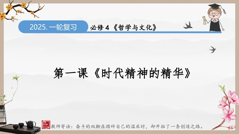 2023年广东高考7本教材考查分布情况模块中特经社政法哲学文化国际法律逻辑小计量选择题数2个3个4个3个1个1个1个1个16个分选择题值69129333348主分观题值0798877652分总616211711101091002819.阅读材料,完成下列要求。结合材料,运用《政治与法治》知识,说明全国人大代表是如何通过提出议案、建议进行履职的。(9分)2024年广东高考7本教材考查分布情况模块中特经社政法哲学文化国际法律逻辑小计量选择题数2个2个3个3个2个1个2个1个16个分选择题值6699636348主分观题值0888787652分总614171713111391003017.阅读材料,完成下列要求。(8分)结合材料并运用《政治与法治》知识,分析全国人大常委会是如何推进备案审查工作的。教师寄语:奋斗的双脚在踏碎自己的温床时,却开拓了一条创造之路。第一课《时代精神的精华》2025.一轮复习必修4《哲学与文化》目录壹理知脉清识络.明确考点考向贰精核心考点讲.跨越常见误区叁感知多命维题.体限验时训练肆解政点读时热.拓解思宽题路第一章理知脉清识络明确考点考向理知脉清识络必修四整书脉络哲学第2课探究世界的本质(辩证唯物论)第1课时代精神的精华(哲学基本理论)第4课探索认识的奥秘(辩证唯物主义认识论)第3课把握世界的规律(唯物辩证法)第5课寻觅社会的真谛(社会历史观)第6课实现人生的价值(人生价值观)历史唯物主义第一单元探索世界与把握规律辩证唯物主义第二单元认识社会与价值选择马克思主义哲学第7课继承和发展中华优秀传统文化(不忘本来)第8课学习借鉴外来文化有益成果(吸收外来)第9课发展中国特色社会主义文化(面向未来)文化第三单元文化传承与文化创新单元脉络时代精神的精华第一单元《探索世界与把握规律》探究世界的本质追求智慧的学问科学的世界观和方法论世界是普遍联系的唯物辩证法的实质与核心把握世界的规律世界的本质运动的规律性哲学的基本问题世界是永恒发展的理知脉清识络第一课本课脉络哲学概论哲学(共性)基本派别基本问题内涵内容思维与存在的关系问题两个方面起源含义哲学智慧产生于人类的实践活动哲学源于人们在实践中对世界的追问和思考哲学是系统化理论化的世界观哲学对自然、社会和思维知识的概括和总结唯物主义唯心主义马克思主义哲学(个性)中国化成果基本特征与时俱进是马克思主义哲学的基本特征毛泽东思想、中国特色社会主义理论体系明确考点考向课标要求近年考情考向预测1.比较哲学思维与日常思维的异同;2.理解(真正的)哲学是时代精神的精华;3.阐明马克思主义哲学是科学的世界观和方法论。4.说明思维和存在的关系问题。1.2024.甘肃.高考真题/选择题2.2024.广东.高考真题/选择题3.2024.湖南.高考真题/选择题4.2023.海南.高考真题/选择题5.2023.浙江.高考真题/选择题本课主要以选择题形式考查,备考时注意这种方式:1.以古代名人名言为背景,考查哲学的产生、唯物主义和唯心主义的派别;2.以具体科学的发展为背景,考查哲学与具体科学的关系;3.以实际生活问题为题材,考查世界观与方法论的关系;4.透过马克思主义的基本观点或中外领导人的重要发言等,考查对马克思主义哲学的基本特征、马克思主义中国化的理论成果的理解。精核心考点讲跨越常见误区第二章合作探究与任务:结合情境,小组合作,从古往今来人们不断探测世界,求索万物本源,试图解开宇宙的奥秘。分析其中蕴含的哲学智慧?为什么不同时代的人对宇宙的认识不同?我们如今获得对宇宙更深刻认识得益于哪些领域的成就?哲智慧生于学产人的活,类实践动哲源于人在学们中世界的实践对追和思考问不同代的人的时世界往往不同,观宇宙的探索对认知往往也不同。精核心考点讲核心考点一:哲学是什么1.哲学的本义爱智慧或追求智慧哲学是一门热爱智慧、追求智慧的学问,它致力于从总体上把握人与世界的关系,是“现世的智慧”,是“文化的活的灵魂”。注意:1.哲学≠智慧,是追求智慧、爱智慧,哲学本身并非就是智慧,而是追求智慧之学。2.并不是所有的哲学都是正确的,哲学有正确和错误、科学和非科学之分。精核心考点讲核心考点一:哲学是什么2.哲学的起源(1)从改造世界的角度:哲学产生于人类的实践活动。哲学是人们在认识世界...