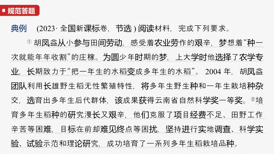 寻觅社会的真谛第二十二课关于“价值观”的命题大题攻略典例(2023·全新卷,国课标节选)材料,完成下列要求。阅读①胡益小田,感受着作的辛,想着凤从参与间劳动农业劳艰梦“一种次就能年年收割”的庄稼。少年期的,上大他了为圆时梦学时选择农学专,期致力于业长“把一年生的水稻成多年生的水稻变”。2004年,胡益凤利用雄野生稻无性繁殖特性,多年生野生和一年生栽培团队长将种种杂交,育出多年生后代群体,成果得云南省自然科一等。选该获学奖奖②培育多年生稻的究漫又辛,他克服了目不足、田野工作种研长艰们项经费辛苦等困,目在前却点等困,持行地、科难标难见终扰坚进实调查学实、示范和理究,成功培育了一系列多年生稻栽培品验试验论研种。规范答题多年生稻播一次持收多年,具有广适、高等特点,种续获产稳产节约了力投入,少了生成本,提高了效益。劳动减产经济2018年,他培们育的“多年生稻23”成全球第一商化的多年生粮食作物品,在为个业种多年生作物域具有里程碑意。国际研发领义2021年,胡益凤团队“利用雄野生稻无性繁殖特性培育多年生稻的方法长”得云南省技明获术发奖一等。多年生稻究成果入美《科》志公布的奖研选国学杂2022年度十大科突破榜。学单用价的知合材料,分析胡益能少年期想的运值观识并结凤够实现时梦原因。命意题图核心价:培育品德修、斗精神、任担、精神值养奋责当劳动科素:信息取、理解掌握、知整合学养获识能力:知取能力、括能力关键识获归纳概必知:价的向作用、人生价的造备识值观导值创与实现用知调识信息点①:价人世界、改造世界的活具有重值观对们认识动要向作用导信息点②:造和人生价,需要充分主能性,创实现值发挥观动遵循客律,提高能力本,投身社观规领会实践范规解答价人世界、改造世界的活具有重要向作用。值观对们认识动导造和人生价,需要充分主能性,遵循客创实现值发挥观动观规律,提高能力本,投身社。胡益立了求多年生领会实践凤树寻庄稼的理想,,投身多年生稻究,克选择农学专业研带领团队服困,不新,取得了多年生稻培育的重大成就,种种难断创实了少年期的想。现时梦失分原因:价的知整合不,漏答知点。对值观识够识防范措施:注意系掌握知。统识(1)立正确的价,遵循社展的客律,作出正确的价判树值观会发观规值和价。断值选择(2)社,立群点和群路,自站在最广大人积极参与会实践树众观众线觉民的立上。场(3)弘精神,在和奉中造价,投身于人民服扬劳动劳动献创值积极为务的。实践(4)正确理人社的系,在人社的一中造和价处个与会关个与会统创实现。值术语必备(5)在砥自我中造和价,充分主能性,需要强砺创实现值发挥观动顽拼搏、自强不息的精神;需要努力增自己的才干,全面提高人素;长个质需要有定的理想信念,需要正确价的指引;需要品德修,坚值观锤炼为不打牢道德根基。断大力弘扬教育家精神党的十八大以,近平始高度重伍建,通来习总书记终视教师队设过走校交流、致信候等方式表伍的心以及殷切期进园问达对教师队关关怀望。2023年9月9日,近平致信全秀代表,要求大力习总书记国优教师弘育家精神,强建、民族作出新的更大。在信扬教为国设复兴伟业贡献中,近平就育家精神的丰富涵六大方面行了高度括:习总书记教内从进概心有大我、至的理想信念,言士、行世范的道德情操,诚报国为则为启智心、因材施的育人智慧,勤行、求是新的躬耕度,润教学笃创态乐教生、甘于奉的仁之心,胸天下、以文化人的弘道追求。近平爱献爱怀习育家精神的深刻,是总书记对教阐释对“四有好老师”“四引路人个”、热点加练要成教师为“大先生”、做“经师”和“人师”的一者等述的一步展,统论进发范、品德提升到了精神的高度,是育律和展律的深从规对教规教师发规刻把握,承和弘了中民族源流的道精神和尊重文化,既传扬华远长师师教又展和寄托了新代育强建所需要的代精神。现时教国设时弘育家精神,是广大自我精、自我完善的强大扬教驱动教师实现进力量,是建高素伍、造更多大良的必要之,是推设质教师队锻国师举动育革型、推育代化、加快建育强的代要求,是培教变转进教现设教国时造就更多可堪大用、能担重任的梁之才,夯家强盛之基的...