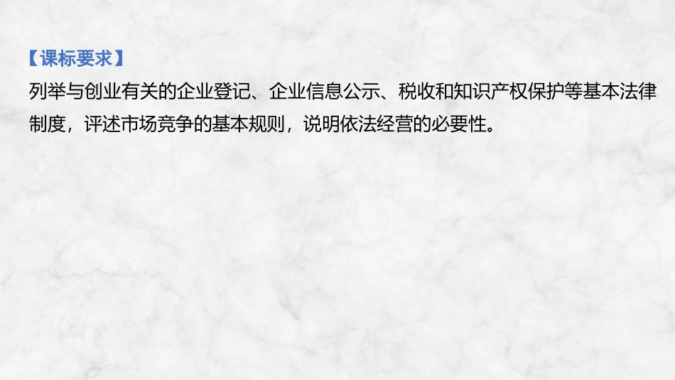 第二课时自主创业与诚信经营【课标要求】列举与创业有关的企业登记、企业信息公示、税收和知识产权保护等基本法律制度,评述市场竞争的基本规则,说明依法经营的必要性。【体系构建】个体工商户、个人独资企业法律规定领取营业执照公平竞争混淆行为虚假宣传消费者安全消费消费者的知情权消费者的自主选择权多种途径国家财政用之于民企业所得税目录CONTENTS//////////////12核心考点一自主创业公平竞争核心考点二诚信经营依法纳税///////4主观题突破主观题对市场公平竞争的考查///////3易错清零目录核心考点一自主创业公平竞争1///////核心考点一自主创业公平竞争考点精析目录1.自主创业(1)市场主体的形式:创业者可以采取个体工商户、个人独资企业、合伙企业、有限责任公司等形式。///////核心考点一自主创业公平竞争考点精析目录提醒《中华人民共和国公司法》规定,有限责任公司由五十个以下股东出资设立;只有一个自然人股东或者一个法人股东的有限责任公司,为一人有限责任公司。(2)创办企业的要求①创办企业应当符合法律规定,并准备相应的文件。②创办企业应当按照规定在相关主管部门办理企业登记,领取营业执照。③企业登记的相关信息应当依法及时公示。///////核心考点一自主创业公平竞争考点精析目录2.市场竞争讲公平(不正当竞争的表现)“搭便车”行为经营者利用他人已经建立的商业信誉,通过某种假冒或者仿冒手段,使消费者发生误认,这种混淆行为就是典型的“搭便车”。这种行为既损害他人的商业信誉,又可能对消费者构成欺诈,损害社会公共利益,属于不正当竞争进行虚假宣传、制作虚假广告的行为①经营者不得对其商品的性能、功能、质量、销售状况、用户评价、曾获荣誉等作虚假或者引人误解的商业宣传,欺骗、误导消费者②经营者不得通过组织虚假交易等方式,帮助其他经营者进行虚假或者引人误解的商业宣传其他不正当竞争行为实施商业诋毁行为、不当有奖销售行为、商业贿赂行为、妨碍或者破坏其他经营者合法提供的网络产品或者服务正常运行的行为等///////考向研究目录核心考点一自主创业公平竞争考向一创业[典例1](2024·湖南永州联考)当前,又有一批走出校门的大学生步入不同的工作岗位。除了到既有单位既有岗位就业外,还有一部分大学毕业生选择了自主创业。2023年7月5日,从某高校毕业的冯某、林某和黎某选择合伙创业,希望得到一些建议。下列建议合理的是()①办理企业登记和领取营业执照,成立一家合伙企业②如果采取合伙方式开办企业,必须及时缴纳企业所得税③了解企业经营管理等方面法律规定,学会风险管理④可使用与他人有一定影响的商标近似的标识,增强市场曝光率A.①③B.①④C.②③D.②④A///////考向研究目录核心考点一自主创业公平竞争解析合伙创业,可成立合伙企业,必须办理企业登记和领取营业执照,①正确。为避免重复征税,国家取消了对合伙企业征收企业所得税,②不选。自主创业不能盲目,应当了解相应法律规定,学会进行风险管理,③正确。创办企业申请商标应为具有独特性的标志,不可侵犯他人的商标权,切不可“搭便车”,④排除。///////考向研究目录核心考点一自主创业公平竞争考向二市场公平竞争[典例2](2023·江苏卷)“温馨斋”私点作为老字号有较好的品牌声誉,当地消费者提起他就想起特殊的风味。后来当地某糕点铺使用“温馨居”字号,并在店铺招牌标注“童年的味道”。案例中该店铺()A.行为构成不正当竞争B.侵害了老字号的商标权C.没有违背公序良俗和公共利益D.使用“温馨居”字号应先注册商标A///////考向研究目录核心考点一自主创业公平竞争[解题能力培养]推理论证排除异误老字号虽有品牌声誉,但不一定注册了商标,所以,该店铺不一定侵害了其商标权,B项排除店铺使用“温馨居”字样,影响老字号声誉,易使消费者发生误认,违背公序良俗和公共利益,C项排除“温馨居”与老字号的“温馨斋”近似,不能用此进行商标注册,D项排除///////命题预测目录核心考点一自主创业公平竞争预测依托创业者创办企业,考查对企业的认识C1.创业是创业者及创业搭档对他们拥有的资源或通过努力对能够拥有的资源进行优化整合,从而创造出更大经济或社会价值...