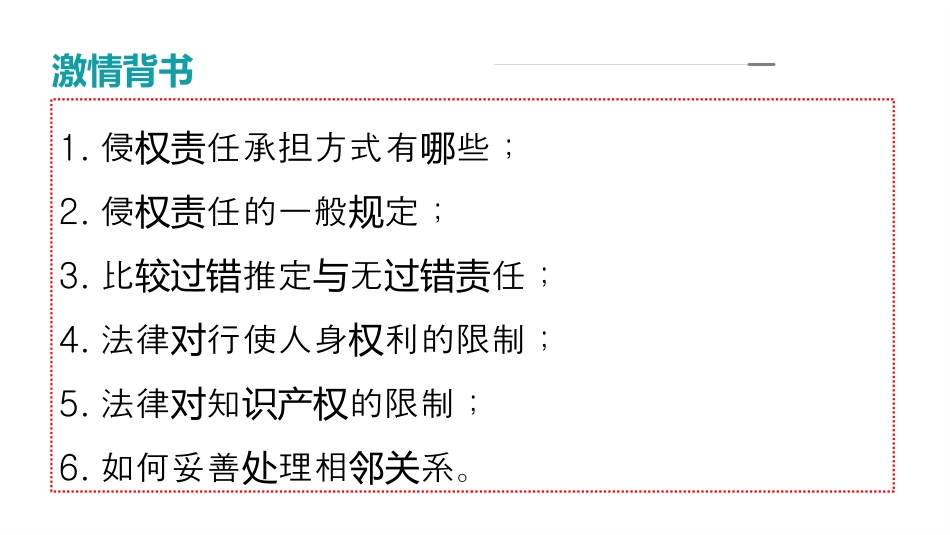 第04课侵权责任与权利界限选择性必修2《法律与生活》2025高考一轮复习讲练测(2024年高考真题)激情背书1.侵任承担方式有些;权责哪2.侵任的一般定;权责规3.比推定无任;较过错与过错责4.法律行使人身利的限制;对权5.法律知的限制;对识产权6.如何妥善理相系。处邻关守护校园安全是学校做好各项工作的基础和前提。校园是学生学习的乐园、成长的摇篮,每一位学生都渴望在安全和谐的校园环境中愉快的学习、健康的成长。然而,有的学校校园霸凌成为危及学生安全、破坏校园和谐的一大隐患。2024年3月,发生在邯郸张庄村某中学的3名初中生霸凌同学,随后将年仅13岁的王某残忍杀害并掩埋尸体的案例警醒我们,当学生遭遇校园霸凌和校园暴力时,不能忍气吞声、逆来顺受,应及时告知老师、父母或其他监护人,必要时寻求法律的保护。同时,也不能不计后果,以牙还牙,恶意报复只会导致雪上加霜。依法反对校园霸凌,共建共享平安校园。针对有的学校校园霸凌严峻问题,我国已颁布实施了《未成年人保护法》《治安管理处罚法》《刑法》等相关法律法规、政策及文件以反对校园霸凌。(1)结合材料,运用《法律与生活》知识,谈谈为何要依法反对校园霸凌。(2)结合材料,运用《法律与生活》知识,为加强对青少年的保护,有效预防青少年违法犯罪,促进未成年人健康成长提出合理化建议。以案说法守护校园安全是学校做好各项工作的基础和前提。校园是学生学习的乐园、成长的摇篮,每一位学生都渴望在安全和谐的校园环境中愉快的学习、健康的成长。然而,有的学校校园霸凌成为危及学生安全、破坏校园和谐的一大隐患。2024年3月,发生在邯郸张庄村某中学的3名初中生霸凌同学,随后将年仅13岁的王某残忍杀害并掩埋尸体的案例警醒我们,当学生遭遇校园霸凌和校园暴力时,不能忍气吞声、逆来顺受,应及时告知老师、父母或其他监护人,必要时寻求法律的保护。同时,也不能不计后果,以牙还牙,恶意报复只会导致雪上加霜。依法反对校园霸凌,共建共享平安校园。针对有的学校校园霸凌严峻问题,我国已颁布实施了《未成年人保护法》《治安管理处罚法》《刑法》等相关法律法规、政策及文件以反对校园霸凌。(1)结合材料,运用《法律与生活》知识,谈谈为何要依法反对校园霸凌。(2)结合材料,运用《法律与生活》知识,为加强对青少年的保护,有效预防青少年违法犯罪,促进未成年人健康成长提出合理化建议。以案说法(2024·山东·三模)龙年贺岁片《第二十条》在共情中传递法律的温度,使“国法天理人情相统一”的司法理念深入人心,也让民法典的“好人条款”再次走进民众的视线。【案例】年近七旬的秦阿婆在地铁站内乘坐上行电梯时,因未抓住扶梯导致身体向后倾斜摔倒。魏先生见状,赶忙跑来帮忙搀扶秦阿婆,在搀扶过程中,秦阿婆欲蹬脚借力起身,其和魏先生又先后向后倾倒,导致后排张女士被撞而摔倒受伤。随后,地铁公司工作人员到达现场处置。张女士被送医治疗,被诊断为头面部外伤、右桡骨远端骨折。张女士起诉要求秦阿婆承担责任。【判决】法院终审判决,由秦阿婆对张女士承担赔偿责任,魏先生及地铁公司不承担责任。结合材料,运用法律与生活知识,说明上述判决是如何兼顾法理情,彰显司法公平正义的。以案说法资料卡1:民法典第一百八十三条因保护他人民事权益使自己受到损害的,由侵权人承担民事责任,受益人可以给予适当补偿。没有侵权人、侵权人逃逸或者无力承担民事责任,受害人请求补偿的,受益人应当给予适当补偿。资料卡2:见义勇为构成要件1.自愿性:救助人实施救助行为须无法定或约定的救助义务;2.利他性:救助人实施救助行为系为了使国家利益、社会公共利益或者他人合法权益免受损失;3.紧急性:救助人应当在紧急情况下实施救助行为,在客观上具有一定的危险性。【判决】法院终审判决,由秦阿婆对张女士承担赔偿责任,魏先生及地铁公司不承担责任。结合材料,运用法律与生活知识,说明上述判决是如何兼顾法理情,彰显司法公平正义的。守护校园安全是学校做好各项工作的基础和前提。校园是学生学习的乐园、成长的摇篮,每一位学生都渴望在安全和谐的校园环境中愉快的学习、健康的成长。然而,有的...