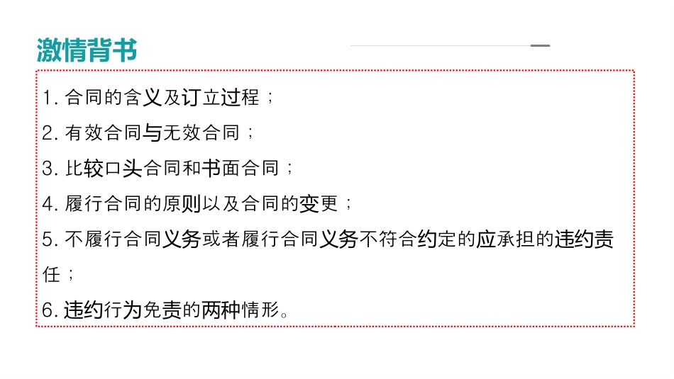 第03课订约履约诚信为本选择性必修2《法律与生活》2025高考一轮复习讲练测(2024年高考真题)激情背书1.合同的含及立程;义订过2.有效合同无效合同;与3.比口合同和面合同;较头书4.履行合同的原以及合同的更;则变5.不履行合同或者履行合同不符合定的承担的义务义务约应违约责任;6.行免的情形。违约为责两种01考情透视目录contents02知识导图03考点突破04真题练习01考情透视01考情透视考点要求考题统计备考建议订立合同学问大2024选择题:湖南卷本讲选择题和主观题都有考查,复习时关注一些命题:明确合同的相关知识,明确合同的订立、效力与变更。以合同订立过程为背景,考查合同效力。理解合同的履行、变更,明确违约责任和免责情形。以合同履行过程为背景,考查合同履行、违约责任。2023选择题:辽宁卷2022选择题:海南卷;天津卷;北京卷主观题:北京卷有约必守违约有责2024选择题:湖北卷2023选择题:海南卷2022选择题:辽宁卷;山东卷;浙江卷复习目标:简述合同的含义和价值,理解合同的主要内容和违约责任,了解合同订立的程序,熟悉解决合同纠纷的途径02知识导图科学社会主义由创立、再由理论变为现实的过程。展示其强大的生命力02知识导图03考点突破特别提醒:一种社会形态取代另一种社会形态,究竟是历史的进步还是倒退,判断的主要标准是看生产关系是否适应生产力发展的要求,是否符合人类社会发展的总趋势。知识点1生活离不开合同(1)合同的含义:是民事主体之间设立、变更、终止民事法律关系的协议。(2)常见类型:买卖合同、赠与合同、租赁合同、运输合同等。(3)特点:合同必须由订立合同的各方当事人在自愿的基础上达成共识,即就某种民事法律关系的设立、变更、终止形成一致的意思表示,以实现各自的利益。(4)意义:①自愿订立的合同可以满足市场交易者的特定需求,有利于资源的有效配置,从而增加整体社会财富。②自愿订立的合同促成市场交易者相互合作,共同形成社会的信用机制。意思表示:是指行为人将其期望发生法律效果的内心意愿,以一定的方式表现于外部的行为。意思表示是民事主体自由意志的体现,对合同的成立和生效具有决定性的意义。名词点击p23相关链接:格式条款:含义:格式条款是一方当事人为重复使用而预先拟定交易条件,并在订立合同时未与对方协商的条款,如火车站背面关于“乘车须知”的规定。作用与不足:有助于降低交易成本,适应现代市场经济发展的要求,但也限制了对方当事人的合同自由。民法典规定,采用格式条款订立合同的,提供格式条款的一方应当遵循公平原则确定当事人之间的权利和义务,并采取合理的方式提示对方注意免除或者减轻其责任等与对方有重大利害关系的条款,按照对方的要求,对该条款予以说明。提供格式条款的一方未履行提示或者说明义务,致使对方没有注意或者理解与其有重大利害关系的条款的,对方可以主张该条款不成为合同的内容。要约要约邀请含义举例内容对象效力希望与他人订立合同的意思表示希望他人向自己发出要约的表示超市标明商品的价格,是对顾客发出的要约。商业广告和宣传的内容符合要约条件的,构成要约。拍卖公告、招标公告、商业广告和宣传、寄送的价目表等为要约邀请。具体明确,即是合同订立所必需的主要条款。内容只是表达了行为人愿意订立合同的意图并不包含合同的主要条款(含糊、不明确)一般只向特定的对象发出。多数情况下向不确定的人发出生效的要约具有法律效力要约邀请不具有法律效力(1)要约和要约邀请含义是受要约人同意要约的意思表示要求应当由受要约人及时向要约人作出,并在要约确定的期限内到达,该意思表示的内容应当与要约的内容一致效力承诺到达对方后,立即发生法律效力,订立合同的过程随之结束变更在实际协商过程中,受要约人的“承诺”可能增加新的内容,如果对原来的要约内容进行了实质性变更或者超过了要约确定的期限,该项“承诺”转化为新要约,需要原来的要约人作出承诺,才能形成一致的意思表示(2)承诺含义是受要约人同意要约的意思表示要求应当由受要约人及时向要约人作出,并在要约确定的期限内到达,该意思表示的内容应当与要约的内容一致效力承诺到达对方后,...