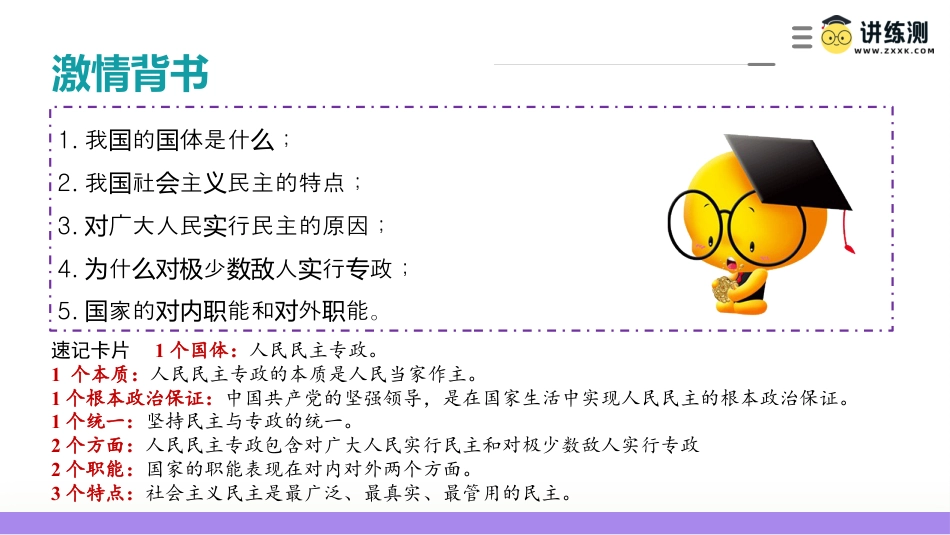 第04课人民民主专政的社会主义国家2025高考一轮复习讲练测(2024年高考真题)《政治与法治》速记卡片1个最本质的特征:中国共产党领导是中国特色社会主义最本质的特征。1个总要求:新时代党的建设的总要求。1个意义:坚持和加强党的全面领导的意义。3种领导方式:政治领导、思想领导和组织领导。3种执政方式:科学执政、民主执政、依法执政。激情背书1.我的体是什;国国么2.我社主民主的特点;国会义3.广大人民行民主的原因;对实4.什少人行政;为么对极数敌实专5.家的能和外能。国对内职对职速记卡片1个国体:人民民主专政。1个本质:人民民主专政的本质是人民当家作主。1个根本政治保证:中国共产党的坚强领导,是在国家生活中实现人民民主的根本政治保证。1个统一:坚持民主与专政的统一。2个方面:人民民主专政包含对广大人民实行民主和对极少数敌人实行专政2个职能:国家的职能表现在对内对外两个方面。3个特点:社会主义民主是最广泛、最真实、最管用的民主。01夯基·考点讲解考点一人民民主专政的本质:人民当家作主考向1我国的国体——人民民主专政考向2全过程人民民主考点二坚持人民民主专政考向1坚持民主与专政的统一考向2社会主义现代化建设的可靠保障教材融合内容概览02提升·真题研析03拓展·教材深挖拓展及术语表达归纳总结+易错辨析+拓展延伸逐项剖析+规律探寻我国政府的经济职能必修2必修4国家主权时代的主题中国外交构建人类命运共同体选必12024年是中华人民共和国成立75周年,是实现“十四五”规划目标任务的关键一年,也是全国人民代表大会成立70周年。※我给两会捎句话14年的“两会习惯”汇聚民意新期盼一年一度的全国两会是人民群众政治生活中的一件大事,从2011年起每到两会前夕,各界群众围绕社会经济发展的方方面面,通过人民网“我给两会捎句话”踊跃建言,中央部委及地方党委政府主要负责同志通过人民网致信群众畅谈发展——两会时间的“两会习惯”,已成为新时代新征程上一年一度的佳话。春天里的互动奏响民主最强音民心民意说了有人听、听了有反馈,是全过程人民民主真实生动的写照。放眼各地,人民网“领导留言板”搭建的建议征集平台在帮助政府科学民主决策上发挥着重要作用,不少建言已经实实在在转化成开展工作的好思路、好举措,如黑龙江群众关于跟随中小学生身体发育调整课桌椅高矮的建议、西藏群众关于探索川藏线上文化旅游发展的建议均被写入当地政府工作报告。议题探究:运用“人民民主专政的社会主义国家”的有关知识,谈谈你对“我给两会捎句话”的认识。热点聚焦【探究提示】①社会主义民主是一种新型的民主,是全过程民主,不仅有完整的制度程序,而且有完整的参与实践,是全链条、全方位、全覆盖的民主。“我给两会捎句话”,是全过程人民民主的生动体现。②我国是人民民主专政的社会主义国家,本质是人民当家作主。社会主义民主是维护人民根本利益的最广泛、最真实、最管用的民主。“我给两会捎句话”有利于拓宽建言献策渠道,团结一切可以团结的力量,使各方面制度和国家治理更好体现人民意志、保障人民权益、激发人民创造;有利于发扬民主,促进政策科学化、民主化,推动我国民主政治建设。③我们要坚定人民民主专政,保持中国特色,发扬制度优势,坚决走中国特色社会主义民主政治发展道路。热点聚焦01考情透视目录contents02知识导图03考点突破04真题练习01考情透视考点要求考题统计备考建议人民民主专政的本质:人民当家作主2024主观题:湖北卷本讲选择题和主观题都有考查,本专题中我国的国体、人民民主的特点、全过程人民民主、公民的权利等属于高频考点。复习时关注一些命题:全过程人民民主”;国家重视消费者合法权益保护工作;打击网络诈骗;新时代“枫桥经验”等;试题情境大多采用简单情境、一般情境,情境具有新颖性、简明性、真实性等特点;考查的关键能力主要有辨识与判断、分析与综合、推理与论证、探究与建构2023选择题:天津卷2022选择题:浙江卷主观题:重庆卷、湖南卷、江苏卷坚持人民民主专政2023无2022无复习目标:列举宪法有关人民主体地位的规定,说明我国是人民民主专政的社会主义国家科学社会主义由创立、...