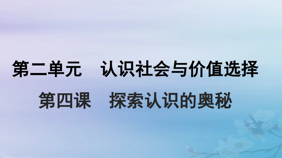 第二单元认识社会与价值选择第四课探索认识的奥秘下一页上一页返回目录【课标要求】1.了解人的实践活动的特点和作用,理解社会生活的实践本质。2.阐明实践是认识的基础,是检验认识的真理性的唯一标准。3.阐述认识运动的辩证发展过程。网络串联·自主学习01下一页上一页返回目录能动反映物质性社会历史性来源动力唯一标准目的相符合条件性开拓创新核心突破·命题探源02下一页上一页返回目录核心点一人的认识从何而来一、认识与实践1.认识(1)含义:认识是主体对客体的能动反映。下一页上一页返回目录(2)认识的两种反映形式:感性认识、理性认识。①区别:感性认识是人们在实践基础上由感觉器官直接感受到的关于事物的现象、事物的外部联系、事物的各个方面的认识,分为感觉、知觉和表象三种形式,是认识的初级阶段。理性认识是人们借助抽象思维在概括、整理大量感性材料的基础上达到关于事物的本质、全体、内部联系和事物自身规律性的认识,分为概念、判断和推理三种形式,是认识的高级阶段。②联系:都是人们对客观世界的反映形式;感性认识有待于发展、深化为理性认识,理性认识依赖于感性认识,二者相互渗透、相互包含,具有辩证统一关系。下一页上一页返回目录2.实践(1)含义:实践是人们改造客观世界的物质性活动。(2)基本形式:改造自然的生产实践、变革社会的实践、探索世界规律的科学实验活动等。(3)特点项目理解侧重点客观物质性实践的基本要素包括实践的主体、实践的对象和实践的手段。它们都是客观的。实践活动的过程及其结果是受客观事物及其运动规律制约的,也具有客观性强调实践受客观因素的影响下一页上一页返回目录项目理解侧重点主观能动性实践是人有目的、有意识的活动。在改造自然获取物质生活资料的实践中,人创造出自然中原来没有的新的物质生活资料;在改造社会的实践中,人创造出新的社会结构和社会关系强调实践受主观因素的影响社会历史性社会性:实践是处在一定社会关系中的人的活动。历史性:人的实践活动是历史地发展着的社会性强调实践受横向因素的影响;历史性强调实践受纵向因素的影响下一页上一页返回目录【归纳提升】区分实践的特点与意识的特点(1)具有客物性、主能性和社史性;意具有目的性、自实践观质观动会历识性和能造性。觉选择动创(2)是一直接性活;意不具有直接性,不能直接改造客实践种现实动识现实世界。观下一页上一页返回目录二、实践是认识的基础表现侧重点认识误区实践是认识的来源强调与客观物质对象发生关系,需要借助一定的手段将认识的来源等同于获得认识的途径,认为认识来源于人脑或书本等实践是认识发展的动力强调实践是随着社会条件的变化发展而不断向前发展的,并由此推动着人们的认识不断向前发展把认识绝对化,思想僵化下一页上一页返回目录表现侧重点认识误区实践是检验认识的真理性的唯一标准强调了两点:一是原因,这是由实践是连接主观与客观的桥梁决定的;二是“唯一”,除此之外没有任何标准把科学理论作为检验标准实践是认识的目的强调认识不能脱离实践,否则就失去了其存在的实际意义认为认识的根本目的是获得真理下一页上一页返回目录【特别提醒】(1)正确理解“两个不等于”①的源认识来≠得的途:的唯一源是;得的途获认识径认识来实践获认识包括直接和接。径经验间经验两种②的根本任认识务≠的目的:的根本任是感性上升到理认识认识务从认识性,得理性;的目的是。认识获真认识认识实践下一页上一页返回目录(2)灵活厘清两个易混点分是的区实践认识“源来”和“力动”:是的实践认识“源来”,强的是在调认识基上实践础“无到有从”;是展的实践认识发“力动”,强的是在基调认识实践上础“深化和展发”。下一页上一页返回目录√考向1感性认识和理性认识[典例1](2023·山等考东级)今年全国两会期间,习近平提起看过的一个关于培养一批“一县一业”重点基地的文件:“我看了以后皱了眉头,这个事情不好下指标,一个县是不是光靠一个产业去发展,要去深入调研,不能大笔一挥,拨一笔钱,这个地方就专门发展养鸡、发展蘑菇,那个地方专门搞纺织,那样的话肯定要砸锅。”上述材料蕴含的哲理是()①一切从实际出发...