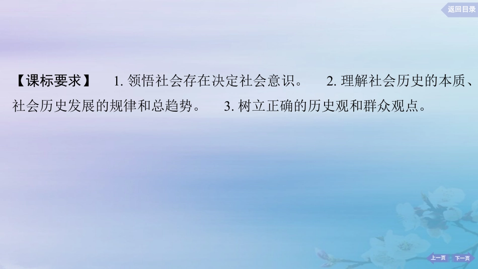 第五课寻觅社会的真谛下一页上一页返回目录【课标要求】1.领悟社会存在决定社会意识。2.理解社会历史的本质、社会历史发展的规律和总趋势。3.树立正确的历史观和群众观点。网络串联·自主学习01下一页上一页返回目录基本问题决定相对独立性曲折基本矛盾创造者人民主体核心突破·命题探源02下一页上一页返回目录核心点一社会历史的本质一、社会生活在本质上是实践的1.劳动是社会历史的起点(1)劳动创造了人,劳动推动了人类社会的产生和发展。(2)劳动发展史是理解所有社会历史奥秘的“钥匙”。下一页上一页返回目录2.人类历史是由人的社会实践活动构成的历史,研究人类历史的规律,也就是研究人的社会实践活动的运动规律。(1)全部社会生活在本质上是实践的,也就是把社会生活“当做实践去理解”。(2)实践生成了社会生活的全部领域,形成了全部社会关系,推动着人类社会的发展。下一页上一页返回目录二、社会存在与社会意识1.社会历史观的基本问题全部社会生活领域由社会存在与社会意识两部分构成。社会存在与社会意识的关系问题是历史观的基本问题,对社会存在与社会意识何者为第一性的不同回答,形成了历史唯物主义和历史唯心主义两种基本的历史观。下一页上一页返回目录2.社会存在与社会意识的含义、辩证关系、地位项目社会存在社会意识含义指社会的物质生活过程,主要指物质资料的生产方式指社会的精神生活过程辩证关系社会存在决定社会意识。有什么样的社会存在,就有什么样的社会意识,社会存在的变化、发展决定社会意识的变化、发展社会意识具有相对独立性。社会意识有时会落后于社会存在,有时又会先于社会存在而变化、发展;落后的社会意识对社会发展起阻碍作用,先进的社会意识对社会发展起积极的推动作用下一页上一页返回目录项目社会存在社会意识地位社会存在与社会意识的关系问题是物质与意识的关系问题在社会历史领域的体现。在社会存在与社会意识的辩证关系中,社会存在的决定作用是第一位的,社会意识的反作用是第二位的。历史唯物主义既反对抹杀社会意识反作用的形而上学机械论,又反对将这种反作用夸大的历史唯心主义下一页上一页返回目录【归纳提升】(1)社会存在与社会意识的关系下一页上一页返回目录(2)社会存在与社会意识、物质与意识的关系项目社会存在与社会意识物质与意识区别研究对象人社类会整世界个地位史唯物主史唯心主的基历义与历义本问题哲的基本学问题作用二者系的不同回答是分史对关划历唯物主和史唯心主的依据义历义分可知和不可知、划论论唯物主和唯心主义义联系社存在社意的系是物意的系会与会识关问题质与识关问题在社史域的体会历领现下一页上一页返回目录【易混比较】历史唯物主义与历史唯心主义的区别项目历史唯物主义历史唯心主义社会存在、社会意识何者是第一性(根本区别)社存在定社意,会决会识社意反作用于社会识会存在社意定社存在会识决会下一页上一页返回目录项目历史唯物主义历史唯心主义谁是历史的创造者人民群是史的造者。承众历创认杰出史人物在社展中的推历会发作用,但不能社展起动对会发决定作用大史人物的思想和意志是伟历社史展的定力量。人会历发决史是由大史人物造类历伟历创的人类社会有没有自身的规律社史域有着固有律,即会历领规生力生系、基产与产关经济础与上建筑的矛盾律层运动规人社是有律、不可捉类会没规摸的,社史是人意会历仅仅个志支配的偶然事件的堆积下一页上一页返回目录√考向1社会生活在本质上是实践的[典例1]漫画给我们的哲学启示是()①实践的效果受个体认识水平差异的限制,要紧跟别人的步伐②社会生活在本质上是实践的,应积极投身于社会实践实现人生价值③实践是认识的来源,要在对立统一中把握实践和认识的辩证关系④量变是质变的必要准备,应脚踏实地做好量的积累A.①②B.③④C.①③D.②④下一页上一页返回目录[解析]漫中文字强社生活在本上是的,投身于社画调会质实践应积极会人生价,要脚踏地做好量的累,实践实现值实积②④符合意;材料不涉题及的效果受体水平差的限制,且实践个认识异“要跟人的步伐紧别”表述不科,学①不;干未涉及是的源,选题实践认识来③不。选下一页上一页返回...