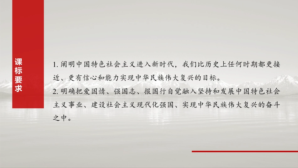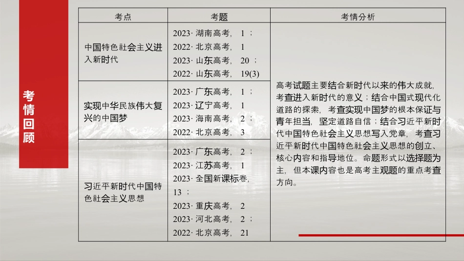 第四课只有坚持和发展中国特色社会主义才能实现中华民族伟大复兴1.阐明中国特色社会主义进入新时代,我们比历史上任何时期都更接近、更有信心和能力实现中华民族伟大复兴的目标。2.明确把爱国情、强国志、报国行自觉融入坚持和发展中国特色社会主义事业、建设社会主义现代化强国、实现中华民族伟大复兴的奋斗之中。课标要求考情回顾考点考题考情分析中特色社主国会义进入新代时2023·湖南高考,1;2022·北京高考,12023·山高考,东20;2022·山高考,东19(3)高考主要合新代以的大成就,试题结时来伟考入新代的意;合中式代化查进时义结国现道路的探索,考中的根本保查实现国梦证与年担,定道路自信;合近平新青当坚结习时代中特色社主思想入党章,考国会义写查习近平新代中特色社主思想的立、时国会义创核心容和指地位。命形式以内导题选择题为主,但本容也是高考主的重点考课内观题查方向。中民族大实现华伟复的中兴国梦2023·广高考,东1;2023·宁高考,辽12023·海南高考,2;2022·北京高考,3近平新代中特习时国色社主思想会义2023·广高考,东2;2023·江高考,苏12023·全新卷,国课标13;2023·重高考,庆22023·河北高考,2;2022·北京高考,21关键词:主要矛盾、伟大梦想、伟大斗争、伟大工程、伟大事业、十个明确、十四个坚持、十三个方面成就、马克思主义中国化时代化思维导图中特色社国主入会义进新代时只有坚持和发展中国特色社主会义才能实中现华民族伟大复兴地位(新的史方位历)、涵、重要意内义新代时主要矛盾涵:①内______________的美好生活需要和②______________的展之的矛盾发间:我仍于期于两个没变国处并将长处③_________________的基本情有,我国没变国是世界④_______________的国地际新代持和展中特色社主要时坚发国会义⑤_________人民日益增长不平衡不充分社主会义初段级阶一以之贯最大展中家发国中实现民族华大伟复的中兴国梦只有坚持和发展中国特色社主会义才能实中现华民族伟大复兴本:⑥质_________、民族振、⑦兴_________意、特点和要求义中国梦中国共产党的史历使命大想,必行⑧实现伟梦须进_________大想,必深入推党的建新的实现伟梦须进设⑨_________大想,必推中特色社主实现伟梦须进国会义⑩_________分步走建成社主两会义⑪___________目标家富强国人民幸福大斗伟争大工程伟大事伟业代化强现国近习平新代时中国特色社会主义思想只有坚持和发展中国特色社主会义才能实中现华民族伟大复兴新代持和展什的时坚发么样⑫__________________、持和展怎样坚发新代建什的时设么样⑬___________________、怎样建设新代建什的期政的时设么样长执⑭_______________、建怎样设代之时问十明确:是个⑮_____________的成部分组十四持:是个坚“路线图”和⑯“_______”十三方面成就个指导思想主要容内重要意义是代中克思主、当国马义⑰___________克思主马义是中文化和华⑱_________的代精时华了克思主实现马义⑲_____________新的飞跃必期持须长坚中特色社主国会义社主代化强会义现国克思主政党马义最核心为关键方法论二十一世纪中精神国中化代化国时新时代的主要矛盾与奋斗目标课时1中国特色社会主义进入新时代核心考点一课时精练实现中华民族伟大复兴的中国梦核心考点二内容索引><核心考点一中国特色社会主义进入新时代核心知识精讲1.新时代的科学内涵地位党的十八大以,中特色社主入了新代,是我展新来国会义进时这国发的史方位历涵内是承前后、往、在新的史件下取中特色社主启继开来历条继续夺国会大利的代义伟胜时(史脉历络),是全面建成小康社、而全面决胜会进建社主代化强的代设会义现国时(强目国标),是全各族人民国团结奋斗、不造美好生活、逐步全体人民共同富裕的代断创实现时(富民目标),是全体中女华儿勠力同心、力中民族大中奋实现华伟复兴国梦的代时(中国梦),是我不人作出更大的代国断为类贡献时(世界意义)意义①意味着近代以久磨的中民族迎了站起、富起来经难华来从来来到强起的大,迎了中民族大的光明前景来伟飞跃来实现华伟复兴(中民族对华)②意味着科社主在二十一世的中出强大生机活力,学会义纪国焕发在世界上高高起了中特色...