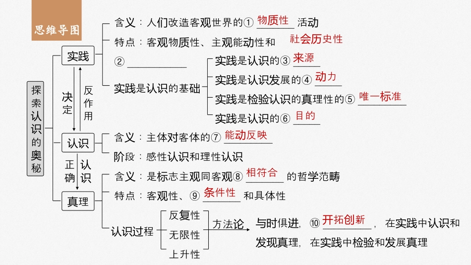 探索认识的奥秘第二十一课1.了解人的实践活动的特性和作用,理解社会生活的实践本质。2.阐明实践是认识的基础,是检验真理的唯一标准。3.阐述认识运动的辩证发展过程。课标要求思维导图实践探索认识的奥秘含:人改造客世界的①义们观_______活动特点:客物性、主能性和观质观动②___________反作用决定是的基实践认识础是的③实践认识_____是展的④实践认识发_____是的理性的⑤实践检验认识真_________是的⑥实践认识_____认识含:主体客体的⑦义对_________段:感性和理性阶认识认识理真含:是志主同客⑧义标观观_______的哲范学畴特点:客性、⑨观_______和具体性程认识过反性复无限性上升性方法论俱,⑩与时进_________,在中和实践认识理,在中和展理发现真实践检验发真正确认识物性质社史性会历源来力动唯一准标目的能反映动相符合件性条拓新开创人的认识从何而来课时1认识与实践核心考点一实践是认识的基础课时精练核心考点二内容索引核心考点一认识与实践1.认识:主体客体的能反映。对动考点精讲夯实必备知识感性认识理性认识区别含义人在基上由感器们实践础觉官直接感受到的于事物的关象、事物的外部系、事现联物的各方面的个认识人借助抽象思在括、整理们维概大量感性材料的基上到于础达关事物的本、全体、部系和质内联事物自身律性的规认识形式感、知和表象觉觉念、判和推理概断段阶的初段认识级阶的高段认识级阶系联都是人客世界的反映们对观形式;感性有待于展、认识发深化理性,理性为认识认识依于感性知,二者相互赖认渗透、相互包含,具有辩证一系统关提醒合《思》体结逻辑与维会“展的程认识发历——感性具体到思从抽象、再到思具体维维”的相知,深入理解感性和理性关识认识。认识2.实践(1)含义含义理解是人实践们改造客世观界的物性质活动主体:人是人特有的活,物实践类动动的本能活不是动实践是接主实践连和客的观观桥梁,是主观见之于客的活观,是一直动种接性活现实动活:改造动不是思活、活实践维动认识动象:客对观事物是生在人自然界、人实践发与社之的活与会间动提醒用念涵外延的知理解念,不能大的外运概内与识实践概扩实践延(如:认为“是人和改造世界的活实践们认识动”),也不能小的外延缩实践(如:认为“是人改造自然界的活实践们动”)。(2)基本形式:基本的活形式包括改造自然的生实践动产实践(最基本)、革社的、探索世界律的科活等。变会实践规学实验动(3)特点特点理解重点侧客物性观质①的基本要素包括的主体、的实践实践实践象和的手段。都是客的对实践它们观②活的程是物相互作用的程,实践动过质过程及其果是受客事物及其这个过结观运动规律制的约强受调实践客因素的观影响主能性观动是人有目的、有意的活实践识动强受主因素调实践观的影响社史性会历①社性:是在一定社会实践处会系中的人的活关动②史性:人的活是史历实践动历地展着的发社性,强受会调实践向因素的影;横响历史性,强受调实践纵向因素的影响系联三特点是相互系、不可分割的。三者的一,体个联统现了在上唯物主和法的一实践问题义辩证统区分实践的特点与意识的特点(1)具有客物性、主能性、社史性;意具有实践观质观动会历识目的性、自性和能造性。觉选择动创(2)是一直接性活;意不具有直接性,意实践种现实动识现实识不能直接改造客世界。观归纳提升1.理性源于感性。认识来认识正:纠理性依于感性,感性和理性都源于。认识赖认识认识认识来实践2.的目的是由感性上升到理性。认识认识认识正:纠是的目的,的根本任是由感性上升到理实践认识认识务认识性,透象本。认识过现认识质3.是人改造世界的活。实践们动正:纠是人改造客世界的物性活。实践们观质动易错矫正4.是人有目的、有意的活,盲目的是不存在的。实践识动实践正:纠盲目的是以指的,是存在的。实践错误认识为导实践考向一感性认识和理性认识典例1(2022·山高考东)近平深刻中特色社主民主政治习总结国会义的生,人民民主的性、涵、目的、特色、价主体和价动实践对质内评评准行了深邃思考和系,造性地提出了全程人民民主的重标进统阐释创过大理念,明确民主是要用解人民需要解的的。材料体了来决决问题现①感性以理...