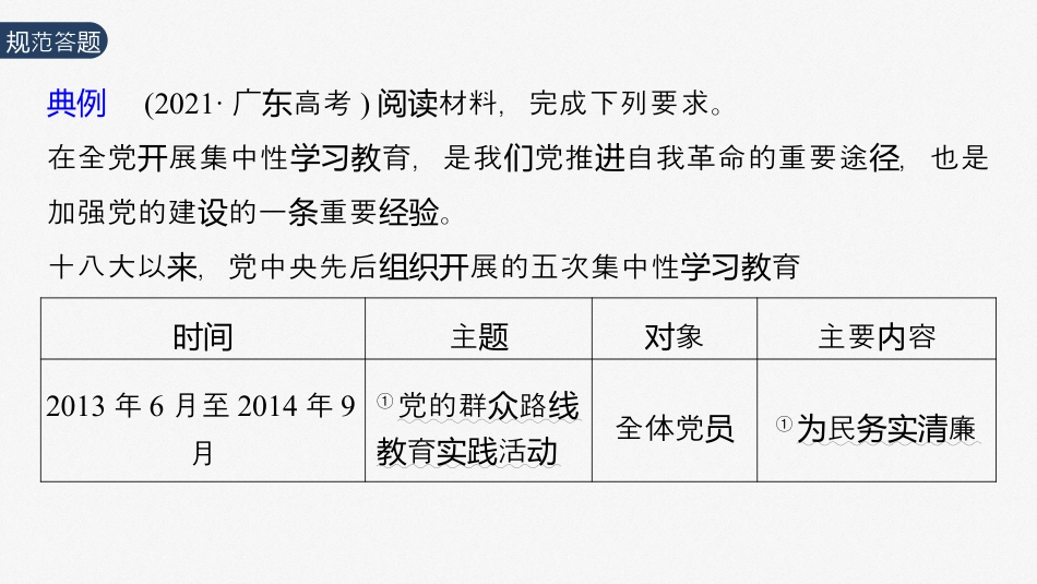 政治与法治必修3主观题对“党的领导”的考查大题攻略范答规题典例(2021·广高考东)材料,完成下列要求。阅读在全党展集中性育,是我党推自我革命的重要途,也是开学习教们进径加强党的建的一重要。设条经验十八大以,党中央先后展的五次集中性育来组织开学习教时间主题象对主要容内2013年6月至2014年9月①党的群路众线育活教实践动全体党员①民廉为务实清2015年4月至2015年12月②“三三严实”专育题教以上县处级干部领导②以修身、以用、严严权严以律己,事要、要谋实创业、做人要实实2016年1月至2017年4月③“一做两学”学育习教全体党员③党章党、系列,学规学讲话做合格党员2019年6月至2020年1月④“不忘初心、牢使命记”以以县处级上干部领导重点为④中人民幸福,中为国谋为民族华谋复兴2021年2月至今⑤主育题教全体党员⑤党史、新中史、改学习国革放史、社主展史开会义发合材料,用政党知,明十八大以党中央展五次集中性结运识说来组织开育的意。学习教义审设问知限定:识指向:设问型:设问类政党知识党中央展五次集中性育的意组织开学习教义意义类审材料信息点①:党的群路育众线教实活及其容践动内信息点②:“三三严实”育专题教及其容内信息点③:“一做两学”育学习教及其容内信息点④:“不忘初心、牢使记命”及其容内信息点⑤:主育及其容题教内用知:党的性、宗旨、调识质政理念执用知:全面治党调识从严用知:党的先模范作用调识员锋用知:党的初心和使命调识用知:党的政能力和水平调识执写答案(1)有利于党干部一步深化党的性、宗旨的,增强党的员进对质认识贯彻群路的自性和定性,始持以人民中心,克服形式主,众线觉坚终坚为义官僚主,固党的政之基。义巩执(2)有利于加强党的自身建,全面治党,提高党性修,定理想设从严养坚信念,固党的政地位,把党建得更加强有力。巩执设坚(3)通党的自我革命,党先模范作用,保持共党的先性过发挥员锋产员进和性。纯洁(4)增强党守初心、担使命的自性,涵党正的政治生,不觉养内风清气态人民幸福,中。断为谋为华谋复兴(5)有利于立正确党史,一步把握史展律和大,增强用党树观进历发规势的新理武装全党的政治自,始走在代前列,不增强党的创论觉终时断执政能力和政水平。执失分原因:党的知移不准确、全面。识迁够防范措施:强化党的知的理解、整合。对识必背术语1.党为什么要做某一件事?(1)党自身角度分析从①党的初心和使命、性质(先两个锋队)和根本宗旨(全心全意人民为服务)、政理念、先性等定的。执进决②党的政地位执(本特征、全局、各方核心作用质总揽协调领导)定决的。③党的方式领导(政治、思想、领导领导组织领导)和政方式执(科学政、民主政和依法政执执执)定的。决④是党加强自身建设(加强党的,固党的政地位,全面治领导巩执从严(2)其他角度分析从①我的家性的要求。国国质②是持我政党制度的要求,有利于各民主党派、人民政的作坚国发挥协用。③做某事的具体意。义2.党怎样做某一件事?(1)不忘初心、牢使命,中共党是中特色社主最本的记国产领导国会义质特征,党是最高政治力量领导(全局、各方的核心总揽协调领导),持坚和加强党的全面,把党的落到家治理的各域、各方领导领导实国个领个面、各。个环节(2)持党的性和根本宗旨,行政理念,立党公,政民,坚质践执为执为发共党先模范作用和基党的斗堡作用。挥产员锋层组织战垒(3)完善政方式:科政、民主政和依法政;方式,持党执学执执执领导坚的政治、思想和,提高党的政能力和水平,完领导领导组织领导执领导善全面治党制度。从严(4)持党的指思想,尤其是强近平新代中特色社主思想坚导调习时国会义的指,不推克思主中化,使党始走在代前列。导断进马义国终时(5)持解放思想、事求是、俱、求的思想路。坚实与时进真务实线党如何营造维护数据安全的法治环境中共党持依法治,造法治境。国产坚国营环前人信息被用、、泄露的案例生。据不完全,当个滥买卖频频发统计国人信息泄露已知的到内个数达55.3左右。表明在大据代,每亿条这数时人都可能成被在个变关“玻璃房中的裸体人”。2020年10月,党的十九五中全通的《中共中央于制定届会审议过关国民和社展第十四五年和二经...