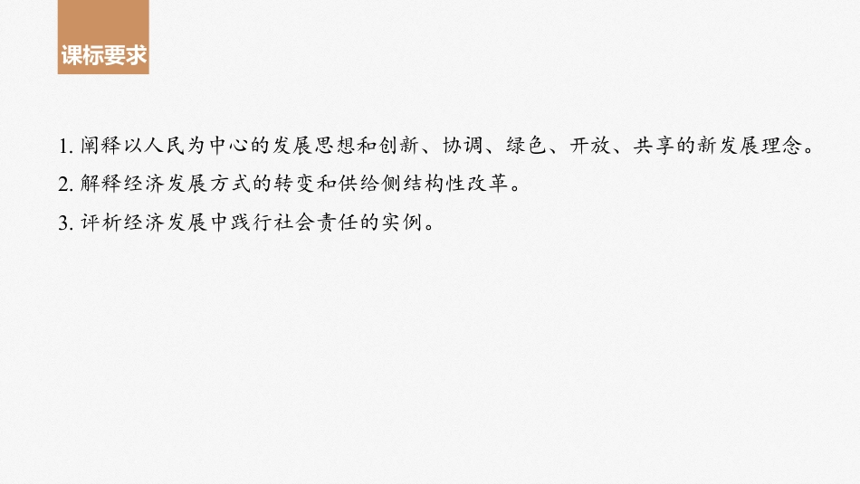 我国的经济发展第七课1.阐释以人民为中心的发展思想和创新、协调、绿色、开放、共享的新发展理念。2.解释经济发展方式的转变和供给侧结构性改革。3.评析经济发展中践行社会责任的实例。课标要求思维导图坚持新发展理念我国的经济发展涵:展了人民、展依靠人民、展成果由人民共享内发为发发指导建设现代化经体系济以人民中心为的展思想发新贯彻发展理念要求人民群的根本利益出展、促展从众发谋发发把人民作展的力量源泉为发展成果惠及①发__________体现必要性:②_____是行的先,新代需要新展理念动导时发基本容内新创→解展③决发_____问题协调→解展④决发_______问题色绿→解人自然和共生决与谐问题放开→解展外⑤决发内_____问题共享→解社⑥决会_________问题相互系:相互通、相互促关贯进全体人民理念力动不平衡联动公平正义我国的经济发展必要性:展方式、化⑦转变经济发优_________、转换经济增力的迫切要求长动科涵:由社活各、⑧学内会经济动个环节________、各个领域的相互系和在系成的一有机整关内联构个体相互系:一整体、要一体建、一体推关统设进建设现代化经济体系建代化设现体系经济推高动经济量展质发建⑨设_________、同展的体系协发产业建彰、⑩设显优势_________的城域展体系乡区发建更高水平⑪设_______新体制经济经济结构各面个层新引创领协调联动放型开坚持新发展理念课时1以人民为中心的发展思想核心考点一贯彻新发展理念课时精练核心考点二内容索引核心考点一以人民为中心的发展思想1.以人民为中心的发展思想的含义:持以人民中心的展思想,就坚为发是把人民幸福作展的目的和宿,做到展了人民、展依实现为发归发为发靠人民、展成果由人民共享。发考点精讲夯实必备知识2.以人民为中心的发展思想的基本内涵和具体要求角度具体要求重点侧展发为了人民要人民群的根本利益出展、促展,不从众发谋发发断足人民美好生活的需要,努力促人的全面展满对进发展的目的发(出点发)展依发靠人民要把人民作展的力量源泉,充分尊重人民主体地为发位和人民群的首精神,不人民群中汲取智众创断从众慧和力量,依靠人民造史创历伟业展的力发动(力点动)展成发果由人民共享要使展成果惠及全体人民,不保障和改善民生、发断增人民福祉,走共同富裕道路,彰制度进显优势展的向发趋(落脚点)提醒展了人民,体了中共党全心全意人民服的根本发为现国产为务宗旨;展依靠人民,体了人民是史的造者、是推发现历创动发展的根本力量的唯物史;展成果由人民共享,体了观发现实现共同富裕的根本目,彰了社主制度。标显会义优势3.以人民为中心的发展思想的重要意义:以人民中心的展思想,反为发映了持人民主体地位的在要求,彰了人民至上的价取向,确立坚内显值了新展理念必始持的基本原。发须终坚则多模块理解坚持以人民为中心的发展思想(1)《中特色社主》:克思主是人民的理;中国会义马义论国梦是人民的,也同世界人民的息息相;明确新代我社梦梦关时国的主要矛盾是人民日益增的美好生活需要和不平衡不充分会长的展之的矛盾,必持以人民中心的展思想。发间须坚为发(2)《政治法治》:人民立是中共党的根本立;展与场国产场发全程人民民主;全面依法治要持人民主体地位。过国坚归纳提升(3)《哲文化》:人民群是社史的主体,要持群学与众会历坚众点和群路;做出正确的价判和价要自站在观众线值断值选择觉最广大人民的立上;文化展的基本路之一是要持以人场发径坚民中心。为归纳提升1.持以人民中心的展思想,就要把增加人民的收入作展的目坚为发为发的和宿。归正:纠持以人民中心的展思想,就是把人民幸福作坚为发实现为发展的目的和宿。归2.持以人民中心的展思想,只是要做到展了人民。坚为发发为正:纠持以人民中心的展思想,要做到展了人民、展坚为发发为发依靠人民、展成果由人民共享。发易错矫正3.持以人民中心的展思想,就要保障人民群的各益。坚为发众项权正:纠持以人民中心的展思想,就要保障人民群的各合坚为发众项法益。权4.新展理念确立了以人民中心的展思想必始持的基本原。发为发须终坚则正:纠以人民中心的展思想,确立了新展理念必始持为发发须终坚的基本原。则考向一坚持以人...