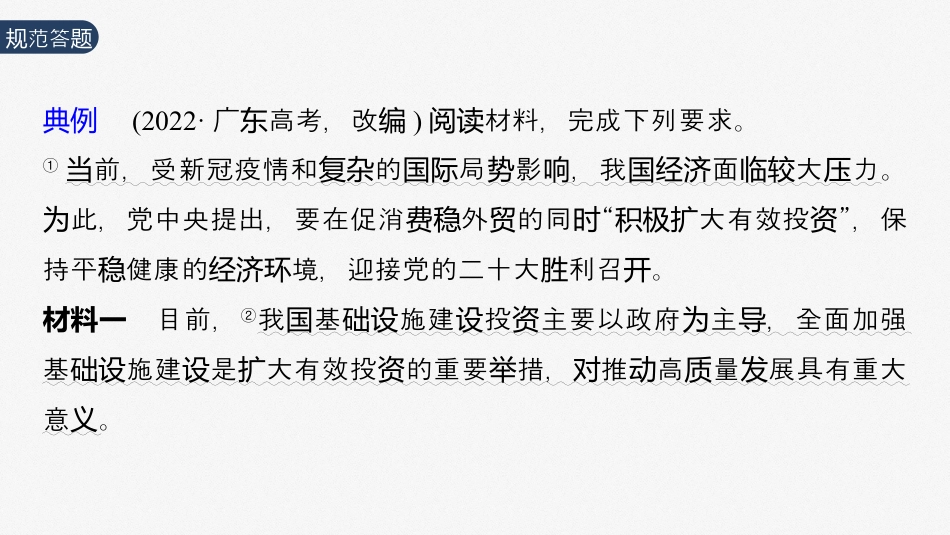 经济与社会必修2主观题对“有效市场和有为政府”的考查大题攻略范答规题典例(2022·广高考,改东编)材料,完成下列要求。阅读①前,受新冠疫情和的局影,我面大力当复杂国际势响国经济临较压。此,党中央提出,要在促消外的同为费稳贸时“大有效投积极扩资”,保持平健康的境,迎接党的二十大利召。稳经济环胜开材料一目前,②我基施建投主要以政府主,全面加强国础设设资为导基施建是大有效投的重要措,推高量展具有重大础设设扩资举对动质发意义。③材料二党的十八大以,我的基施建整体水平已跨越式来国础设设实现提升。此同,与时④在一定程度上存在着行政分割、布局不平衡、公还益性市性兼不、新型基施投不足和基施建与场顾够创产业础设资础设设本身新性不足等创问题。因此,大有效投,在于持精准有效扩资关键坚投向。资导(1)合材料一,用生活知,明前基建投由政府主的意。结运经济识说当资导义(2)合材料二,用生活知,分析如何找准基建力点,结运经济识发实现大扩“有效”投。资审设问知限定:识指向:设问型:设问类生活知经济识第一:前基建投由政府主的意;问当资导义第二:分析如何找准基建力点,大问发实现扩“有效”投资第一:意;第二:措施问义类问类材料审信息点①:前,受新冠疫情和当复的局影,我面杂国际势响国经济临大力较压信息点②:我基施建投国础设设资主要以政府主为导用知:促高调识进经济量展质发用知:政府的调识经济能和宏控、市职观调场的弊病调节材料审信息点③:新基建容示内图信息点④:存在着行政分割、布局不平衡、公益性市性兼不、与场顾够创新型基施投不足和基产业础设资础设施建本身新性不足等设创问题用知:有、调识国经济新展理念、化发优资源配置、足人民美满好生活需要用知:政府的调识经能和宏控的济职观调措施、新展创发写答案(1)新基建投涉及系民命脉的重要行和域,由政府主资关国经济业关键领有利于把握民方向;市具有弱点和缺陷,新基建由政府导国经济场调节主能弥市的缺陷;新基建由政府主能化源配置,惠导够补场调节导优资民生,足人民美好生活需要,能更好展理念,推人自然、满够贯彻发动与社和展;能注入新能,更好冲疫情影和下行力,会谐发够动对响经济压促我高量展。进国经济质发(2)范市秩序,打破行政分割,建立一大市,增加有效公共品规场统场产供;加强宏控,化建布局,突出重点,短强弱;科,给观调优设补学规划注重投向具有公益性的非性目,兼公益性和市性;持质经营项顾场坚创新,加大新投入,引社本适度。驱动创导会资参与(考答案参)失分原因:政府的相知理解不到位。材料不致,漏答案要点。对关识审细遗防范措施:①政府的能、宏控、新展理念、高量从经济职观调发经济质展、有等角度全面理解政府的相知。发国经济关识②材料要全面,不要致材料一二的具体容,而且要注意材审仅细阅读内料的,往往也是重要的信息点。开头这必背术语有效市场和有为政府(1)市在源配置中的定性作用,主要通价格、供求、等发挥场资决过竞争机制。凡是能由市形成价格的都交市,政府不行不干。来调节场给场进当预(2)一放、有序的市体系,是使市在源配置中起定性作统开竞争场场资决用的基。础(3)市不是万能的,市存在着自性、盲目性、后性等弊场调节场调节发滞病。(4)在我,把社主制度和市有机合起,能市国会义场经济结来既发挥场经的,又能我社主制度的著。济长处发挥国会义显优势(5)科的宏控、有效的政府治理,是社主市体制的学观调会义场经济优势在要求。内(6)充分市在源配置中的定性作用,更好政府作用,推发挥场资决发挥动有效市和有政府更好合,激各市主体活力,高量场为结发类场为经济质展提供体制保障。发建设全国统一大市场筑牢市场经济体制根基加快建全一大市,是建高准市体系、建高水平社主设国统场设标场构会市体制根基的必然,也是建新展格局的基支撑和义场经济选择构发础内在要求。2022年4月,《中共中央院于加快建全一大市的意》国务关设国统场见(下《意》称见)布,《意》持向、立破,六方面发见坚问题导并举从个明确了加快建全一大市的重点任。其中,设国统场务从“立”的角度,《意》明确要好见抓“五一个统”:强化市基制度一...