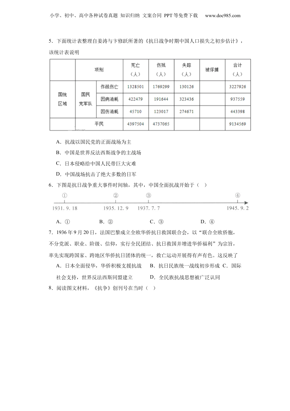 小学、初中、高中各种试卷真题知识归纳文案合同PPT等免费下载www.doc985.com从局部抗战到全国抗战-2023-2024学年高三历史二轮(专题训练)1.1940年10月1日,日本内阁制定的《国土计划设定纲要》中提出日本本土着重发展军事工业、机械工业和精密机器工业;中国东北着重发展电气工业、矿业和部分机械及轻工业;在中国华北,注重制盐和矿业的开发;华中允许某种限度的轻工业发展;内蒙古以发展羊毛业为主,华北发展棉花,华中则要限制生产可与日本农作物竞争的农产品。其目的是A.强化中日地区间的经济合作物资交流B.有步骤的在占领区推进工业化的进程C.以日本的本土经济带动东亚经济发展D.将占领区经济纳入日本经济体系2.1894年,《点石斋画报》刊登了描绘甲午海战的时事画。1931年末,上海《良友》画报重刊此画并配文写道:“国难日亟,甲午惨剧重现目前……国人当如何造成光荣之历史,供后世读史者之回忆乎!”《良友》此举意在A.以史为鉴呼吁和平B.借助时事鼓动变革C.抵制战争避免惨剧D.激励民众共御外侮3.下图为1941年在南京成立的中央储备银行发行的中储券。该券可与法币进行兑换,曾在华东、华中和华南等汪伪统治区大量流通。该券发行的目的是A.封锁敌后根据地的经济B.掠夺沦陷区的物资财富C.加强国统区的经济统制D.扰乱解放区的金融秩序4.《远东国际军事法庭判决书》中写道:“好些中国士兵在城外放下武器投降了。在他们招降的七十二小时内,在长江江岸被扫射而集体的被屠杀了。”这个事件发生的地点,最可能的是A.旅顺B.北平C.南京D.重庆小学、初中、高中各种试卷真题知识归纳文案合同PPT等免费下载www.doc985.com5.下面统计表整理自姜涛与卞修跃所著的《抗日战争时期中国人口损失之初步估计》,该统计表说明A.抗战以国民党的正面战场为主B.中国是世界反法西斯战争的主战场C.日本侵略给中国人民带巨大灾难D.中国战场抗击了绝大多数的日军6.下图是抗日战争重大事件时间轴,其中,中国全面抗战开始于()A.①B.②C.③D.④7.1936年9月20日,法国巴黎成立全欧华侨抗日救国联合会,以“联合全欧侨胞,不分党派、职业、阶级、信仰,实行全民团结、抗日救国并增进华侨福利”为宗旨,率先实现跨国家、跨地区华侨抗日团体的统一,救亡运动开展得有声有色。这反映了A.日本全面侵华,华侨积极支援抗战B.抗日民族统一战线初步形成C.国际社会支持,世界反法西斯同盟建立D.全民族抗战思想被广泛认同8.阅读图文材料,《抗争》创刊号在当时()小学、初中、高中各种试卷真题知识归纳文案合同PPT等免费下载www.doc985.comA.支持国联“全体一致”原则B.反对国民政府不抵抗政策C.号召建立抗日民族统一战线D.声援频淞沪会战保卫上海9.1936年,国民政府国防计划大纲将四川定为作战总根据地,将长江以南的南京、南昌、武昌及长江以北的太原、郑州、洛阳、西安定为作战根据地。这反映了国民政府A.加强对国内各要地的控制B.推行“攘外必先安内”政策C.全力封锁农村革命根据地D.开始筹划对日持久作战战略10.1935年12月,中共中央在陕北瓦窑堡召开政治局会议,对工商业政策作出新的规定:“要用比过去宽大的政策对待民族工商业资本家,在双方有利的条件下,欢迎他们到苏维埃人民共和国领土内投资,开设工厂与商店,保护他们生命财产之安全,尽可能的降低租税条件,以发展中国的经济。”中共改变工商业政策主要基于A.中国民主革命性质开始改变B.国内形势和主要矛盾的变化C.巩固扩大抗日民族统一战线D.发展抗日根据地经济的需求11.2021年12月13日是第八个南京大屠杀死难者国家公祭日。以下是《南京大屠杀死难者国家公祭日铭文》节选:“卅万亡灵,饮恨江城。日月惨淡,寰宇震惊。兽行暴虐,旷世未闻。同胞何辜,国难正殷。哀兵奋起,金戈鼍鼓。兄弟同心,共御外侮。小学、初中、高中各种试卷真题知识归纳文案合同PPT等免费下载www.doc985.com捐躯洒血,浩气干云。尽扫狼烟,重振乾坤。……永矢弗谖,祈愿和平。中华圆梦,民族复兴。”这段话反映了中国人的(________)诉求A.反帝反封,彻底革命B.国共合作,消除宿怨C.反对侵略,珍爱和平D.中日和...