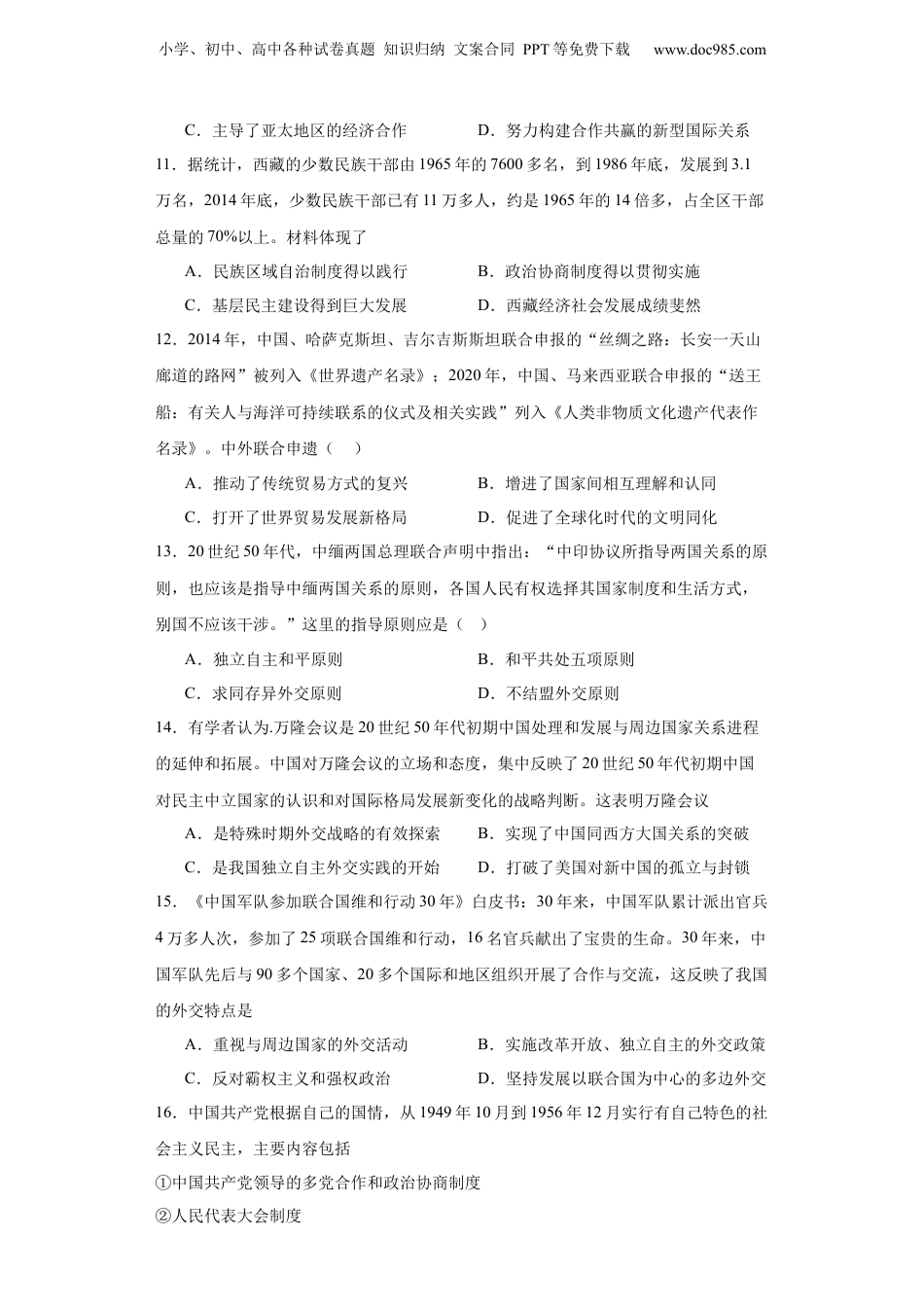 小学、初中、高中各种试卷真题知识归纳文案合同PPT等免费下载www.doc985.com当代中国的民族政策和外交-2023-2024学年高三历史二轮(专题训练)1.1947年5月1日,内蒙古自治政府成立,为解决中国民族管理问题提供了实践经验。新中国成立后在此基础上形成的基本政治制度是()A.民族区域自治制度B.政治协商制度C.人民代表大会制度D.基层群众自治制度2.创刊于1958年的《北京周报》,致力于向国外报道中国的政治、经济等发展情况。当时印度、印尼等第三世界国家以及美国、加拿大等西方国家领导人都将其作为了解中国的重要渠道。该报的创刊()A.消除了国家意识形态的差异B.促进了中外之间的文化交流C.冲破了西方国家的外交孤立D.践行了万隆会议的核心精神3.20世纪50年代,中国提出和平共处五项原则,参加日内瓦会议和万隆会议并取得成功。这些成就A.消除了意识形态对外交的影响B.体现了外交政策的独立自主精神C.实现了不结盟外交的政策转变D.反映了中美关系从对抗走向缓和4.1950年,中国相继同丹麦、瑞士等西方国家建交。1952年,亚太和会在北京隆重举行,亚太地区的37个国家的378名代表出席了会议。这表明,20世纪50年代初中国()A.打破了美国的封锁政策B.坚持和平共处五项原则C.外交重点转向周边国家D.积极拓展对外交往空间5.1954年7月,毛泽东在全国政协常委会扩大会议上对中国外交及有关工作提出了11条建议,其中包括争取与英、法改善关系、建立邦交:争取与美国政府改善某些关系:团结一切愿意和平的力量(包括政府在内)、孤立和分化美国等。毛泽东的讲话表明A.出席日内瓦会议促进中国外交政策调整B.中国外交适应世界政治格局多极化趋势C.中国外交开始超越社会制度和意识形态D.中国外交冲破了美国的孤立和封锁政策6.如表中国科学院与外国交换书籍、期刊数量统计表(单位:册/件/篇),如表可以用来说明当时小学、初中、高中各种试卷真题知识归纳文案合同PPT等免费下载www.doc985.comA.外交战略的重大调整B.科教兴国战略的实施C.中国外交环境的改善D.科技管理体制的变革7.外交话语是外交工作中使用的口头语言和书面语言,十八大以来党中央在对外工作上进行了一系列的重大理论和实践创新,形成了新世纪新的外交话语,如“和谐世界”“人类命运共同体”“一带一路”“和而不同”等,据此可知我国外交()A.放弃了不结盟的和平外交政策B.受冷战国际局势的影响明显C.发展联合国为中心的多边外交D.对于人类文明多样性的尊重8.下图是1953年版人民币10元券背面图样。图样的设计理念体现了:①民族团结原则②确立民族区域自治制度③民族平等原则④尊重少数民族文化A.①②③B.①②④C.①③④D.②③④9.1954年,新中国在日内瓦亮相,为印度支那问题的和平解决提出建设性建议;1955年,中国代表团在万隆发出"求同存异"的呼声;2017年,习近平主席在日内瓦发表主旨演讲,提出"共同构建人类命运共同体"的新型国际关系理念。这说明A.中国逐渐成为国际政治舞台的领导者B.综合国力决定外交话语权C.新中国坚持独立自主的和平外交政策D.和平外交符合各国共同利益10.十八大以来中国实施了共建“一带一路”倡议,发起创办亚洲基础设施投资银行,举办了二十国集团领导人杭州峰会、金砖国家领导人厦门会晤、亚信峰会,倡导构建人类命运共同体,促进全球治理体系变革。这表明当今中国()A.致力于加强与周边邻国合作B.极力加强与发展中国家的全面合作小学、初中、高中各种试卷真题知识归纳文案合同PPT等免费下载www.doc985.comC.主导了亚太地区的经济合作D.努力构建合作共赢的新型国际关系11.据统计,西藏的少数民族干部由1965年的7600多名,到1986年底,发展到3.1万名,2014年底,少数民族干部已有11万多人,约是1965年的14倍多,占全区干部总量的70%以上。材料体现了A.民族区域自治制度得以践行B.政治协商制度得以贯彻实施C.基层民主建设得到巨大发展D.西藏经济社会发展成绩斐然12.2014年,中国、哈萨克斯坦、吉尔吉斯斯坦联合申报的“丝绸之路:长安一天山廊道的路网”被列入《世界遗产名录》;2020年,中国、马来西亚联合申报的“送王船:有关...
