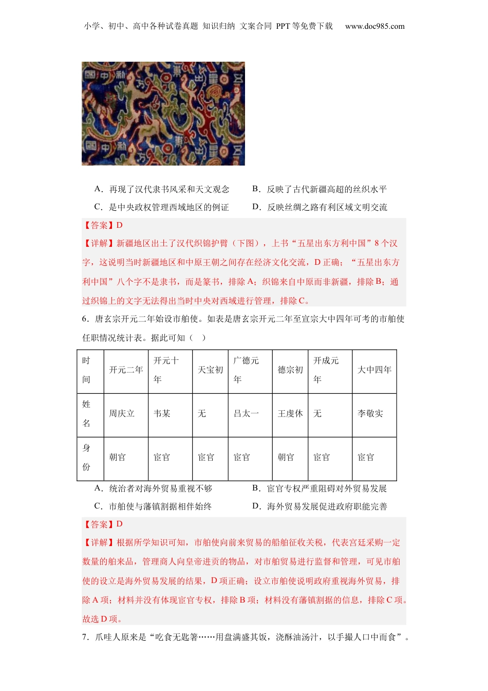 小学、初中、高中各种试卷真题知识归纳文案合同PPT等免费下载www.doc985.com古代的商业贸易-2023-2024学年高三历史二轮(专题训练)1.宋代在州、府及军的治所基本都设置了都商税务或者都税务。除了州、府的附郭县以外,县治一般都设有税务或税场。在县以下的“小都市”、小聚落中,很多也设有税务或税场。这些务、场设有监官。这些举措()A.说明商税成为第一税源B.表明商人的政治地位得到提高C.反映出坊市制度被打破D.意图规范商业活动和保证税收【答案】D【详解】本题是多类型单项选择题。据本题次题干的提示词,可知这是目的、本质题。据本题时间信息可知准确时空是:宋代(中国)。从材料中可以看出宋代在城市的商业场所和农村草市基本都设置了专门官员管理,这说明政府意在通过这些措施规范商业行为和保证税收,D项正确;材料没有涉及具体的税收数据及与其他税项的比较,排除A项;材料体现的是政府对商业的管理,与商人的政治地位提高关系不大,排除B项;材料强调的是政府设置专门官员管理商业及税收,不是坊市制度,排除C项。故选D项。2.西汉元始五年,高都里人朱凌在制定家庭土地变动契约文书时,请县、乡三老等,“为先令券书”,同时还邀请了乡间名望人士及亲属共同见证。这说明当时()A.政府禁止民间的土地交易B.契约文受制于政府抑商政策C.民间私有财产权观念强化D.基层组织开创集体议事的模式【答案】C【详解】根据材料“西汉元始五年,高都里人朱凌在制定家庭土地变动契约文书时,请县、乡三老等,‘为先令券书’,同时还邀请了乡间名望人士及亲属共同见证。”可知,体现了西汉时期通过制定契约明确家庭土地变动的归属,并且重视乡间名望人士及亲属的共同见证,说明西汉时期民间私有财产观念得到强化,C项正确;政府禁止民间的土地交易,表述有误,古代封建土地私有制下,允许土地的买卖,排除A项;材料体现不出契约文受制于政府抑商政策的信息,排除B项;材料无法直接得出基层组织开创集体议事的模式,不符合题意,排除D项。故选C项。3.唐代,海上贸易货物中日常生活用品和生产用品大量增多。输入的货物除了象、犀牛,古贝(棉布)等外,西方人士还把波斯工艺,伊斯兰教和阿拉伯的星历、医药传入我国。出口的除丝织品外,还有大量的瓷器以及茶叶、铜镜、文具、书籍等。由此可知,唐代海上贸易()A.丰富了中外的物质生活和精神生活小学、初中、高中各种试卷真题知识归纳文案合同PPT等免费下载www.doc985.comB.受到政府的严格限制C.推动了中西方民间海外贸易的兴盛D.以追求政治目的为主【答案】A【详解】根据材料可知,唐代中西海上贸易既有日常生活生产用品,也包括一些科学技术知识等文化交流,丰富了中外之间的物质和精神生活,A项正确;材料未涉及唐朝政府对海上贸易的严格限制,排除B项;C项是材料的表现,而不是唐代海上贸易兴盛的影响,并且题目也没有点明这是民间海外贸易,排除C项;材料未涉及海上贸易是政治目的为主,明朝时期郑和下西洋是以政治目的为主,排除D项。故选A项。4.我国古代对外来农作物的命名不断发生变化,秦汉至唐宋的外来农作物名称是胡萝卜、胡荽(香菜)、胡椒,唐宋至明清的名称是番薯、番茄、番豆(花生),清朝以后是洋芋、洋葱、洋白菜。这种命名演变的主要原因是()A.自然经济不断解体B.天下观念不断进步C.贸易体系逐步转换D.朝贡关系强弱变化【答案】C【详解】本题是单类型单项选择题。据本题主题干的设问词,可知这是原因题。据本题时间信息可知准确时空是:秦汉、唐宋、明清、清朝以后(中国)。根据题干秦汉到唐宋外来农作物一般被命名为胡,唐宋至明清时期的名称为番,清朝以后为洋,这与中国与西域、中亚地区相对平等的贸易到传统宗藩体制下的朝贡贸易到伴随着西方对中国的侵略新的物种传入中国有关,体现的是贸易体系的逐步转换,C项正确;自然经济开始解体的时间是鸦片战争以后,与题干中秦汉至唐宋、唐宋至明清时期的命名时间不符,排除A项;中国自秦汉至明清天下观念一直都是中国是天下之中,排除B项;秦汉时期与中亚地区的交流及清朝以后的对外交流都不是朝贡贸易,排除D项。故选C项。5.1995年10月...