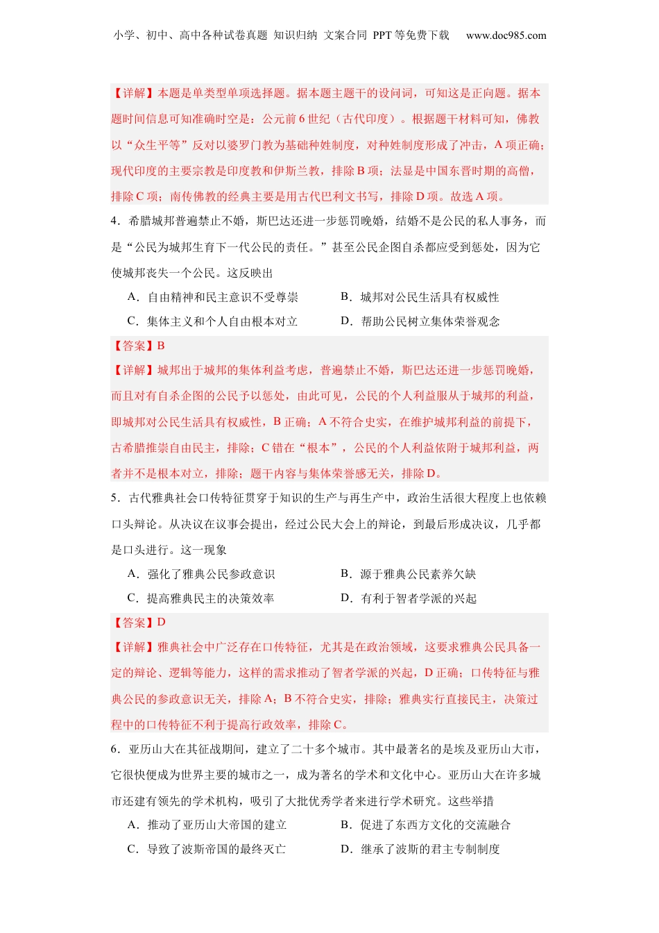小学、初中、高中各种试卷真题知识归纳文案合同PPT等免费下载www.doc985.com古代文明的产生与早期发展-2023-2024学年高三历史二轮(专题训练)1.公元前410年,雅典通过德莫梵图斯(Demophantos)法令,规定所有雅典人应该发誓:“用言辞、行动和选票,以及我的手——如果我力所能及——杀死任何推翻民主制的人……自立为僭主或者协助建立僭政的人。”这一法令()A.强化了公民身份B.维护了民主政治C.反映了雅典民主的局限性D.体现了当时法律的原始性【答案】B【详解】本题是多类型单项选择题。据本题次题干的关键词,可知这是影响题、本质题。据本题时间信息可知准确时空是:公元前410年(雅典)。根据材料,公元前410年的雅典法令鼓励雅典人“杀死……僭主或者协助建立僭政的人”,结合所学知识可知,僭主政治是对民主政治的破坏,这一法令维护了民主政治,B项正确;材料与公民身份无关,排除A项;雅典民主的局限性主要体现在是少数人的民主,与材料内容无关,排除C项;材料旨在维护雅典的民主政治,与法律的原始性关系不大,排除D项。故选B项。2.当你漫步法国卢浮宫时,解说员指着一根黑色的石柱说:“这是现存世界上最早的比较完备的成文法典。”该法典诞生在()A.尼罗河流域B.两河流域C.印度河流域D.黄河流域【答案】B【详解】两河流域的古巴比伦国王汉谟拉比制定了《汉谟拉比法典》,它是世界上现存的第一部比较完备的成文法典,故答案为B;ACD不符合题意,排除。【点睛】本题考查《汉谟拉比法典》的相关知识。知道其意义。3.佛教诞生于公元前6世纪的古代印度,不仅对古印度产生深远的影响,它还向西传播到希腊化世界,向南传播到东南亚,向北传播到中亚并沿着商路传到中国,进而传到朝鲜和日本。下列关于佛教及其传播的内容叙述正确的是()A.佛教主张“众生平等”,对种姓制度形成冲击B.佛教和印度教是现代印度的主要宗教C.唐朝的高僧玄奘和法显前往天竺求取佛经D.南传佛教的经典主要是用印度梵文书写【答案】A小学、初中、高中各种试卷真题知识归纳文案合同PPT等免费下载www.doc985.com【详解】本题是单类型单项选择题。据本题主题干的设问词,可知这是正向题。据本题时间信息可知准确时空是:公元前6世纪(古代印度)。根据题干材料可知,佛教以“众生平等”反对以婆罗门教为基础种姓制度,对种姓制度形成了冲击,A项正确;现代印度的主要宗教是印度教和伊斯兰教,排除B项;法显是中国东晋时期的高僧,排除C项;南传佛教的经典主要是用古代巴利文书写,排除D项。故选A项。4.希腊城邦普遍禁止不婚,斯巴达还进一步惩罚晚婚,结婚不是公民的私人事务,而是“公民为城邦生育下一代公民的责任。”甚至公民企图自杀都应受到惩处,因为它使城邦丧失一个公民。这反映出A.自由精神和民主意识不受尊崇B.城邦对公民生活具有权威性C.集体主义和个人自由根本对立D.帮助公民树立集体荣誉观念【答案】B【详解】城邦出于城邦的集体利益考虑,普遍禁止不婚,斯巴达还进一步惩罚晚婚,而且对有自杀企图的公民予以惩处,由此可见,公民的个人利益服从于城邦的利益,即城邦对公民生活具有权威性,B正确;A不符合史实,在维护城邦利益的前提下,古希腊推崇自由民主,排除;C错在“根本”,公民的个人利益依附于城邦利益,两者并不是根本对立,排除;题干内容与集体荣誉感无关,排除D。5.古代雅典社会口传特征贯穿于知识的生产与再生产中,政治生活很大程度上也依赖口头辩论。从决议在议事会提出,经过公民大会上的辩论,到最后形成决议,几乎都是口头进行。这一现象A.强化了雅典公民参政意识B.源于雅典公民素养欠缺C.提高雅典民主的决策效率D.有利于智者学派的兴起【答案】D【详解】雅典社会中广泛存在口传特征,尤其是在政治领域,这要求雅典公民具备一定的辩论、逻辑等能力,这样的需求推动了智者学派的兴起,D正确;口传特征与雅典公民的参政意识无关,排除A;B不符合史实,排除;雅典实行直接民主,决策过程中的口传特征不利于提高行政效率,排除C。6.亚历山大在其征战期间,建立了二十多个城市。其中最著名的是埃及亚历山大市,它很快便成为世界主要的城市之一...