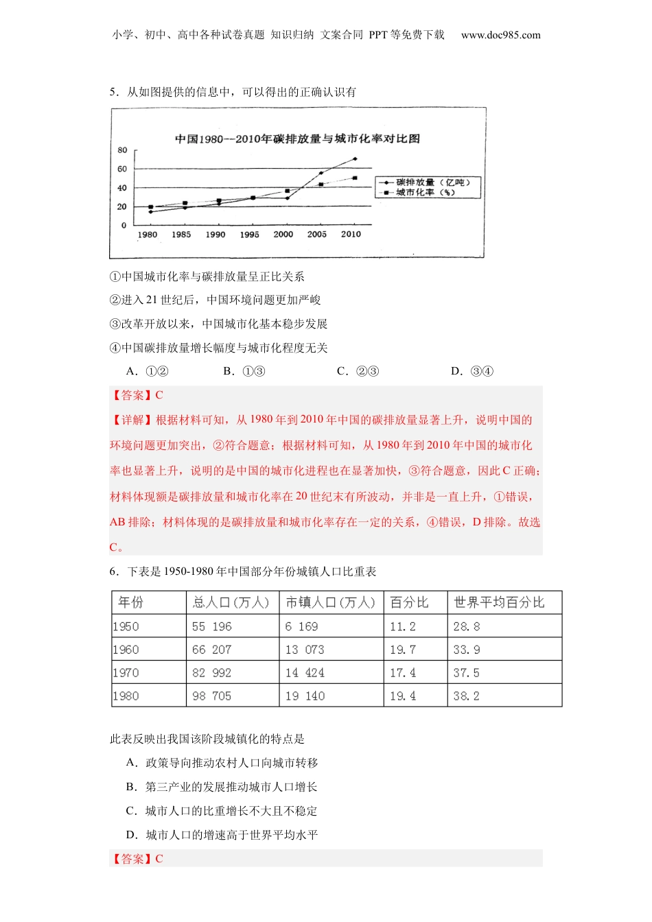 小学、初中、高中各种试卷真题知识归纳文案合同PPT等免费下载www.doc985.com经济类热点--城市化进程-2023-2024学年高三历史二轮(专题训练)1.“失地农民、无业游民(进入城市后)并没有完全依照当局、资本所设计的路径(成为雇佣工人)发展,城市的社会矛盾由此尖锐起来,动荡日益加剧,1789年法国大革命正是在经济裂变与社会矛盾加剧这一基础上发生的”。上述材料的作者所要表达的意思是A.城市化违背了社会发展规律B.城市化是引起法国大革命的主要原因C.对城市化处理不当,会加剧社会矛盾D.法国城市化开始过早【答案】C【详解】本题材料含义为当局、资本所设计的路径并不完善,无法解决失地农民、无业游民(进入城市后)的生存和发展问题,社会矛盾由此尖锐起来,动荡日益加剧。故选C;A观点错误,排除;B错误的解读了材料,城市化不是错误,没有处理好城市化才是错误;D与材料不符,材料没有提到法国城市化的时间问题。2.晚清主要城市人口变化表单位:万(余)1860年1890年上海23100汉口2080天津1932出现上表情况的主要原因是A.农村经济的萎缩B.新式交通工具的使用C.近代工业的发展D.政府实施了移民政策【答案】C【详解】1860年至1890年,上海、汉口和天津的人口激增,其主要原因是洋务运动的开展,创办了近代工业,推动城市化进程,导致人口增加,C项正确;农村经济的萎缩会助推人口向城市迁移,但不是城市人口增多的主要原因,排除A项;新式交通工具的出现会促进人口的迁移,但也不是主要的原因,排除B项;此阶段清王朝并未实施移民至大城市的政策,排除D项。故选C项。小学、初中、高中各种试卷真题知识归纳文案合同PPT等免费下载www.doc985.com3.自19世纪60年代末至20世纪初大约40年左右的时间里,汕头基础设施从无到有,从有到全,形成了供水、供电、铁路、公路、港口、桥梁、通信等完整一体的近代设施体系,在许多方面走在全国的前列,使汕头充满浓烈的近代化城市气息。这反映出,汕头的近代化()A.带有浓厚的半殖民地色彩B.得益于城市化建设不断发展C.为全国城市建设树立标杆D.折射出中西社会文化的更替【答案】B【详解】材料指出,汕头充满浓烈的近代城市气息是由于“基础设施从无到有,从有到全,形成了……完整一体的近代设施体系”,所以汕头的近代化是得益于城市化建设的不断发展,B项正确;虽然汕头是因开埠而崛起的新兴滨海港口城市,但材料不能说明近代汕头发展的半殖民地色彩,排除A项;近代汕头的基础设施建设只是“在许多方面走在全国的前列”,不是标杆,排除C项;材料反映的是汕头基础设施建设与近代化的关系,并未涉及中西文化的更替,排除D项。故选B项。4.下图反映了我国当时A.城市化进程长期处于停滞不前状态B.工业化与城市化呈正比例增长关系C.工业优先战略已经取得了显著成效D.工业发展对城市化产生了消极影响【答案】A【分析】【详解】本题考查1957—1975年我国工业化和城市化发展。从图式可以看出,我国城市化率一直在低水平线上平缓延伸,因此反映出城市化进程长期处于停滞不前的状态,故A项表述正确;比较工业化率和城市化率曲线图可知,二者并不是正比例增长关系,B项错误;1958年发起大跃进运动,大炼钢铁,结果导致国民经济出现混乱;1966—1976年发动文化大革命,国民经济处于崩溃的边缘,虽然在1975年邓小平支持进行全面整顿,使国民经济呈现出迅速回升状态,因此C项说法言过其实,排除C;工业发展有利于城市化进程,“消极影响”在材料中也无法体现,排除D。小学、初中、高中各种试卷真题知识归纳文案合同PPT等免费下载www.doc985.com5.从如图提供的信息中,可以得出的正确认识有①中国城市化率与碳排放量呈正比关系②进入21世纪后,中国环境问题更加严峻③改革开放以来,中国城市化基本稳步发展④中国碳排放量增长幅度与城市化程度无关A.①②B.①③C.②③D.③④【答案】C【详解】根据材料可知,从1980年到2010年中国的碳排放量显著上升,说明中国的环境问题更加突出,②符合题意;根据材料可知,从1980年到2010年中国的城市化率也显著上升,说明的是中国的城市化进程也在显著加快,③符合题意,因此C正确;材料体...