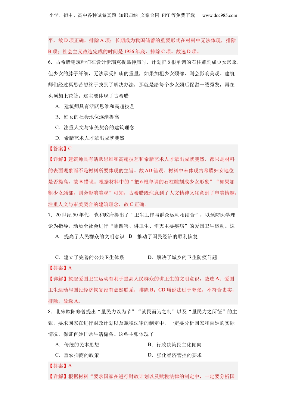 小学、初中、高中各种试卷真题知识归纳文案合同PPT等免费下载www.doc985.com经济类热点--民生问题、人文关怀-2023-2024学年高三历史二轮(专题训练)1.《史记.田敬仲完世家》记载了田氏代齐事件,齐景公时,公室腐败,田桓子对国人“贫均孤寡者,私与之粟”,其子田乞用大斗借出、小斗回收,使“齐之民归之如流水”,是谓“公弃其民,而归于田氏”,掌齐国国政。晏婴曾预言“齐政卒归田氏。田氏虽无大德,以公权私,有德于民,民爱之。”晏婴的预言反映了A.敬德保民的民本意识增强B.选贤任能的墨家思想传播C.等级森严的宗族观念破坏D.血缘分封的分封制度瓦解【答案】A【详解】根据材料“公弃其民,而归于田氏”“齐政卒归田氏。田氏虽无大德,以公权私,有德于民,民爱之。”等信息可知,田氏得到齐国人民的拥护和爱戴,田氏代齐是人心所向,反映了敬德保民的民本意识增强,A项正确;材料不是选贤任能思想,而是民本思想,排除B项;材料的主旨是民本意识,不是宗法制受到破坏,排除C项;材料没有涉及分封制的瓦解,而是强调民本思想,排除D项。故选A项。2.古代不少诗篇以灾害事件为中心.反映了东部沿海各地遭受飓风、风暴潮等海洋灾害的历史图景。如钱谬的《筑塘》中写道:“天分浙水应东溟,日夜波涛不暂停。千尺巨堤冲欲裂,万人力御势须平。吴都地窄兵师广.罗刹名高海众狞。传语龙神并水府.钱塘借与筑钱城。”诗中虽然谦称其筑塘的行动是“借”龙神和水府,但实际上主要反映了A.人类抗衡大海的壮志和力量及政府开展社会和工程救灾的举措B.五代时期我国的经济重心南移东倾和应对海洋灾害的成长过程C.华夏先民历经苦难、依海而生的峥嵘历程和斗争精神D.古代灾害天气的频繁发生和古人海洋意识的普遍增强【答案】A【详解】依据材料可知,《筑塘》反映的是钱锣汇聚吴越军民的磅礴力量,修建钱塘江海塘,与扑城大海进行较量,体现了人海抗争的相持局面及政府开展社会和工程救灾的举措,A项正确;材料反映的是人类抗衡大海的壮志和力量及政府开展社会和工程救灾的举措,不能体现“经济重心南移东倾”、“华夏先民历经苦难、依海而生的峥嵘历程和斗争精神”、“古代灾害天气的频繁发生和古人海洋意识的普遍增强”,排除BCD三项。故选A项。3.李时珍《本草纲目》专门有一个水部,其中说:“凡井水有远从地脉来者为上,有小学、初中、高中各种试卷真题知识归纳文案合同PPT等免费下载www.doc985.com从近处江湖渗来者次之,其城市近沟渠污水杂入者成碱,用须煮滚。”从中反映出()A.明朝时已有较强的疾疫防控意识B.明朝时期,公共饮水水质较差C.城市污水问题十分严重D.明朝居民饮水主要依靠地下水【答案】A【详解】材料体现出,明朝时期已经注意到水井的地理位置的选择,以及对水体污染的防治,故A项符合题意;材料不能反映水质差的问题,排除B项;材料没有反映城市污水,排除C项;“主要”这一说法无法证明,排除D项。4.日俄战争时,沪商沈敦和以在华中立国代表的名义组建“上海万国红十字会”,战争期间救济46万余人。清政府战后接管,更名为“大清帝国红十字会”,使其变成一个官办组织。但该组织在辛亥革命中无法适应战地救护,更不抢救革命党人。沈敦和再次组建“中国红十字会万国董事会”对作战双方开展战地救护。沈敦和将红十字会和“万国”结合起来A.是为募而壮大自己的声势B.有利于凸显民间中立开展救护C.以便展开与清政府的抗衡斗争D.是因为渴望得到列强大力支持【答案】B【详解】根据题意可知,沈敦和组建的红十字会主要是开展救济和战地救护等活动,没有反映其进行募捐活动,故排除A项;清政府接管的红十字会在辛亥革命中不抢救革命党人,沈敦和组建的红十字会对作战双方开展战地救护,由此可以说明沈敦和将红十字会和“万国”结合起来是为了凸显民间中立开展救护,故选B项;沈敦和前后两次组建的红十字会都是从事公益活动,不是革命组织,并不是与清政府抗衡,故排除C项;题意无法体现沈敦和组建红十字会得到列强支持的内容,故排除D项。5.1949年6月,中国人民银行决定在上海推行折实储蓄制度,折实储蓄一般以有代表性的生活必需品作为折实单位,如米、布...
