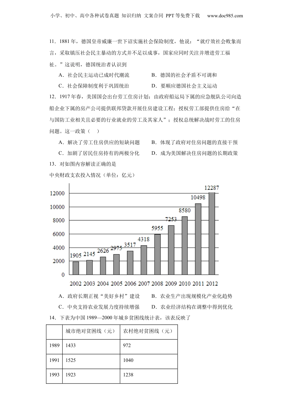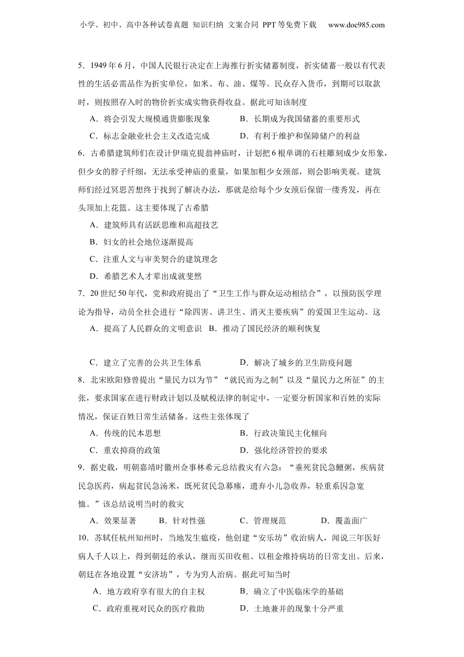 小学、初中、高中各种试卷真题知识归纳文案合同PPT等免费下载www.doc985.com经济类热点--民生问题、人文关怀-2023-2024学年高三历史二轮(专题训练)1.《史记.田敬仲完世家》记载了田氏代齐事件,齐景公时,公室腐败,田桓子对国人“贫均孤寡者,私与之粟”,其子田乞用大斗借出、小斗回收,使“齐之民归之如流水”,是谓“公弃其民,而归于田氏”,掌齐国国政。晏婴曾预言“齐政卒归田氏。田氏虽无大德,以公权私,有德于民,民爱之。”晏婴的预言反映了A.敬德保民的民本意识增强B.选贤任能的墨家思想传播C.等级森严的宗族观念破坏D.血缘分封的分封制度瓦解2.古代不少诗篇以灾害事件为中心.反映了东部沿海各地遭受飓风、风暴潮等海洋灾害的历史图景。如钱谬的《筑塘》中写道:“天分浙水应东溟,日夜波涛不暂停。千尺巨堤冲欲裂,万人力御势须平。吴都地窄兵师广.罗刹名高海众狞。传语龙神并水府.钱塘借与筑钱城。”诗中虽然谦称其筑塘的行动是“借”龙神和水府,但实际上主要反映了A.人类抗衡大海的壮志和力量及政府开展社会和工程救灾的举措B.五代时期我国的经济重心南移东倾和应对海洋灾害的成长过程C.华夏先民历经苦难、依海而生的峥嵘历程和斗争精神D.古代灾害天气的频繁发生和古人海洋意识的普遍增强3.李时珍《本草纲目》专门有一个水部,其中说:“凡井水有远从地脉来者为上,有从近处江湖渗来者次之,其城市近沟渠污水杂入者成碱,用须煮滚。”从中反映出()A.明朝时已有较强的疾疫防控意识B.明朝时期,公共饮水水质较差C.城市污水问题十分严重D.明朝居民饮水主要依靠地下水4.日俄战争时,沪商沈敦和以在华中立国代表的名义组建“上海万国红十字会”,战争期间救济46万余人。清政府战后接管,更名为“大清帝国红十字会”,使其变成一个官办组织。但该组织在辛亥革命中无法适应战地救护,更不抢救革命党人。沈敦和再次组建“中国红十字会万国董事会”对作战双方开展战地救护。沈敦和将红十字会和“万国”结合起来A.是为募而壮大自己的声势B.有利于凸显民间中立开展救护C.以便展开与清政府的抗衡斗争D.是因为渴望得到列强大力支持小学、初中、高中各种试卷真题知识归纳文案合同PPT等免费下载www.doc985.com5.1949年6月,中国人民银行决定在上海推行折实储蓄制度,折实储蓄一般以有代表性的生活必需品作为折实单位,如米、布、油、煤等。民众存入货币,到期可以取款时,则按照存入时的物价折实成实物获得收益。据此可知该制度A.将会引发大规模通货膨胀现象B.长期成为我国储蓄的重要形式C.标志金融业社会主义改造完成D.有利于维护和保障储户的利益6.古希腊建筑师们在设计伊瑞克提翁神庙时,计划把6根单调的石柱雕刻成少女形象,但少女的脖子纤细,无法承受神庙的重量,如果加粗少女颈部,则会影响美观。建筑师们经过冥思苦想终于找到了解决办法,那就是给每个少女颈后保留一缕秀发,再在头顶加上花篮。这主要体现了古希腊A.建筑师具有活跃思维和高超技艺B.妇女的社会地位逐渐提高C.注重人文与审美契合的建筑理念D.希腊艺术人才辈出成就斐然7.20世纪50年代,党和政府提出了“卫生工作与群众运动相结合”,以预防医学理论为指导,动员全社会进行“除四害、讲卫生、消灭主要疾病”的爱国卫生运动。这A.提高了人民群众的文明意识B.推动了国民经济的顺利恢复C.建立了完善的公共卫生体系D.解决了城乡的卫生防疫问题8.北宋欧阳修曾提出“量民力以为节”“就民而为之制”以及“量民力之所征”的主张,要求国家在进行财政计划以及赋税法律的制定中,一定要分析国家和百姓的实际情况,保证百姓日常生活储备。这些主张体现了A.传统的民本思想B.行政决策民主化倾向C.重农抑商的政策D.强化经济管控的要求9.据史载,明朝嘉靖时徽州佥事林希元总结救灾有六急:“垂死贫民急鱣粥,疾病贫民急医药,病起贫民急汤米,既死贫民急募瘗,遗弃小儿急收养,轻重系囚急宽恤。”该总结说明当时的救灾A.效果显著B.针对性强C.管理规范D.覆盖面广10.苏轼任杭州知州时,当地发生瘟疫,他创建“安乐坊”收治病人,闻说三年医好病人千人以上,得到朝廷的承认...
