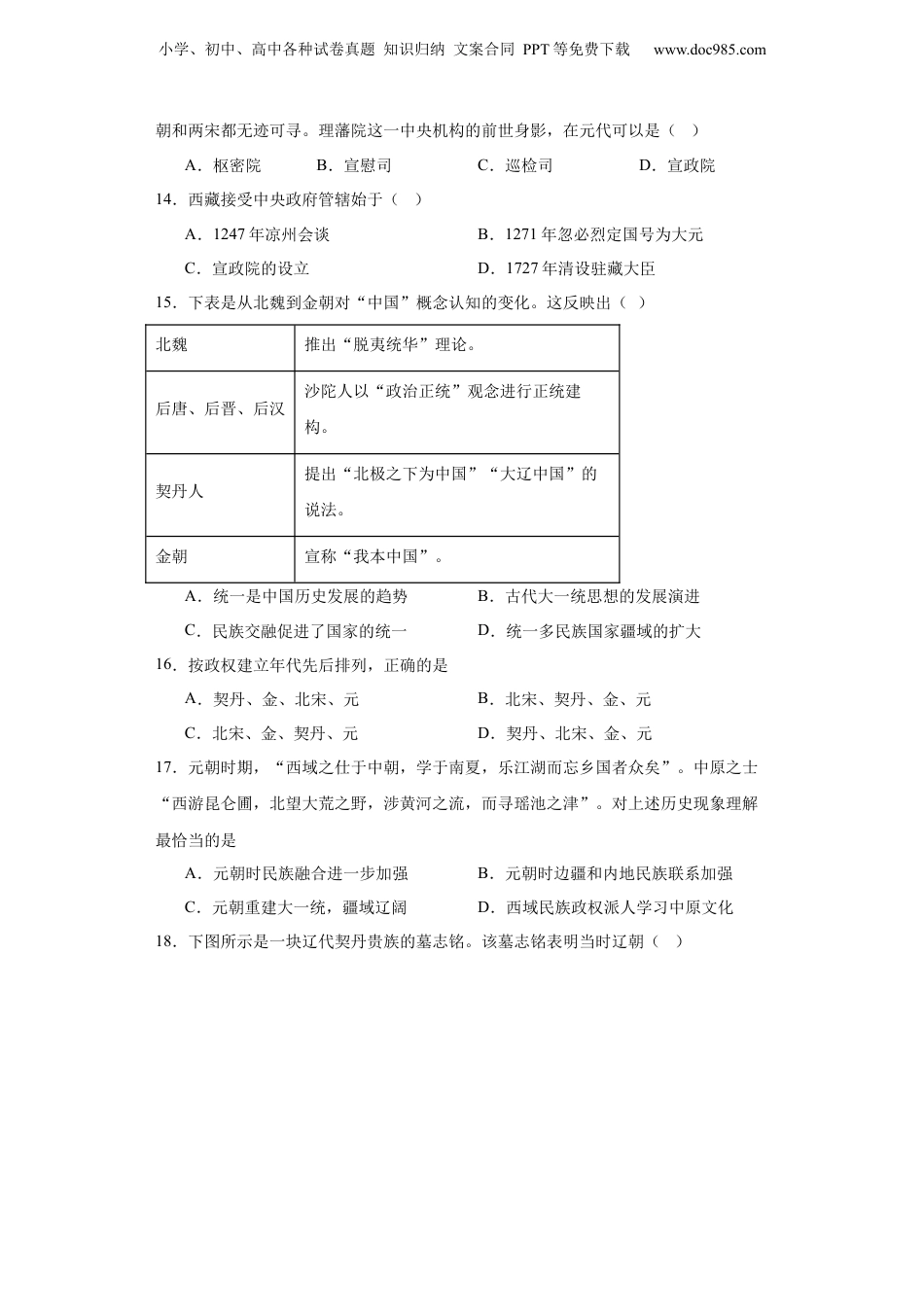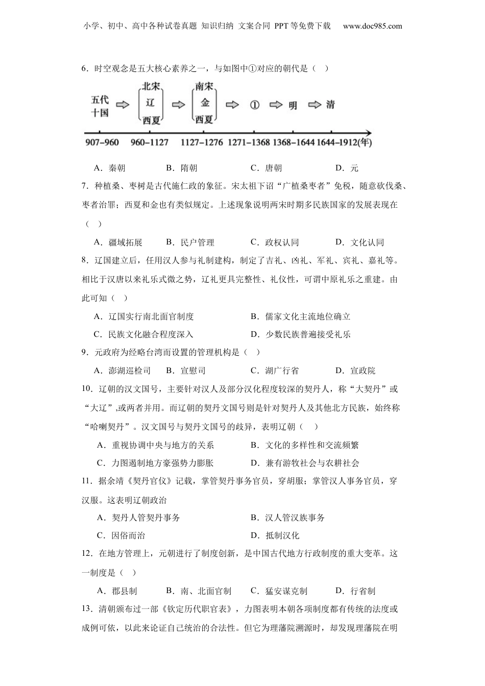 小学、初中、高中各种试卷真题知识归纳文案合同PPT等免费下载www.doc985.com辽夏金元的统治-2023-2024学年高三历史二轮(专题训练)学校:___________姓名:___________班级:___________考号:___________一、单题1.下表是从元朝到明朝中央政府对台湾地区的管辖事件列举,以下事件及其后续处理能说明封建王朝中央政府()时间事件事件后续1281年(元世祖至元十八年)设置澎湖巡检司,隶属福建行省泉州府明初沿袭1384年(明太祖洪武十七年)因海禁而废澎湖巡检司1563年,考虑沿海治安等,复设1622年(明熹宗天启二年)荷兰人占领澎湖1624年,明军收复澎湖A.重视对异族的管理B.遏制了荷兰的扩张C.加强两岸经济交流D.领土主权意识增强2.北面官是辽的最主要机构,下又分南北两个不同的部门,北枢密院管兵部,南枢密院管吏部。南北枢密院是辽朝最高行政机构,也称南北衙。这说明辽朝政治制度()A.行政效率比较低下B.深受中原文化的影响C.受到地理环境影响D.确保了军事实力强大3.元朝时,在中央设立了统领宗教事务和管辖西藏地区的机构是()A.理藩院B.宣政院C.澎湖巡检司D.南书房4.我国是世界上疆域辽阔的国家,祖国的疆域是历史上形成的。有学者认为,元朝实际上奠定了我国疆域的基础,其关键理由是因为元朝时A.实行行省制度B.西藏、台湾正式归属中央政权C.疆域最辽阔D.民族融合进一步加强5.元代的行省长官掌握地方军政大权,但是没有中书省、枢密院转发的诏旨,行省长官既不能更改赋税,也不能调动军队。这说明元代A.重视对地方官员的监察B.行省权力受到中央节制C.行省长官有较大自主性D.君主专制统治达到顶峰小学、初中、高中各种试卷真题知识归纳文案合同PPT等免费下载www.doc985.com6.时空观念是五大核心素养之一,与如图中①对应的朝代是()A.秦朝B.隋朝C.唐朝D.元7.种植桑、枣树是古代施仁政的象征。宋太祖下诏“广植桑枣者”免税,随意砍伐桑、枣者治罪;西夏和金也有类似规定。上述现象说明两宋时期多民族国家的发展表现在()A.疆域拓展B.民户管理C.政权认同D.文化认同8.辽国建立后,任用汉人参与礼制建构,制定了吉礼、凶礼、军礼、宾礼、嘉礼等。相比于汉唐以来礼乐式微之势,辽礼更具完整性、礼仪性,可谓中原礼乐之重建。由此可知()A.辽国实行南北面官制度B.儒家文化主流地位确立C.民族文化融合程度深入D.少数民族普遍接受礼乐9.元政府为经略台湾而设置的管理机构是()A.澎湖巡检司B.宣慰司C.湖广行省D.宣政院10.辽朝的汉文国号,主要针对汉人及部分汉化程度较深的契丹人,称“大契丹”或“大辽”,或两者并用。而辽朝的契丹文国号则是针对契丹人及其他北方民族,始终称“哈喇契丹”。汉文国号与契丹文国号的歧异,表明辽朝()A.重视协调中央与地方的关系B.文化的多样性和交流频繁C.力图遏制地方豪强势力膨胀D.兼有游牧社会与农耕社会11.据余靖《契丹官仪》记载,掌管契丹事务官员,穿胡服;掌管汉人事务官员,穿汉服。这表明辽朝政治A.契丹人管契丹事务B.汉人管汉族事务C.因俗而治D.抵制汉化12.在地方管理上,元朝进行了制度创新,是中国古代地方行政制度的重大变革。这一制度是()A.郡县制B.南、北面官制C.猛安谋克制D.行省制13.清朝颁布过一部《钦定历代职官表》,力图表明本朝各项制度都有传统的法度或成例可依,以此来论证自己统治的合法性。但它为理藩院溯源时,却发现理藩院在明小学、初中、高中各种试卷真题知识归纳文案合同PPT等免费下载www.doc985.com朝和两宋都无迹可寻。理藩院这一中央机构的前世身影,在元代可以是()A.枢密院B.宣慰司C.巡检司D.宣政院14.西藏接受中央政府管辖始于()A.1247年凉州会谈B.1271年忽必烈定国号为大元C.宣政院的设立D.1727年清设驻藏大臣15.下表是从北魏到金朝对“中国”概念认知的变化。这反映出()北魏推出“脱夷统华”理论。后唐、后晋、后汉沙陀人以“政治正统”观念进行正统建构。契丹人提出“北极之下为中国”“大辽中国”的说法。金朝宣称“我本中国”。A.统一是中国历史发展的趋势B.古代大一统思想的发展演进C.民族交融促进了国家...