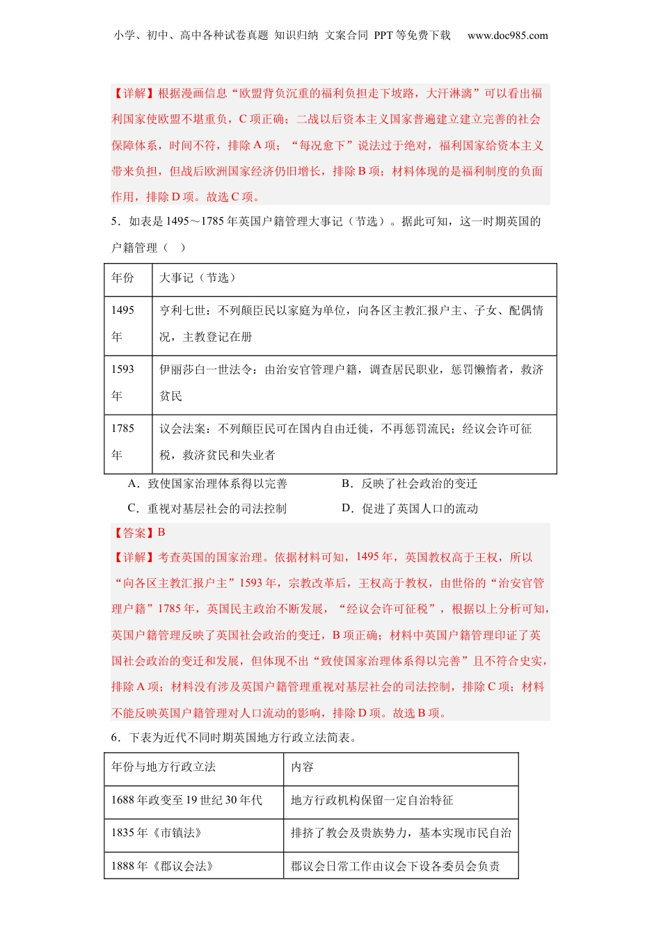 小学、初中、高中各种试卷真题知识归纳文案合同PPT等免费下载www.doc985.com世界主要国家的基层治理与社会保障-2023-2024学年高三历史二轮(专题训练)1.17世纪初,英国颁布了济贫法。19世纪80年代,德国初步建立了社会保险制度。1935年,美国颁布《社会保障法》。二战后,英国率先构建了社会保障体系,基本实现了全民覆盖。资本主义国家的社会保障制度()A.受到文艺复兴和启蒙思想的影响B.能减轻国家的负担,有利经济发展C.是欧美国家垄断资本主义的产物D.利于改善人民生活,缓和社会矛盾【答案】D【详解】结合所学内容可知,西方主要资本主义国家社会保障制度的建立是为了保障社会成员的生活,起到缓和社会矛盾、维持社会稳定的作用,所以资本主义国家的社会保障制度利于改善人民生活,缓和社会矛盾,D项正确;英国在17世纪初就颁布了济贫法,因此并不是受到启蒙思想的影响,排除A项;社会保障制度会加重国家的财政负担,排除B项;社会保障制度在垄断资本主义产生之前就已经出现了,排除C项。故选D项。2.19世纪后半期至20世纪初,西欧各国先后颁布一系列劳工法案和社会保障法案,通过国家立法提高工人待遇、建立社会保障制度。对这些做法理解正确的是,西欧各国()A.建立福利国家,增进人民福祉B.抛弃自由主义,关注弱势群体C.调整生产关系,适应时代需要D.协调民族矛盾,维护殖民统治【答案】C【详解】本题是单类型单项选择题。据本题主题干的设问词,可知这是推断题。据本题时间信息可知准确时空是:19世纪后半期至20世纪初(世界)。结合所学知识可知,19世纪后半期至20世纪初,第二次工业革命开展,社会矛盾加剧。因此,材料中提到“西欧各国先后颁布一系列劳工法案和社会保障法案,通过国家立法提高工人待遇、建立社会保障制度"主要是为了调整生产关系,适应时代需要,C项正确;二战后福利国家才建立,排除A项;20世纪初,西方国家并未抛弃自由主义,排除B项;材料与民族矛盾、殖民统治无关,排除D项。故选C项。3.科技革命及当代资本主义的发展产生了新的社会流动机会,造成了新的社会流动内容。根据如表可以推知联邦德国联邦德国1960年和1981年劳动者数量统计小学、初中、高中各种试卷真题知识归纳文案合同PPT等免费下载www.doc985.com分类雇佣劳动者非雇佣劳动者组成工人、职员、学者、经理、政府官员等资本家、手工业者、商人、农民、独立的医生和律师等1960年人数2030万600万占就业人口比例77.2%22.8%1981年人数2230万340万占就业人口比例86.5%13.5%A.社会结构已发生根本改变B.农业和手工业地位不断下降C.阶层流动的变化趋势加剧D.政府官员成为新雇佣劳动者【答案】C【详解】从图表看出,联邦德国1960年和1981年劳动者中,雇佣劳动者人数和所占人口比例大幅增加,说明科技革命及当代资本主义的发展产生了新的社会流动机会,阶层流动的趋势加剧,故选C;表格数据表明,雇佣劳动者一直占有绝对优势,无法得出社会结构发生根本改变,排除A;从事农业和手工业等非雇佣劳动者的人数减少和占就业人口比例下降,不能说明农业和手工业地位不断下降,排除B;政府官员等是雇佣劳动者,但无法体现“成为新雇佣劳动”,排除D。【点睛】4.下图是一幅《欧盟福利》的漫画。该漫画的寓意是()A.建立完善的社会保障体系B.福利国家使欧盟每况愈下C.福利国家使欧盟不堪重负D.发挥福利制度的正面效用【答案】C小学、初中、高中各种试卷真题知识归纳文案合同PPT等免费下载www.doc985.com【详解】根据漫画信息“欧盟背负沉重的福利负担走下坡路,大汗淋漓”可以看出福利国家使欧盟不堪重负,C项正确;二战以后资本主义国家普遍建立建立完善的社会保障体系,时间不符,排除A项;“每况愈下”说法过于绝对,福利国家给资本主义带来负担,但战后欧洲国家经济仍旧增长,排除B项;材料体现的是福利制度的负面作用,排除D项。故选C项。5.如表是1495~1785年英国户籍管理大事记(节选)。据此可知,这一时期英国的户籍管理()年份大事记(节选)1495年亨利七世:不列颠臣民以家庭为单位,向各区主教汇报户主、子女、配偶情况,主教登记在册1593年伊丽莎白一世法令:由治安官...