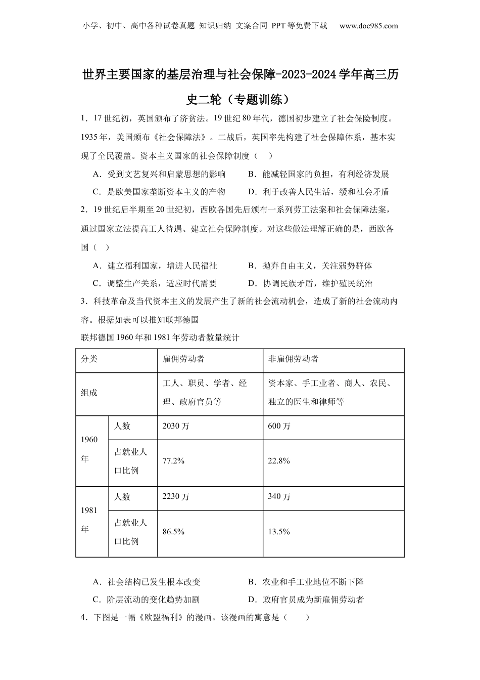 小学、初中、高中各种试卷真题知识归纳文案合同PPT等免费下载www.doc985.com世界主要国家的基层治理与社会保障-2023-2024学年高三历史二轮(专题训练)1.17世纪初,英国颁布了济贫法。19世纪80年代,德国初步建立了社会保险制度。1935年,美国颁布《社会保障法》。二战后,英国率先构建了社会保障体系,基本实现了全民覆盖。资本主义国家的社会保障制度()A.受到文艺复兴和启蒙思想的影响B.能减轻国家的负担,有利经济发展C.是欧美国家垄断资本主义的产物D.利于改善人民生活,缓和社会矛盾2.19世纪后半期至20世纪初,西欧各国先后颁布一系列劳工法案和社会保障法案,通过国家立法提高工人待遇、建立社会保障制度。对这些做法理解正确的是,西欧各国()A.建立福利国家,增进人民福祉B.抛弃自由主义,关注弱势群体C.调整生产关系,适应时代需要D.协调民族矛盾,维护殖民统治3.科技革命及当代资本主义的发展产生了新的社会流动机会,造成了新的社会流动内容。根据如表可以推知联邦德国联邦德国1960年和1981年劳动者数量统计分类雇佣劳动者非雇佣劳动者组成工人、职员、学者、经理、政府官员等资本家、手工业者、商人、农民、独立的医生和律师等1960年人数2030万600万占就业人口比例77.2%22.8%1981年人数2230万340万占就业人口比例86.5%13.5%A.社会结构已发生根本改变B.农业和手工业地位不断下降C.阶层流动的变化趋势加剧D.政府官员成为新雇佣劳动者4.下图是一幅《欧盟福利》的漫画。该漫画的寓意是()小学、初中、高中各种试卷真题知识归纳文案合同PPT等免费下载www.doc985.comA.建立完善的社会保障体系B.福利国家使欧盟每况愈下C.福利国家使欧盟不堪重负D.发挥福利制度的正面效用5.如表是1495~1785年英国户籍管理大事记(节选)。据此可知,这一时期英国的户籍管理()年份大事记(节选)1495年亨利七世:不列颠臣民以家庭为单位,向各区主教汇报户主、子女、配偶情况,主教登记在册1593年伊丽莎白一世法令:由治安官管理户籍,调查居民职业,惩罚懒惰者,救济贫民1785年议会法案:不列颠臣民可在国内自由迁徙,不再惩罚流民;经议会许可征税,救济贫民和失业者A.致使国家治理体系得以完善B.反映了社会政治的变迁C.重视对基层社会的司法控制D.促进了英国人口的流动6.下表为近代不同时期英国地方行政立法简表。年份与地方行政立法内容1688年政变至19世纪30年代地方行政机构保留一定自治特征1835年《市镇法》排挤了教会及贵族势力,基本实现市民自治1888年《郡议会法》郡议会日常工作由议会下设各委员会负责1894年《区、教区、乡议会法》教区一切行政职能由民选议会管理据此可知,英国()A.中央与地方实行分权制衡B.地方的独立性被逐渐削弱C.王权与教权力量此消彼长D.民主法制建设不断加强7.1883年,德国国会通过《疾病保险法》。该法的保险对象是从事工业生产的产业工人,保险费由雇主承担1/3,工人承担2/3.法案还具体规定了参加保险者的权益:小学、初中、高中各种试卷真题知识归纳文案合同PPT等免费下载www.doc985.com免费享受医疗;患病者从第三日起可以领取工资的50%,最长可以领取13周;产妇可以获得4周的补助;等等。近代德国建立社会保险制度的主要作用是()A.促进社会融合B.缓和社会矛盾C.改革传统的社会保障方式D.防治传染疾病的迫切需要8.20世纪80年代以后,西方国家的基层治理强调政府、社区和非政府组织的共同作用。英国在《竞争求质量》白皮书中指出:地方政府的任务在于明确要求和设定优先项目、制定服务标准,不再采用直接提供公共服务。这种基层治理方式A.扩大了政府行政开支B.削弱了居民的政治责任感C.减少了社会资源投入D.有利于促进社会秩序稳定9.1984年,日本修订了二战前制定并实施的《健康保险法》,设立了退休职工医疗制度,并将健康保险被保险人的待遇降低。1992年,日本对《老人保健法》进行了重大修改,设立了老年人访问看护制度,1997年通过了“介护保险制度”,向老年人提供集生活、保健、护理、医疗一体化的保障和服务。日本的举措()A.适应了内向型战略的需要B.实现了地方社区管理行政化C.推动了...