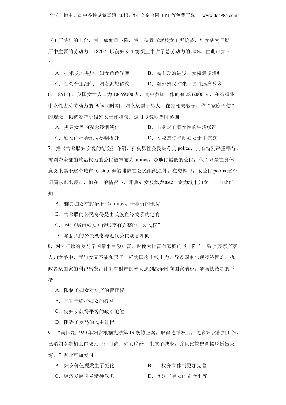 小学、初中、高中各种试卷真题知识归纳文案合同PPT等免费下载www.doc985.com文化类热点-妇女解放与女权运动-2023-2024学年高三历史二轮(专题训练)1.1883年12月11日《申报》记载:上海“缫丝局开,女工之受雇者不少,其他之有需乎妇女者不及备述,总之至于女工亦藉通商之故,而得以自求口实,则其自利于中国人民者何如?”对此材料理解正确的是A.妇女进厂做工,有伤社会风化B.妇女地位提高,就业前景广阔C.妇女自求口实,利于改善民生D.妇女薪酬较低,成为企业首选2.“窃以为此其间不如变通办理,易女工而为男工。夫织布、纺纱、轧花等事,虽似乎近乎妇人女子之事,其实仍是工作,机器或稍笨重,一有脱落等情,妇女即束手无策,仍须借力于男工。而所做之工妇女能之,男子岂有不能为之理?计不如以男易女”。材料反映了A.对妇女的关心与尊重B.传统封建观念影响妇女就业C.中国传统自然经济解体D.妇女不能适应机器生产的要求3.随着妇女更多的参与工业化生产,至19世纪70年代,英国已经有503000名妇女符合地方选举的资格条件,并且已有妇女开始当选市长之职了。到1890年英国共有100名妇女在竞选学校委员会中获胜。1895年有近839名妇女当选为济贫法委员会委员。上述现象出现的根本原因是A.妇女经济上获得独立B.工业领域走入近代化C.民主法制意识的健全D.广大妇女的不懈斗争4.在古代雅典,人们认为妇女除了家政,所受的教育越少越好。喜剧诗人米南德认为:“教妇女识字?一个严重的错误!这就像给一条可怕的毒蛇加上额外的毒液。”据此可知,当时雅典A.家庭教育受到普遍重视B.权利分配存在性别歧视C.戏剧创作关注妇女生活D.妇女无法享受公民待遇5.1830年,妇女和儿童占英国棉花工业中总劳动力的三分之二。然而,随着1833年小学、初中、高中各种试卷真题知识归纳文案合同PPT等免费下载www.doc985.com《工厂法》的出台,童工雇佣量下降,童工位置逐渐被女工所接替,妇女成为早期工厂中主要的劳动力。1870年以前妇女在纺织业中占了总劳动力的50%。由此可知()A.技术发展进步,妇女角色转变B.民主政治进步,女权意识增强C.社会分工细化,妇女思想解放D.对外殖民扩张,男性远离故乡6.1851年,英国女性人口为10659000人,其中参加工作的有2832000人,在纺织业中女性占总劳动力的50%.同时期,妇女从属于男人、在家相夫教子、作“家庭天使”的观念,仍被资产阶级妇女当作楷模。这可以说明当时英国A.男尊女卑的观念逐渐淡化B.出身影响着女性的生活状况C.妇女的社会地位得到提升D.女权意识推动妇女走出家庭7.据《古希腊妇女观的衍变》介绍,雅典男性公民被称为politai,凡有特别严重罪行,被剥夺全部的政治权力的公民被宣布为atimos,是地位最低的公民,他们只是在身体意义上属于这个城市(astu)但被排除在公民组织之外。在史料中,女公民politis这个词偶尔也出现过,但在一般情况下,雅典妇女被称为aste(意为城市妇女)。由此可知A.雅典妇女在政治上与atimos处于相近的地位B.古希腊的公民身份是由氏族血缘关系决定的C.aste(城市妇女)能够享有完整的“公民权”D.希腊人的公民观念与近代公民观念相同8.对外征服给罗马帝国带来巨额财富,也使大批富有家庭的战士阵亡,致使其家产落人妇女手中,而妇女又不能和男子一样为国家出钱出力,导致国家出现经济困难。执政者从国家的利益出发,让拥有财产的妇女遇到战争时向国家纳税。罗马执政者的举措A.限制了妇女对财产的管理权B.有利于维护妇女的权益C.使妇女获得平等的政治地位D.阻碍了罗马的民主进程9.“美国继1920年妇女根据宪法第19条修正案,取得选举权后,更多妇女参加工作,已婚妇女参加工作成为一种时尚。妇女晚婚,生孩子减少,并且比较愿意摆脱婚姻束缚。”据此可知美国A.妇女价值观发生了变化B.三权分立体制更加完善C.经济发展引发精神危机D.实现了男女的完全平等小学、初中、高中各种试卷真题知识归纳文案合同PPT等免费下载www.doc985.com10.下表反映了1851~1911年英国女性就业妇女变化情况。此变化情况说明A.妇女在家庭中地位得到提升B.工业化增加了女性就业机会C.资本主义贫富差距逐...