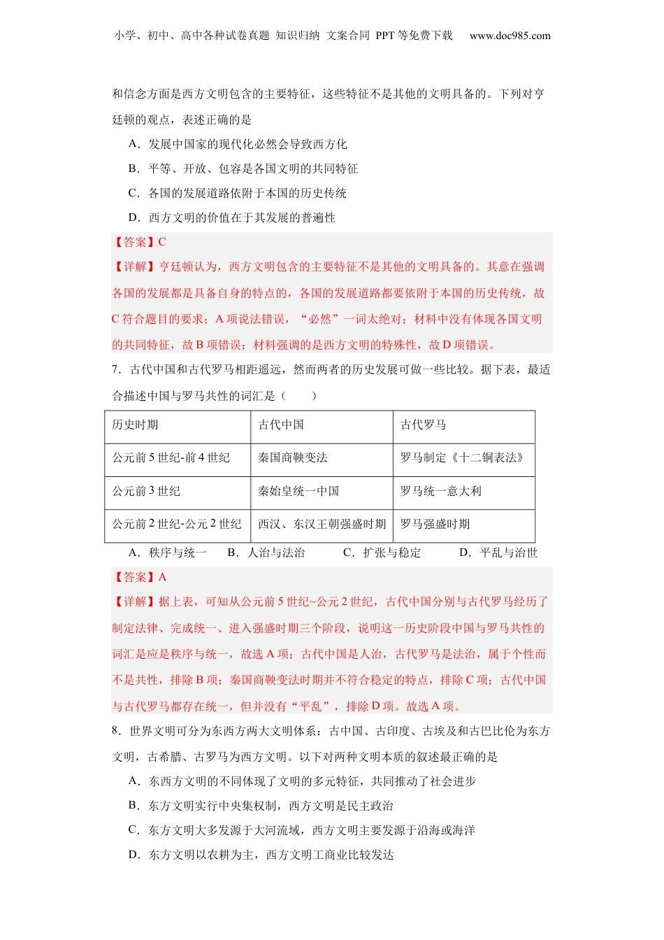小学、初中、高中各种试卷真题知识归纳文案合同PPT等免费下载www.doc985.com文化类热点-文明差异比较与交流借鉴-2023-2024学年高三历史二轮(专题训练)1.在古代,中国逐渐形成了专制主义中央集权制度,而位于亚欧大陆另一侧的欧洲西部则普遍流行民主制度或带有民主色彩的君主制度等。其根本原因在于A.中国与西方的历史传统不同B.中国人与西方人的心理素质不同C.中国与西方的经济结构与形式的差异D.科技发展水平的差异【答案】C【详解】结合所学知识可知,中西政治制度的差异主要是由于经济的因素,中国是小农经济,西方是工商业经济,故C项正确;历史传统不符合题意,A错误;心理素质不是主要差别,B错误;科技也不是主要因素,D错误。2.欧洲人翻译中国文献渐具规模,尤其是儒家经典,主要得益于A.西方传教士B.阿拉伯商人C.拜占庭学者D.中亚粟特人【答案】A【详解】本题考查儒家经典。根据所学知识可知,在十九世纪初至二十世纪五十年代,这将近一百五十年的时间内,在华西方传教士,尤其是基督教新教传教士,对中国教会的建立,以及对中国的文化、教育、科技、医药和社会服务等的现代化做出巨大贡献。西方传教士采取了利用儒家经典和介绍当时西方科学知识的手段,利玛窦于1595年刊刻《天学实义》一书,第一次利用儒家思想论证基督教教义。除此之外,在内地各省发展教徒时,容许入教者维持传统的“祭孔祀祖”的习俗。传教士们还穿儒服、说汉话,以更多地排除传教的障碍。故本题正确答案为A。阿拉伯商人、拜占庭学者、中亚粟特人对传播东方文化起到一定作用,但不是最主要的,排除BCD三项。3.西欧中世纪庄园和东汉后期庄园的共同特点是A.主人和农民之间有雇佣关系B.具有商品货币关系C.有自营地和份地的区别D.自给自足的经济体【答案】D【详解】西欧中世纪庄园和东汉后期庄园都是大型的自给自足的经济体,因此D项正小学、初中、高中各种试卷真题知识归纳文案合同PPT等免费下载www.doc985.com确;西欧中世纪庄园和东汉后期庄园中都没有体现雇佣关系,排除A项;这些庄园都是自给自足的,并没有体现商品经济关系,排除B项;东汉的庄园并不存在份地的概念,排除C项。4.1792年,英国国王乔治三世派遣以马嘎尔尼为首的使团来华,谒见乾隆皇帝,要求通商。双方互赠礼物,英国赠给中国的礼物有太阳系天体运行仪、航海望远镜、战舰模型等;中国回赠英国的礼物有丝绸、宣纸、各种工艺美术品等。这两份不同礼物反映出中英两国最本质的差异是A.英国的天文航海军事技术领先于中国B.中国的传统丝织工艺品依然领先英国C.资本主义文明与传统农耕文明的差异D.中英两国在外交上已经建立密切联系【答案】C【详解】由材料信息“英国赠给中国的礼物有太阳系天体运行仪、航海望远镜、战舰模型等;中国回赠英国的礼物有丝绸、宣纸、各种工艺美术品等”可知,英国的礼物基本都是当时的先进科技,而中国的产品基本都是传统的手工业品。依据所学知识可知,这两份不同礼物实质上反映的是两国不同的文明形态的差异,即资本主义文明与传统农耕文明的差异,故C项正确;英国的天文航海军事技术领先于中国,但不符合材料的主旨信息,故A项错误;中国的传统丝织工艺品依然领先英国,但也不符合材料的主旨信息,故B项错误;此时清政府闭关锁国,两国不可能建立密切联系,故D项错误。5.世界上最早出现的几种文明都是从大河边的平原或河谷发展起来的。这一现象表明制约早期文明产生的基本因素是A.文化的发达程度B.人类的视野C.生产力的发展水平D.自然环境【答案】D【详解】由材料信息“世界上最早出现的几种文明都是从大河边的平原或河谷发展起来的”可知,制约早期文明产生的基本因素是自然地理环境,故D正确;文化的发达程度、人类的视野、生产力的发展水平不符合材料信息,故ABC错误。6.针对“现代化是否导致西方化”的问题,美国国际政治理论家亨廷顿认为,希腊和罗马古典文明的遗产、天主教和新教、欧洲语言、精神权威和世俗权威的分离(或称政教分离)法治、社会多元主义、代议机构、个人主义等西方文明核心的体制、实践小学、初中、高中各种试卷真题知识归纳文案合同PPT等免费下载www.d...