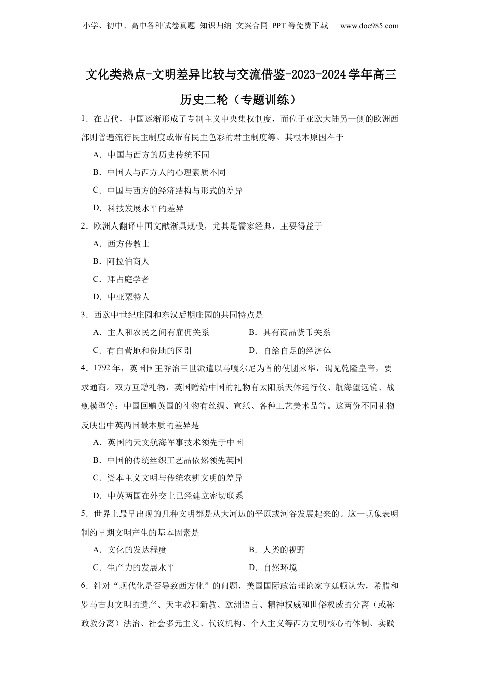 小学、初中、高中各种试卷真题知识归纳文案合同PPT等免费下载www.doc985.com文化类热点-文明差异比较与交流借鉴-2023-2024学年高三历史二轮(专题训练)1.在古代,中国逐渐形成了专制主义中央集权制度,而位于亚欧大陆另一侧的欧洲西部则普遍流行民主制度或带有民主色彩的君主制度等。其根本原因在于A.中国与西方的历史传统不同B.中国人与西方人的心理素质不同C.中国与西方的经济结构与形式的差异D.科技发展水平的差异2.欧洲人翻译中国文献渐具规模,尤其是儒家经典,主要得益于A.西方传教士B.阿拉伯商人C.拜占庭学者D.中亚粟特人3.西欧中世纪庄园和东汉后期庄园的共同特点是A.主人和农民之间有雇佣关系B.具有商品货币关系C.有自营地和份地的区别D.自给自足的经济体4.1792年,英国国王乔治三世派遣以马嘎尔尼为首的使团来华,谒见乾隆皇帝,要求通商。双方互赠礼物,英国赠给中国的礼物有太阳系天体运行仪、航海望远镜、战舰模型等;中国回赠英国的礼物有丝绸、宣纸、各种工艺美术品等。这两份不同礼物反映出中英两国最本质的差异是A.英国的天文航海军事技术领先于中国B.中国的传统丝织工艺品依然领先英国C.资本主义文明与传统农耕文明的差异D.中英两国在外交上已经建立密切联系5.世界上最早出现的几种文明都是从大河边的平原或河谷发展起来的。这一现象表明制约早期文明产生的基本因素是A.文化的发达程度B.人类的视野C.生产力的发展水平D.自然环境6.针对“现代化是否导致西方化”的问题,美国国际政治理论家亨廷顿认为,希腊和罗马古典文明的遗产、天主教和新教、欧洲语言、精神权威和世俗权威的分离(或称政教分离)法治、社会多元主义、代议机构、个人主义等西方文明核心的体制、实践小学、初中、高中各种试卷真题知识归纳文案合同PPT等免费下载www.doc985.com和信念方面是西方文明包含的主要特征,这些特征不是其他的文明具备的。下列对亨廷顿的观点,表述正确的是A.发展中国家的现代化必然会导致西方化B.平等、开放、包容是各国文明的共同特征C.各国的发展道路依附于本国的历史传统D.西方文明的价值在于其发展的普遍性7.古代中国和古代罗马相距遥远,然而两者的历史发展可做一些比较。据下表,最适合描述中国与罗马共性的词汇是()历史时期古代中国古代罗马公元前5世纪-前4世纪秦国商鞅变法罗马制定《十二铜表法》公元前3世纪秦始皇统一中国罗马统一意大利公元前2世纪-公元2世纪西汉、东汉王朝强盛时期罗马强盛时期A.秩序与统一B.人治与法治C.扩张与稳定D.平乱与治世8.世界文明可分为东西方两大文明体系:古中国、古印度、古埃及和古巴比伦为东方文明,古希腊、古罗马为西方文明。以下对两种文明本质的叙述最正确的是A.东西方文明的不同体现了文明的多元特征,共同推动了社会进步B.东方文明实行中央集权制,西方文明是民主政治C.东方文明大多发源于大河流域,西方文明主要发源于沿海或海洋D.东方文明以农耕为主,西方文明工商业比较发达9.“五四”前后,以杜亚泉为代表的东方文化派认为:“西洋社会为动的社会,中国社会为静的社会。由动的社会,发生动的文明,由静的社会,发生静的文明。”这表明该派认为文明具有A.特殊性B.灵活性C.时代性D.普适性10.如表所示是中国近代部分留洋学生的博士论文选题。这些研究年份博士论文选题主要内容1909周《中国宁波的商业形以宁波为背景论述中国古代的行会组织与城小学、初中、高中各种试卷真题知识归纳文案合同PPT等免费下载www.doc985.com毅卿态》市经济1911陈焕章《孔门理财学》按照西方经济学原理,分别讨论了孔子及其儒家学派的一般经济学说及其在消费、生产、公共财产方面的思想1914陈兆焜《清代中国的税收制度(1644~1911)》从现代经济学角度论述清代中国的税收制度1920刘文显《中国农村田产的优点与经营》按现代经济学原理论述中国古代的土地制度与经营形态A.向国人推介了西方经济学理论B.在西方传播了中国的传统智慧C.深化了对中国经济形态的认识D.通过融汇中西实现了理论创新11.16、17世纪,欧洲出现一股收藏热潮,藏品主要包括以下三类。据表可知,当时欧洲的收藏热潮...