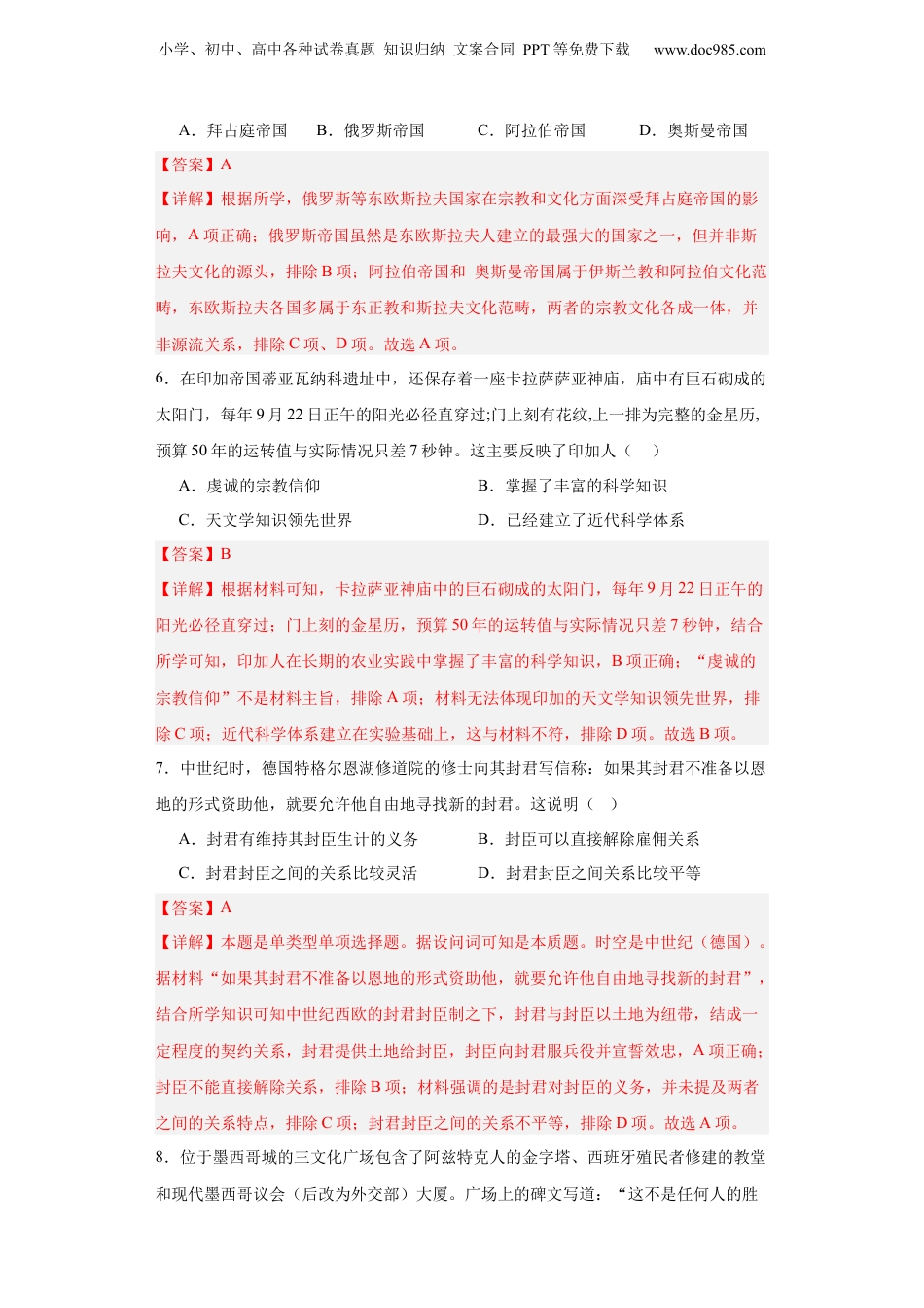 小学、初中、高中各种试卷真题知识归纳文案合同PPT等免费下载www.doc985.com中古世界的帝国与文明的交流-2023-2024学年高三历史二轮(专题训练)1.如下两幅分别描绘中世纪西欧庄园生活与城市街景的油画中,能较完整地了解西欧中世纪A.各时期的建筑风格和居住环境B.城乡社会生活和经济活动状况C.城乡经济发展程度有明显差距D.政治等级森严,贫富悬殊【答案】B【详解】据材料“描绘中世纪西欧庄园生活与城市街景的油画”可知,图片的信息主要展示的西欧庄园生活和和城市的街景,B项正确;据材料“描绘中世纪西欧庄园生活与城市街景的油画”可知,材料主旨是强调中世纪西欧庄园生活与城市街景,不仅仅展示的是建筑风格和居住环境,排除A项;通据图片信息可知,不能看出有明显的城乡经济发展的差距,排除C项;材料中没有涉及政治等级的森严,排除D项。故选B项。2.12世纪初,法国琅城居民向主教高德理和国王路易六世买回城市自治权。但是,高德理得到钱后不久又要重新统治琅城。1112年,琅城居民起义,成立“公社”,杀死高德理。1128年,路易六世不得不颁发特许状,承认琅城自治。由此可知()A.天主教的统治地位受到冲击B.市民采取多种方式维护自身权益C.国王需依靠市民来治理国家D.城市自治得益于王权与教权斗争【答案】B【详解】根据材料可知,琅城市民采取用钱赎买和发动起义、成立“公社”的多种方式来维护城市的权益,B项正确;材料提到琅城市民杀死不守信用的主教,但不能由此证实天主教统治地位受到冲击,排除A项;材料提到国王路易六世出于被迫才承认琅城自治,因此不能得出国王需要依靠市民来治理国家,排除C项;材料反映市民采小学、初中、高中各种试卷真题知识归纳文案合同PPT等免费下载www.doc985.com取多种方式维护自身权益,但没有提到王权与教权的斗争,排除D项。故选B项。3.印度德里苏丹国的苏丹是全国的最高统治者,集君权和教权于一身,国家实行政教合一制度。德里苏丹国的国教是()A.印度教B.佛教C.基督教D.伊斯兰教【答案】D【详解】本题是单类型单项选择题。据本题主题干的设问词,可知这是正向题。据本题时间信息可知准确时空是:古代(印度)。据所学知识可知,德里苏丹国的国教是伊斯兰教,D项正确;德里苏丹国的国教是伊斯兰教,并非印度教、佛教和基督教,排除ABC项。故选D项。4.下图为16世纪的美洲当地绘画,可用于反映阿兹特克文明的消亡,对其解读相对完整的是()A.西班牙依靠武器优势实现征服B.殖民者借助部族仇杀建立统治C.英国殖民立足于屠杀印第安人D.欧洲人以病菌传播征服了美洲【答案】B【详解】本题是单类型单项选择题。据本题主题干设问词,可知这是正向题。据本题时间信息可以得出准确时空是16世纪的美洲。绘画反映出西班牙殖民者在当地土著的支持下对阿兹特克人发动进攻,对土著而言,是反抗阿兹特克的暴政,西班牙则借助印第安人内部的斗争实现殖民征服,B项正确;绘画不仅体现了西班牙武器优势,冲锋在前的更是印第安人,解读片面,排除A项;英国殖民稍晚,重点在北美,而非针对阿兹特克,排除C项;病菌感染是事实,但是材料没有反映,排除D项。故选B项。5.中世纪有一个帝国的文化曾得到斯拉夫各族群的普遍认同,其都城被东欧斯拉夫人看作是他们共同宗教和文化起源的中心。该帝国最有可能是()小学、初中、高中各种试卷真题知识归纳文案合同PPT等免费下载www.doc985.comA.拜占庭帝国B.俄罗斯帝国C.阿拉伯帝国D.奥斯曼帝国【答案】A【详解】根据所学,俄罗斯等东欧斯拉夫国家在宗教和文化方面深受拜占庭帝国的影响,A项正确;俄罗斯帝国虽然是东欧斯拉夫人建立的最强大的国家之一,但并非斯拉夫文化的源头,排除B项;阿拉伯帝国和奥斯曼帝国属于伊斯兰教和阿拉伯文化范畴,东欧斯拉夫各国多属于东正教和斯拉夫文化范畴,两者的宗教文化各成一体,并非源流关系,排除C项、D项。故选A项。6.在印加帝国蒂亚瓦纳科遗址中,还保存着一座卡拉萨萨亚神庙,庙中有巨石砌成的太阳门,每年9月22日正午的阳光必径直穿过;门上刻有花纹,上一排为完整的金星历,预算50年的运转值与实际情况只差7秒钟。这主要反映了印加人()A...