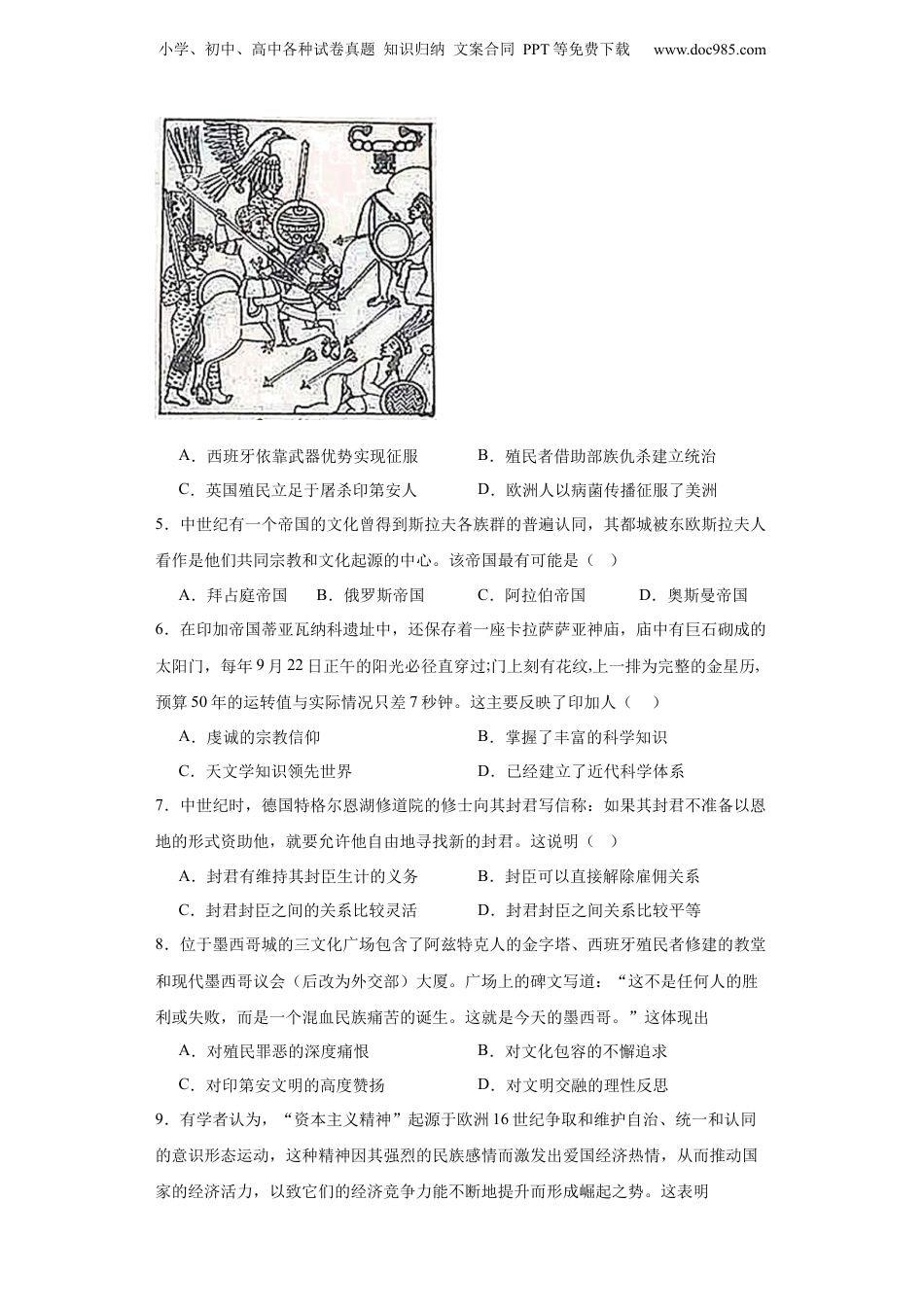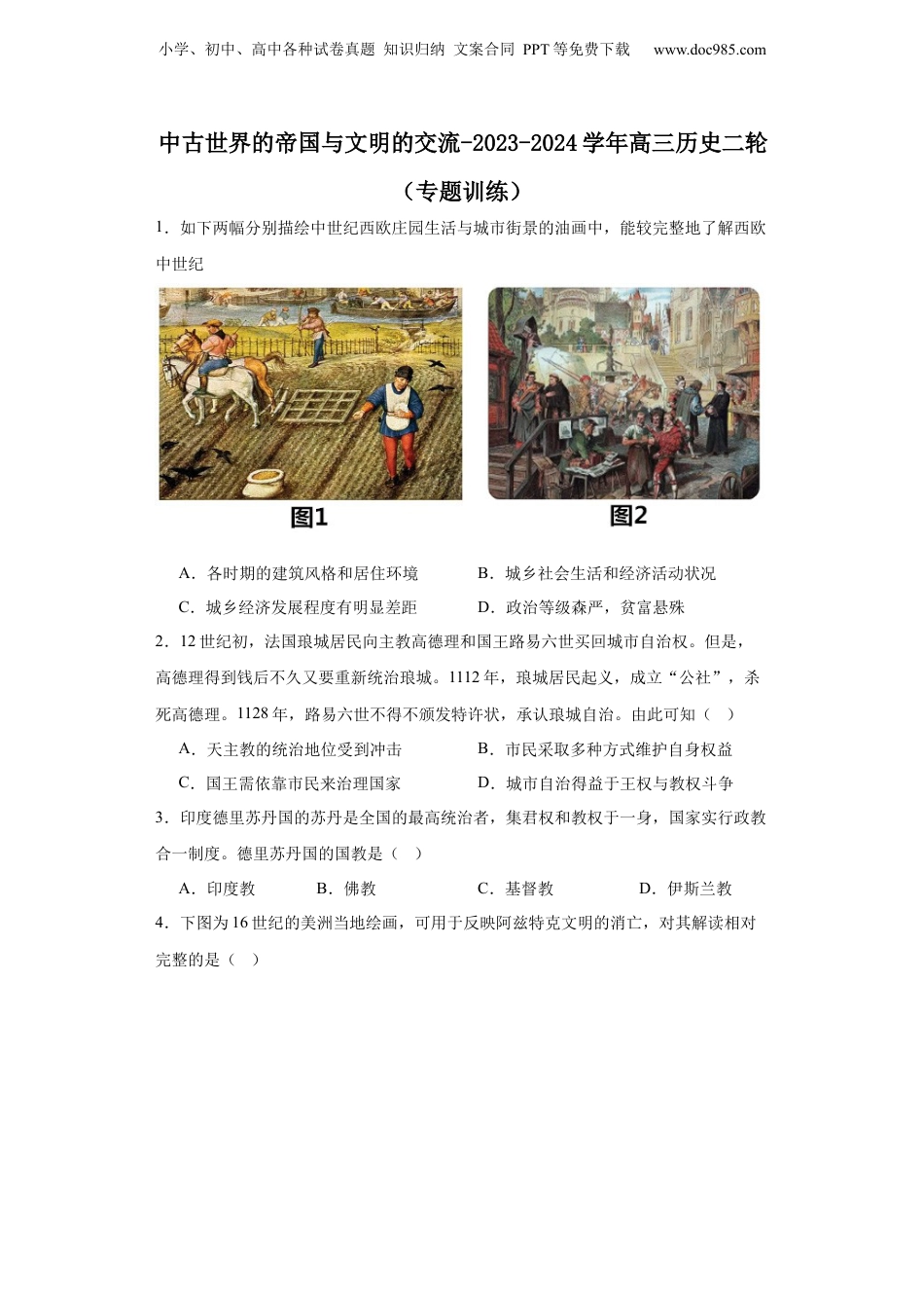 小学、初中、高中各种试卷真题知识归纳文案合同PPT等免费下载www.doc985.com中古世界的帝国与文明的交流-2023-2024学年高三历史二轮(专题训练)1.如下两幅分别描绘中世纪西欧庄园生活与城市街景的油画中,能较完整地了解西欧中世纪A.各时期的建筑风格和居住环境B.城乡社会生活和经济活动状况C.城乡经济发展程度有明显差距D.政治等级森严,贫富悬殊2.12世纪初,法国琅城居民向主教高德理和国王路易六世买回城市自治权。但是,高德理得到钱后不久又要重新统治琅城。1112年,琅城居民起义,成立“公社”,杀死高德理。1128年,路易六世不得不颁发特许状,承认琅城自治。由此可知()A.天主教的统治地位受到冲击B.市民采取多种方式维护自身权益C.国王需依靠市民来治理国家D.城市自治得益于王权与教权斗争3.印度德里苏丹国的苏丹是全国的最高统治者,集君权和教权于一身,国家实行政教合一制度。德里苏丹国的国教是()A.印度教B.佛教C.基督教D.伊斯兰教4.下图为16世纪的美洲当地绘画,可用于反映阿兹特克文明的消亡,对其解读相对完整的是()小学、初中、高中各种试卷真题知识归纳文案合同PPT等免费下载www.doc985.comA.西班牙依靠武器优势实现征服B.殖民者借助部族仇杀建立统治C.英国殖民立足于屠杀印第安人D.欧洲人以病菌传播征服了美洲5.中世纪有一个帝国的文化曾得到斯拉夫各族群的普遍认同,其都城被东欧斯拉夫人看作是他们共同宗教和文化起源的中心。该帝国最有可能是()A.拜占庭帝国B.俄罗斯帝国C.阿拉伯帝国D.奥斯曼帝国6.在印加帝国蒂亚瓦纳科遗址中,还保存着一座卡拉萨萨亚神庙,庙中有巨石砌成的太阳门,每年9月22日正午的阳光必径直穿过;门上刻有花纹,上一排为完整的金星历,预算50年的运转值与实际情况只差7秒钟。这主要反映了印加人()A.虔诚的宗教信仰B.掌握了丰富的科学知识C.天文学知识领先世界D.已经建立了近代科学体系7.中世纪时,德国特格尔恩湖修道院的修士向其封君写信称:如果其封君不准备以恩地的形式资助他,就要允许他自由地寻找新的封君。这说明()A.封君有维持其封臣生计的义务B.封臣可以直接解除雇佣关系C.封君封臣之间的关系比较灵活D.封君封臣之间关系比较平等8.位于墨西哥城的三文化广场包含了阿兹特克人的金字塔、西班牙殖民者修建的教堂和现代墨西哥议会(后改为外交部)大厦。广场上的碑文写道:“这不是任何人的胜利或失败,而是一个混血民族痛苦的诞生。这就是今天的墨西哥。”这体现出A.对殖民罪恶的深度痛恨B.对文化包容的不懈追求C.对印第安文明的高度赞扬D.对文明交融的理性反思9.有学者认为,“资本主义精神”起源于欧洲16世纪争取和维护自治、统一和认同的意识形态运动,这种精神因其强烈的民族感情而激发出爱国经济热情,从而推动国家的经济活力,以致它们的经济竞争力能不断地提升而形成崛起之势。这表明小学、初中、高中各种试卷真题知识归纳文案合同PPT等免费下载www.doc985.comA.民族意识促进了欧洲的崛起B.城市自治推动民主政治发展C.专制王权强化增强民族认同D.思想解放促进资本主义萌芽10.公元646年,日本孝德天皇颁布改新诏书,开始改革,因其年号是“大化”,史称“大化改新”。这一时期的日本()A.建立了中央集权国家B.确立了幕府政治统治C.打破了闭关锁国局面D.推行了文明开化政策11.13世纪时,英格兰的一则小品剧中,庄园领主在法庭上公开讨论小麦、奶酪、鸡蛋和小乳猪的价格。无独有偶,《田庄总管职责》也提醒领主和总管,羊毛应该论包或以一只羊一次所剪的毛为单位出售,怎样卖收益最大、好处最多,就怎样卖。上述材料反映英格兰()A.封建庄园制度已濒临崩溃B.庄园农产品获利丰厚C.农业的经济转型趋势初显D.圈地运动正迅速开展12.中世纪的欧洲,各城市之间的关税或通行税名目多、数量大,城市内部出现的商业欺诈、赋税不均、党派争斗、社会冲突等“城市病”也愈演愈烈。这一状况()A.说明城市自治权尚需继续强化B.制约了领主经济发展C.源于城市权力获取途径的不同D.为王权集中提供契机13.“万民法吸收了清除了形式主义的罗马市民法的规范、同罗马人...