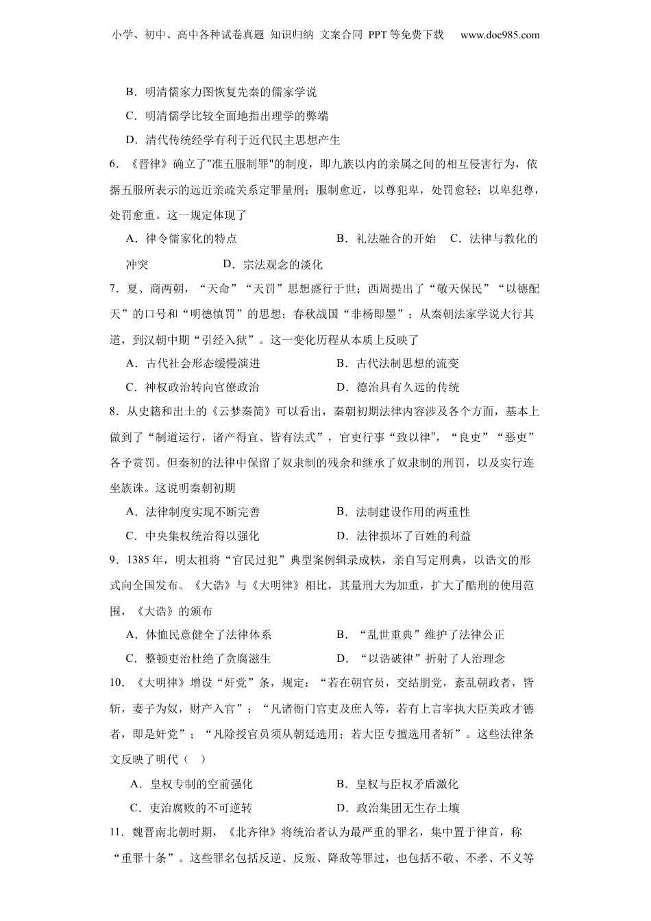 小学、初中、高中各种试卷真题知识归纳文案合同PPT等免费下载www.doc985.com中国古代的法治与教化-2023-2024学年高三历史二轮(专题训练)1.睡虎地秦简中有一个案例:“某里士五(伍)甲告曰:甲亲子同里士五(伍)丙不孝,谒杀,敢告。即令令史己往执。”材料主要表明,当时()A.法律遵循轻罪重罚原则B.连坐制度影响深远C.国家法治渗透伦理观念D.开启礼法结合先例2.世界法律一般划分为五大法系:大陆法系、英美法系、阿拉伯法系、印度法系和中华法系。其中中华法系建立的标志是A.《二年律令》B.《唐律疏议》C.《大唐开元礼》D.《大清律例》3.下表睡虎地秦墓竹简《法律答问》的记述(部分)。由下表可知《秦律》()序号记述(13)夫盗千钱,妻所匿三百,可(何)以论妻?妻智(知)夫盗而匿之,当以三百论为盗;不智(知),为收(收藏)。(15)削(夜间)盗,藏(赃)直(值)百一十,其妻、子智(知),与食肉,当同罪。(16)削(夜间)盗,减(赃)直(值)百五十,告(告诉)甲,甲与其妻、子智(知),共食肉,甲妻、子与甲同罪。A.体现定罪量刑B.蕴含民本思想C.保障等级秩序D.强调儒家伦理4.对于礼法关系,《唐律疏议》解释道:““以刑止刑,以杀止杀。'刑罚不可驰于国,答捶不得废于家……德礼为政教之本,刑罚为政教之用,尤昏晓阳秋相须而成者也。”这表明A.疏议形成了完整的法典体系B.德礼和刑罚具有同等的地位C.社会秩序利于君主权威确立D.礼法都是维持社会秩序手段5.清史专家黄爱平指出:“明末清初,是中国社会发展变化的重要历史时期,也是传统学术发展演变的重要转折阶段……在天地翻覆的磨难中,中国传统学术(儒家思想)完成了由宋明时期的思辨哲学向清代传统经学的转变”对该材料解读最准确的是()A.政治环境的变化影响学术思想的发展小学、初中、高中各种试卷真题知识归纳文案合同PPT等免费下载www.doc985.comB.明清儒家力图恢复先秦的儒家学说C.明清儒学比较全面地指出理学的弊端D.清代传统经学有利于近代民主思想产生6.《晋律》确立了"准五服制罪"的制度,即九族以内的亲属之间的相互侵害行为,依据五服所表示的远近亲疏关系定罪量刑;服制愈近,以尊犯卑,处罚愈轻;以卑犯尊,处罚愈重。这一规定体现了A.律令儒家化的特点B.礼法融合的开始C.法律与教化的冲突D.宗法观念的淡化7.夏、商两朝,“天命”“天罚”思想盛行于世;西周提出了“敬天保民”“以德配天”的口号和“明德慎罚”的思想;春秋战国“非杨即墨”;从秦朝法家学说大行其道,到汉朝中期“引经入狱”。这一变化历程从本质上反映了A.古代社会形态缓慢演进B.古代法制思想的流变C.神权政治转向官僚政治D.德治具有久远的传统8.从史籍和出土的《云梦秦简》可以看出,秦朝初期法律内容涉及各个方面,基本上做到了“制道运行,诸产得宜、皆有法式”,官吏行事“致以律",“良吏”“恶吏”各予赏罚。但秦初的法律中保留了奴隶制的残余和继承了奴隶制的刑罚,以及实行连坐族诛。这说明秦朝初期A.法律制度实现不断完善B.法制建设作用的两重性C.中央集权统治得以强化D.法律损坏了百姓的利益9.1385年,明太祖将“官民过犯”典型案例辑录成帙,亲自写定刑典,以诰文的形式向全国发布。《大诰》与《大明律》相比,其量刑大为加重,扩大了酷刑的使用范围,《大诰》的颁布A.体恤民意健全了法律体系B.“乱世重典”维护了法律公正C.整顿吏治杜绝了贪腐滋生D.“以诰破律”折射了人治理念10.《大明律》增设“奸党”条,规定:“若在朝官员,交结朋党,紊乱朝政者,皆斩,妻子为奴,财产入官”;“凡诸衙门官吏及庶人等,若有上言宰执大臣美政才德者,即是奸党”;“凡除授官员须从朝廷选用;若大臣专擅选用者斩”。这些法律条文反映了明代()A.皇权专制的空前强化B.皇权与臣权矛盾激化C.吏治腐败的不可逆转D.政治集团无生存土壤11.魏晋南北朝时期,《北齐律》将统治者认为最严重的罪名,集中置于律首,称“重罪十条”。这些罪名包括反逆、反叛、降敌等罪过,也包括不敬、不孝、不义等小学、初中、高中各种试卷真题知识归纳文案合同PPT等免费下载www.doc985.co...