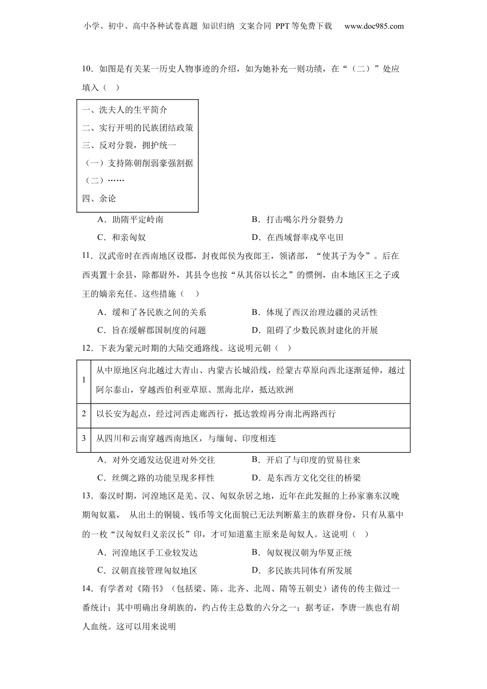 小学、初中、高中各种试卷真题知识归纳文案合同PPT等免费下载www.doc985.com中国古代的民族关系与对外交往-2023-2024学年高三历史二轮(专题训练)1.北宋欧阳修等人认为,文人文集中“陈北虏事宜甚多”,一旦“传入虏中”,则“大于朝廷不便”,建议加强对民间刻印文集的管理。于是,皇帝下诏:“民以书籍赴沿边榷场博易者,自非九经书疏,悉禁之”。这表明北宋政府A.加强君主专制B.文化影响力增强C.强化信息管控D.挑动民族矛盾2.汉宣帝甘露元年(公元前53年),呼韩邪单于内附汉朝,汉匈边地出现了“边城晏闭,牛马布野,三世无犬吠之警,黎庶亡干戈之役”的局面。据此可知,呼韩邪单于内附汉朝()A.维系了西汉王朝的长治久安B.消除了各民族之间的矛盾C.稳定了统一多民族国家秩序D.反映了休养生息政策的效果3.某学者总结了唐代对外政策的基本特征及其主要表现,如下表所示。这表明唐代对外交往()基本特征主要表现友好往来持续推进友好相处总是居于主流,即使在安史之乱,中外交往也未完全停止量才使用海外人员灵活的对外人才政策,对于促进中外交流起到了桥梁式作用设置机构、维护交通设置管理外贸的市舶使、开凿大庾岭等,推动了中外经济文化交往双向交流、兼收并蓄朝廷派人学习印度制糖术,借鉴犍陀罗艺术风格等A.着眼于开阔民众眼界B.忽视了国家权益的维护C.具有开放包容的姿态D.基本不受时局变幻影响4.从公元前105年开始,两汉政府先后在西域地区推行屯戍政策,以军屯为主,最多的年份屯军人数多达几千人。屯戍士卒修建了许多用于农田灌溉的水渠,还大力发展粮食生产,同时设置管理屯戍事务的行政机构。这一举措A.根本目的是发展当地经济B.推动了边疆开发与民族交融C.为丝绸之路开通铺平道路D.开始于西域都护府设立以后小学、初中、高中各种试卷真题知识归纳文案合同PPT等免费下载www.doc985.com5.属国制度是两汉政府对归附的少数民族部落实行的一种地方民族管理体制,属国居民“因其故俗”,允许保留原有的生产、生活方式和社会组织等;由政府任命属国都尉领护。这一制度A.是郡县与分封并行制度的延伸B.开创了改土归流政策的先河C.使边疆管理与内地趋向一体化D.有利于国家统一和边疆稳定6.清代,在蒙古、新疆、青海、西藏和东北等地,设置特别行政区,采取和内陆不同的行政管理办法。以下制度中,最能体现上述情况的是()A.宣政院B.理藩院C.土司制度D.密折奏事制度7.杜甫在《喜闻盗贼蕃寇总退口号五首》之中回顾玄宗朝吐蕃遣使来唐:“赞普多教使人数通和好止烟尘。”中唐时王建《宫词》云:“未明开著九重关,金画黄龙五色幡。直到排仗合,圣人三殿对西番。”两则材料共同说明()A.唐文化具有强大向心力B.中原地区流行西域风情C.胡汉之间差异逐渐消失D.唐朝与吐蕃的友好交往8.下表为《滇事杂档》中收录的滇南地区官员与边境地区的土司之间往来文件的部分内容。据此可知()文件内容临安府官员给土司稿吾卡的公函土司、掌寨所管地方,乃朝廷地土,安设土司、掌寨,以卫边隅,寸地尺土,并非土司、掌寨私业,不得擅自与人。土司稿吾卡对猛喇老挝族人的声明猛喇地方,系朝廷土地,安设土司、掌寨管理,并非土地私业,不得擅自与人。A.双方在守护疆域问题上态度一致B.西南地区独立于清王朝管辖之外C.清王朝在西南大规模“改土归流”D.清朝笼络西南地区各族上层分子9.《唐六典》记载,“凡军、州边防镇守转运不给,则设屯田以益军储”,有“安西二十屯,疏勒七屯,焉耆七屯,北庭二十屯,伊吾一屯,天山一屯”。唐代屯田()A.有利于稳定均田制B.强化君主专制集权C.主要基于边防军需D.导致了藩镇的崛起小学、初中、高中各种试卷真题知识归纳文案合同PPT等免费下载www.doc985.com10.如图是有关某一历史人物事迹的介绍,如为她补充一则功绩,在“(二)”处应填入()一、洗夫人的生平简介二、实行开明的民族团结政策三、反对分裂,拥护统一(一)支持陈朝削弱豪强割据(二)……四、余论A.助隋平定岭南B.打击噶尔丹分裂势力C.和亲匈奴D.在西域督率戍卒屯田11.汉武帝时在西南地区设郡,封夜郎侯为夜郎王,领诸部,“使其子...