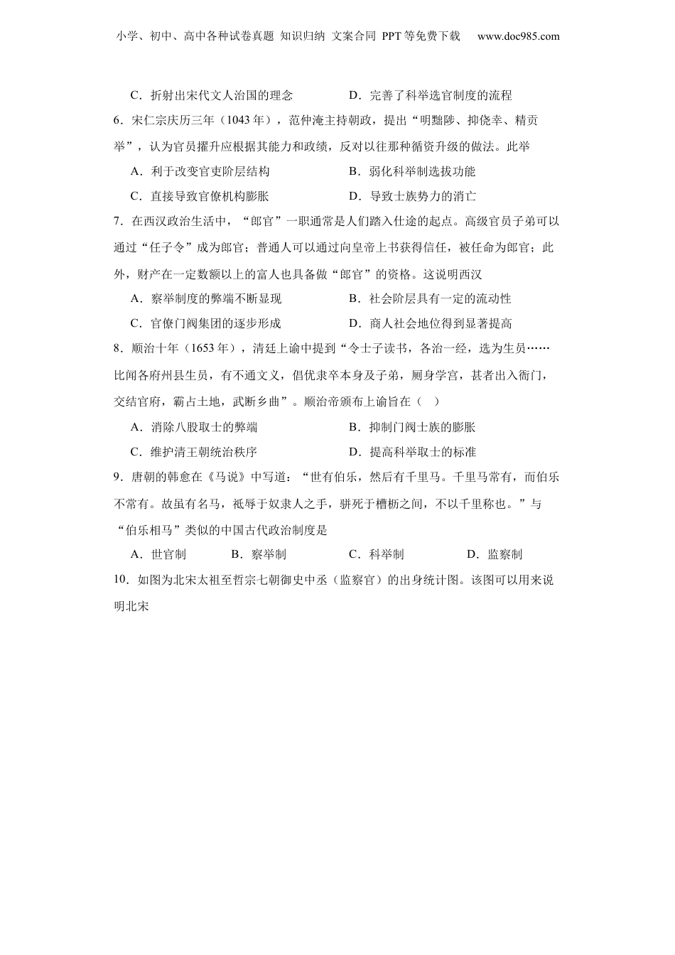 小学、初中、高中各种试卷真题知识归纳文案合同PPT等免费下载www.doc985.com中国古代官员的选拔、考核与监察-2023-2024学年高三历史二轮(专题训练)1.阅读下表。下表反映出汉代()“惠帝三年(公元前192年),相国奏遣御史监三辅郡,察辞诏(讼),凡九条。”《汉旧仪》“武帝元封五年(公元前106年),初置部刺史,掌奉诏条察州。”《汉书》A.监察官员受到丞相制约B.中央与地方的矛盾尖锐C.注重对监察权力的规范D.形成较完善的监察体系2.在二十四史记载的我国古代有籍贯可考的一千多位宰相中,河南籍、陕西籍、山东籍、河北籍宰相总数占全国宰相总数一半以上,每10位宰相中至少有两个河南人、一个陕西人、一个山东人、一个河北人。在宰相人数居前10位的10省中,北方豫、陕、冀、鲁、晋五省占666人,南方苏、浙、皖、赣、鄂五省占225人。这说明了我国古代A.边疆地区经济发展的滞后B.经济重心南移速度的缓慢C.中央集权制度的不断强化D.黄河流域的文明优势地位3.洪武三十年(1397年)发生“南北榜案”,因是年会试录取者皆为南方人,明太祖疑其间有弊,杀主考官,重试结果全取北方人。以后明朝科举会试遂分为南、北两榜,分别录取。南北分榜()A.平衡了不同区域的利益关系B.说明南北方经济发展已达到平衡C.确保了明朝统治秩序的稳定D.着眼于举子入仕机会的相对均等4.荫补制度是中国封建社会的一种选官制度。宋代荫补制规定,荫补数量和范围与官职挂钩,高级官员如宰相,执政则可荫“期亲”,一般官吏可荫及子孙。史料记载,宋代最多一次同时荫补了官员子弟四千人。由此可知,宋代的荫补制度A.取代了科举取士的地位B.加剧了“冗官”的严重性C.削弱了封建统治的基础D.导致了门阀士族的复兴5.宋朝时期,差遣因故离职或任满后仍暂时在职,当年无法满一考,则这一部分任职时间称作“零考”。官员赴任新差遣后,他们需在到任后的一定时限内向本州提出申请,由州“录报在京所属,依格资序一色,方许补满前任,共成考任”。南宋末年,其适用范围已经扩大到了文武官员群体。这项制度()A.体现了官员管理制度精细化B.有利于提高政府的行政效率小学、初中、高中各种试卷真题知识归纳文案合同PPT等免费下载www.doc985.comC.折射出宋代文人治国的理念D.完善了科举选官制度的流程6.宋仁宗庆历三年(1043年),范仲淹主持朝政,提出“明黜陟、抑侥幸、精贡举”,认为官员擢升应根据其能力和政绩,反对以往那种循资升级的做法。此举A.利于改变官吏阶层结构B.弱化科举制选拔功能C.直接导致官僚机构膨胀D.导致士族势力的消亡7.在西汉政治生活中,“郎官”一职通常是人们踏入仕途的起点。高级官员子弟可以通过“任子令”成为郎官;普通人可以通过向皇帝上书获得信任,被任命为郎官;此外,财产在一定数额以上的富人也具备做“郎官”的资格。这说明西汉A.察举制度的弊端不断显现B.社会阶层具有一定的流动性C.官僚门阀集团的逐步形成D.商人社会地位得到显著提高8.顺治十年(1653年),清廷上谕中提到“令士子读书,各治一经,选为生员……比闻各府州县生员,有不通文义,倡优隶卒本身及子弟,厕身学宫,甚者出入衙门,交结官府,霸占土地,武断乡曲”。顺治帝颁布上谕旨在()A.消除八股取士的弊端B.抑制门阀士族的膨胀C.维护清王朝统治秩序D.提高科举取士的标准9.唐朝的韩愈在《马说》中写道:“世有伯乐,然后有千里马。千里马常有,而伯乐不常有。故虽有名马,祗辱于奴隶人之手,骈死于槽枥之间,不以千里称也。”与“伯乐相马”类似的中国古代政治制度是A.世官制B.察举制C.科举制D.监察制10.如图为北宋太祖至哲宗七朝御史中丞(监察官)的出身统计图。该图可以用来说明北宋小学、初中、高中各种试卷真题知识归纳文案合同PPT等免费下载www.doc985.comA.政府重视监察官员队伍建设B.监察体系内部出现权力制衡C.中央对地方的监察力度加强D.进士及第主要担任监察官员11.汉王朝以孝治天下,并把孝纳入官吏选举制度之中,成为个人社会评价的重要依据。士大夫能持服三年者,身价倍增,如铫期为父服丧三年,乡里称之;如果遇丧不奔,往往身败名裂,如元...