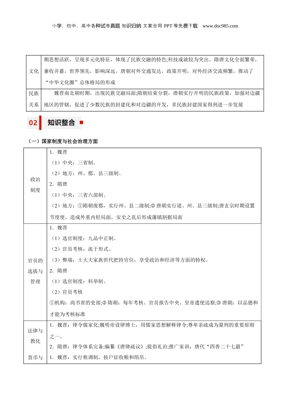 小、初中、高中各卷知文案合同学种试真题识归纳PPT等免下费载www.doc985.com专题三交融与创新——三国两晋南北朝的民族交融和隋唐的大一统内容导航01阶段特征02知识整合03易错概念04重难深化05专题训练魏晋南北朝时期(220—589年),封建国家分裂、民族交融,是中华文明曲折发展并孕育大一统条件的时期。隋唐时期(581—907年),统一多民族封建国家发展,封建经济、文化繁荣,是中华文明繁荣发展的阶段。政治国家由分裂走向统一,专制主义中央集权制度得到发展。魏晋南北朝时期,政权分立,北方战争频繁,北魏孝文帝改革推动了北方民族交融;隋唐时期,国家统一局面形成,政治制度不断发展,三省六部制和科举制度不断完善,中国古代政治制度逐渐成熟;唐朝安史之乱后政局动荡,唐后期形成的藩镇割据严重削弱了中央集权经济封建经济从曲折发展到日趋繁荣;魏晋南北朝时期,北民南迁,江南地区得到初步开发。北魏均田制形成,封建生产方式向边疆扩展。士族庄园经济与寺院经济占有重要地位。隋唐时期,农耕经济繁荣,江南经济进一步发展。安史之乱后,经济重心开始南移思想宗教方面从三教并行到三教归儒;文学艺术从成就突出到出现新的高峰。魏晋南北朝至隋唐时小、初中、高中各卷知文案合同学种试真题识归纳PPT等免下费载www.doc985.com文化期思想活跃,呈现多元化特征,体现了民族交融的特色;科技成就较为突出。隋唐文化全面繁荣,兼收并蓄,世界领先,影响深远。唐朝对外交通发达,政策开明,对外经济交流频繁,推动了“中华文化圈”总体格局的形成民族关系魏晋南北朝时期,出现民族交融局面;隋朝结束分裂,唐朝实行开明的民族政策,加强对边疆地区的管辖,促进了少数民族的封建化和对边疆的开发,多民族封建国家得到进一步发展(一)国家制度与社会治理方面政治制度1.魏晋(1)中央:三省制。(2)地方:州、郡、县三级制。2.隋唐(1)中央:三省六部制。(2)地方:①隋朝废郡,实行州、县二级制;②唐朝实行道、州、县三级制;唐玄宗时期设置节度使,造成外重内轻局面,安史之乱后形成藩镇割据局面官员的选拔与管理1.魏晋(1)选官制度:九品中正制。(2)官员考核:流于形式。(3)弊端:士大夫家族世代把持官位,享受政治和经济等方面的特权。2.隋唐(1)选官制度:科举制。(2)官员考核①机构:尚书省的吏部;②隋朝:每年考核、官员报告中央、皇帝遣使巡察;③唐朝:以品德和才能为考核标准法律与教化1.魏晋:律令儒家化;魏明帝设律博士,用儒家思想解释律令;尊卑亲疏成为量刑的重要原则之一。2.隋唐:律令体系完备;编纂《唐律疏议》;提倡礼治;推广家训;唐代“四善二十七最”货币与1.魏晋:实行租调制,按户征收粮和绢帛。小、初中、高中各卷知文案合同学种试真题识归纳PPT等免下费载www.doc985.com赋税制度2.隋唐:隋朝征收租调役,唐初实行租庸调制,780年改行两税法基层治理与社会保障1.户籍制度(1)东晋:黄籍、白籍、土断。(2)隋朝:“大索貌阅”,重新核定户籍。(3)唐朝:承隋制,户籍三年一造。2.基层组织:唐设乡里,城内设坊,郊外设村。基层以“邻保制度”为治理模式。3.社会救济:重视官仓储备,提倡民间义仓积储;唐朝政府设收容贫老、孤儿和乞讨流浪人员的专门机构,如养病坊民族关系与对外交往1.魏晋(1)东汉以来,内迁的民族建立政权,学习汉族的典章制度,各民族频繁接触,通婚杂居,互相影响。(2)北魏孝文帝改革进一步推动民族交融。(3)国家分裂,丝绸之路受阻2.隋唐(1)负责民族事务的机构:礼部、鸿胪寺。(2)民族关系:大交融、大发展。唐朝与周边民族保持着良好的经济文化交流关系,缔造了统一多民族国家。(3)政治统一,对外交往空前发展,经济文化交流活跃(二)经济与社会生活方面农业与手工业1.魏晋南北朝(1)南北朝时期出现以灌钢法制作的农具。(2)马钧对翻车进行革新,其后翻车在民间广泛使用。(3)坞堡除军事作用外,也带有庄园经济的色彩。2.隋唐(1)在江南水田地区推广曲辕犁,耕犁基本定型。(2)逐渐形成北方旱田和南方水田两种耕作模式商业和城市1.魏晋:当铺兴起。2.隋唐(1)城市:隋朝兴建洛阳城。(2)...
