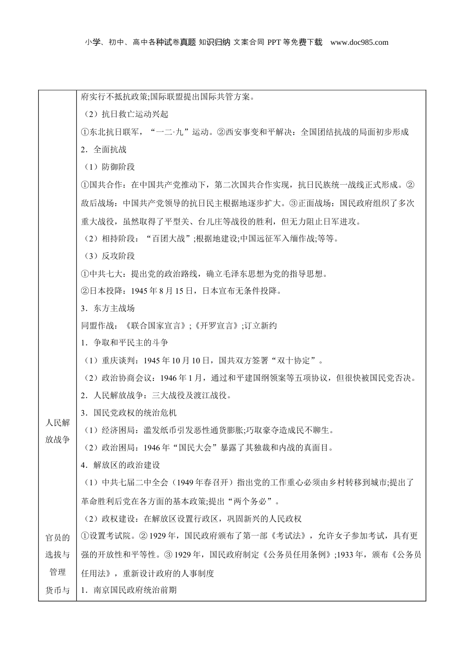 小、初中、高中各卷知文案合同学种试真题识归纳PPT等免下费载www.doc985.com专题八探索与胜利——中国共产党成立与新民主主义革命内容导航01阶段特征02知识整合03易错概念04重难深化05专题训练从五四运动到中华人民共和国的成立(1919—1949年),是中国历史上的新民主主义革命时期,这一时期是中国无产阶级及其代表中国共产党领导中国人民争取反帝反封建斗争胜利的时期,也是中国近代化曲折前进的时期。最终中国共产党领导中国人民推翻了三座大山,取得了反帝反封建斗争的胜利。政治五四运动揭开了中国新民主主义革命的新篇章;中国共产党从诞生到逐渐走向成熟,领导中国人民开辟了农村包围城市、武装夺取政权的正确革命道路,取得了抗日战争和解放战争的胜利,完成了反帝反封建的革命任务经济在农村,中国共产党领导农民阶级开展了土地改革运动;在城市,国民政府统治前期,民族工业获得了一定程度的发展,抗日战争和解放战争时期,民族资本主义遭到严重破坏思想文化孙中山将旧三民主义发展为新三民主义,新三民主义成为国共合作的政治基础;马克思主义在中国广泛传播,毛泽东思想形成,成为中国民主革命的指导思想,推动了中国民主革命的发展中共七大确立毛泽东思想为党的指导思想。小、初中、高中各卷知文案合同学种试真题识归纳PPT等免下费载www.doc985.com毛泽东发表《论人民民主专政》,丰富了马克思主义理论,为新中国的成立作了理论准备。社会生活社会物质生活、交通通信事业、影视事业在国民政府统治前期都得到一定程度的发展,在抗日战争和解放战争时期发展停滞(一)国家制度与社会治理方面南京国民政府的统治1.“宁汉合流”:1927年秋,中国国民党专制统治确立。2.继续北伐:1928年,南京国民政府继续北伐,讨伐张作霖。3.改旗易帜:1928年年底,张学良改旗易帜,国民政府在形式上基本统一了全国新民主主义革命的兴起1.五四运动:是一场反帝反封建的伟大爱国革命运动、伟大社会革命运动、伟大思想启蒙运动,是中国旧民主主义革命走向新民主主义革命的转折点,具有里程碑意义。2.中国共产党的诞生:1921年,中国共产党成立,这是一个开天辟地的大事变,给中国革命指明了方向。3.国民革命:1924—1927年,基本推翻了北洋军阀的统治。4.工农武装割据开辟革命新道路(1)武装反抗之路①南昌起义:打响了武装反抗国民党反动派的第一枪。②八七会议:确定了实行土地革命和武装反抗国民党反动派的总方针。③秋收起义:为中国革命重心从城市转入农村揭开了序幕。(2)井冈山革命根据地开辟:点燃了“工农武装割据”的星星之火。(3)“工农武装割据”理论与实践①古田会议确立了“思想建党,政治建军”的建党建军原则。②1931年11月,中华苏维埃共和国临时中央政府成立,这是创建人民革命政权的尝试。③土地革命:“打土豪,分田地”。(4)红军长征(1934年10月-1936年10月)抗日战争1.局部抗战(1)日本侵华①表现:九一八事变、一·二八事变、“华北事变”、七七事变等。②国内外的反应:国民政小、初中、高中各卷知文案合同学种试真题识归纳PPT等免下费载www.doc985.com府实行不抵抗政策;国际联盟提出国际共管方案。(2)抗日救亡运动兴起①东北抗日联军,“一二·九”运动。②西安事变和平解决:全国团结抗战的局面初步形成2.全面抗战(1)防御阶段①国共合作:在中国共产党推动下,第二次国共合作实现,抗日民族统一战线正式形成。②敌后战场:中国共产党领导的抗日民主根据地逐步扩大。③正面战场:国民政府组织了多次重大战役,虽然取得了平型关、台儿庄等战役的胜利,但无力阻止日军进攻。(2)相持阶段:“百团大战”;根据地建设;中国远征军入缅作战;等等。(3)反攻阶段①中共七大:提出党的政治路线,确立毛泽东思想为党的指导思想。②日本投降:1945年8月15日,日本宣布无条件投降。3.东方主战场同盟作战:《联合国家宣言》;《开罗宣言》;订立新约人民解放战争1.争取和平民主的斗争(1)重庆谈判:1945年10月10日,国共双方签署“双十协定”。(2)政治协商会议:1946年1月,通过和平建国纲领案等五项协议,但很快被国民党否决。2.人民解放战争:三大战...