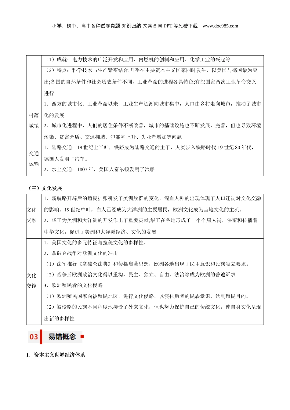 小、初中、高中各卷知文案合同学种试真题识归纳PPT等免下费载www.doc985.com专题十三转型与独立——工业革命与亚非拉民族独立运动内容导航01阶段特征02知识整合03易错概念04重难深化05专题训练从工业革命到一战之前(18世纪60年代到19世纪末20世纪初),是资本主义的工业化时期,资本主义制度在世界范围内广泛确立,世界殖民体系最终形成,工业文明时代到来。19世纪中后期,西方列强掀起了瓜分世界的狂潮,把亚洲和非洲的广大地区变成了它们的殖民地或半殖民地。资本主义列强与殖民地半殖民地的矛盾空前激化,殖民地半殖民地人民争取民族独立的斗争不断高涨政治工业革命后,资产阶级发起或影响下的自由民主革命和改革运动风起云涌,资产阶级代议制度不断发展和完善,资本主义在世界范围内确立了统治地位;文官制度在欧美各国逐渐形成。社会主义运动蓬勃发展,巴黎公社是无产阶级建立政权的第一次伟大尝试经济工业革命后机器大生产取代工场手工业,人类进入“蒸汽时代”;第二次工业革命又推动垄断组织成为主要的生产组织形式,人类进入“电气时代”,世界市场最终形成。城市化进程加快,人们的社会生活不断发生变化思想工业革命后,自由主义、社会主义和民族主义三大社会思潮相互交织,推动了19世纪资产阶小、初中、高中各卷知文案合同学种试真题识归纳PPT等免下费载www.doc985.com文化级革命以及改革运动、民族独立运动、国际社会主义运动等不断高涨国际关系(1)资本主义世界体系形成①资本主义政治体系:资本主义制度在世界范围内普遍确立;②资本主义经济体系:20世纪初,资本主义世界市场最终形成;③资本主义世界殖民体系:19世纪中后期,资本主义开始向帝国主义过渡;20世纪初,资本主义世界殖民体系最终形成。(2)亚非拉地区民族民主运动兴起。(一)国家制度与社会治理方面政治制度1.资本主义制度的扩展:俄国农奴制改革;美国内战;意大利统一;德意志统一;日本明治维新。2.马克思主义诞生的标志:1848年《共产党宣言》的发表。3.国际工人运动的发展:第一国际与巴黎公社。4.亚非拉民族独立运动:西方的殖民统治激化了亚非拉地区的民族矛盾和社会矛盾,并由此掀起了民族、民主运动官员的选拔与管理西方文官制度的建立:1.英国是西方最早建立文官制度的国家。2.1883年,美国通过《美国文官法》,建立了文官制度。第二次世界大战后,法国、德国、日本等国的文官制度也最终建立起来基层治理与社会保障1.1835年,英国颁布法律,确立了英国近代自治市制度。2.美国基本保持了地方自治的传统,乡镇是最基本的地方自治单位,承担着除司法之外的所有公共服务功能。3.法国大革命后,形成了以自治市镇为基层单位的制度(二)经济与社会生活方面工业革命1.第一次工业革命:开始于棉纺织业,蒸汽机的改良和广泛使用是第一次工业革命的主要标志,也是生产技术史上的一次飞跃。19世纪中期,英国的机器制造业实现了机械化,标志着英国第一次工业革命的完成。2.第二次工业革命小、初中、高中各卷知文案合同学种试真题识归纳PPT等免下费载www.doc985.com(1)成就:电力技术的广泛开发和应用、内燃机的创制和应用、化学工业的兴起等(2)特点:科学技术与生产紧密结合;几乎在主要资本主义国家同时发生,以美国与德国最为突出;各国的自然条件和社会历史条件不同,工业革命的进程各具特色;有些国家两次工业革命交叉进行村落城镇1.西方的城市化:工业革命以来,工业生产逐渐向城市集中,人口由乡村走向城市,推动了城市化的发展。2.城市化进程中,人们的居住条件不断改善,城市的基础设施也不断发展、完善,但也导致环境污染、贫富矛盾、交通拥堵、犯罪率上升、失业者增加等问题交通运输1.陆路交通:19世纪上半叶,铁路成为陆路交通的主干,人类步入铁路时代;19世纪80年代,德国人发明了汽车。2.水上交通:1807年,美国人富尔顿发明了汽船(三)文化发展文化交融1.新航路开辟后的殖民扩张引发了美洲族群的变化,混血人种的出现体现了人口迁徙对文化交融的影响。19世纪中叶,白人已经成为大洋洲的主要居民,欧洲文化成为当地文化的主流。2.华工为美洲和大洋洲的开发作出了重要贡献...