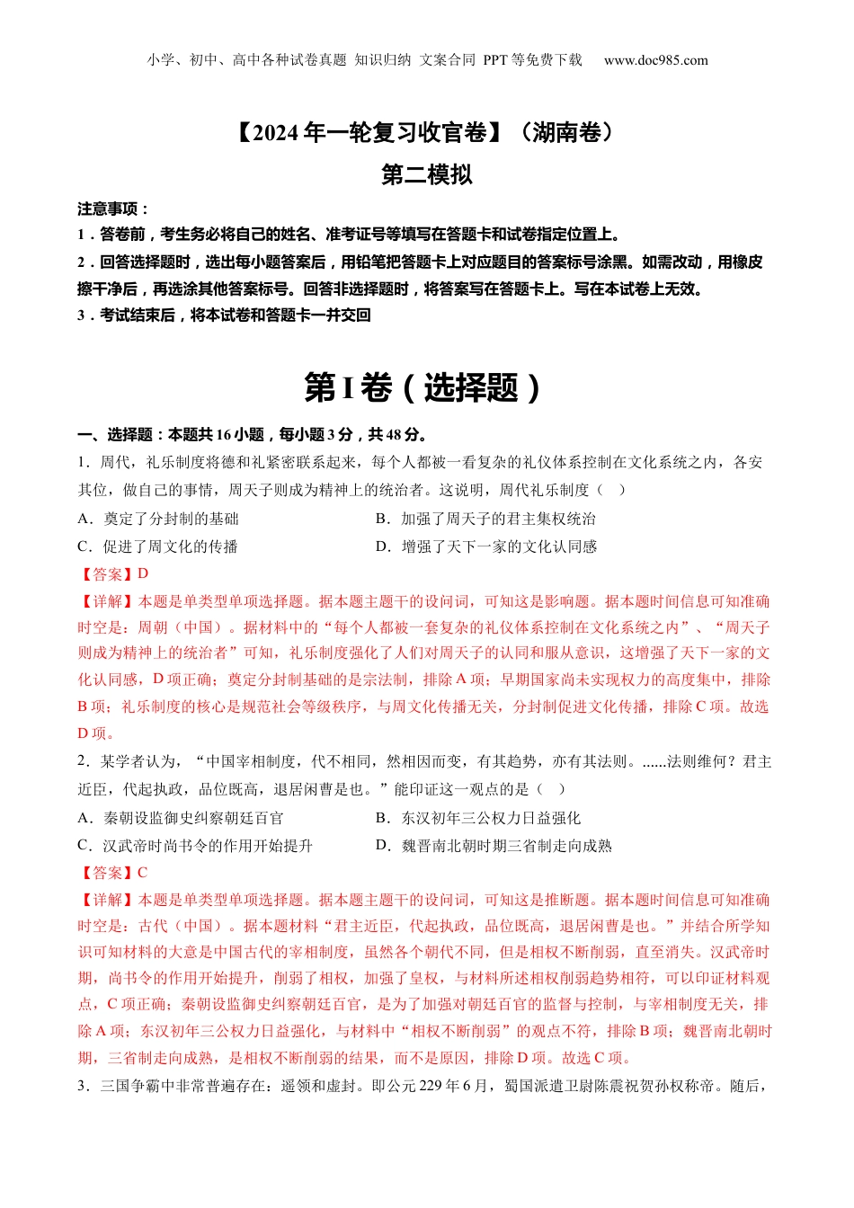 小学、初中、高中各种试卷真题知识归纳文案合同PPT等免费下载www.doc985.com【2024年一轮复习收官卷】(湖南卷)第二模拟注意事项:1.答卷前,考生务必将自己的姓名、准考证号等填写在答题卡和试卷指定位置上。2.回答选择题时,选出每小题答案后,用铅笔把答题卡上对应题目的答案标号涂黑。如需改动,用橡皮擦干净后,再选涂其他答案标号。回答非选择题时,将答案写在答题卡上。写在本试卷上无效。3.考试结束后,将本试卷和答题卡一并交回第I卷(选择题)一、选择题:本题共16小题,每小题3分,共48分。1.周代,礼乐制度将德和礼紧密联系起来,每个人都被一看复杂的礼仪体系控制在文化系统之内,各安其位,做自己的事情,周天子则成为精神上的统治者。这说明,周代礼乐制度()A.奠定了分封制的基础B.加强了周天子的君主集权统治C.促进了周文化的传播D.增强了天下一家的文化认同感【答案】D【详解】本题是单类型单项选择题。据本题主题干的设问词,可知这是影响题。据本题时间信息可知准确时空是:周朝(中国)。据材料中的“每个人都被一套复杂的礼仪体系控制在文化系统之内”、“周天子则成为精神上的统治者”可知,礼乐制度强化了人们对周天子的认同和服从意识,这增强了天下一家的文化认同感,D项正确;奠定分封制基础的是宗法制,排除A项;早期国家尚未实现权力的高度集中,排除B项;礼乐制度的核心是规范社会等级秩序,与周文化传播无关,分封制促进文化传播,排除C项。故选D项。2.某学者认为,“中国宰相制度,代不相同,然相因而变,有其趋势,亦有其法则。法则维何?君主……近臣,代起执政,品位既高,退居闲曹是也。”能印证这一观点的是()A.秦朝设监御史纠察朝廷百官B.东汉初年三公权力日益强化C.汉武帝时尚书令的作用开始提升D.魏晋南北朝时期三省制走向成熟【答案】C【详解】本题是单类型单项选择题。据本题主题干的设问词,可知这是推断题。据本题时间信息可知准确时空是:古代(中国)。据本题材料“君主近臣,代起执政,品位既高,退居闲曹是也。”并结合所学知识可知材料的大意是中国古代的宰相制度,虽然各个朝代不同,但是相权不断削弱,直至消失。汉武帝时期,尚书令的作用开始提升,削弱了相权,加强了皇权,与材料所述相权削弱趋势相符,可以印证材料观点,C项正确;秦朝设监御史纠察朝廷百官,是为了加强对朝廷百官的监督与控制,与宰相制度无关,排除A项;东汉初年三公权力日益强化,与材料中“相权不断削弱”的观点不符,排除B项;魏晋南北朝时期,三省制走向成熟,是相权不断削弱的结果,而不是原因,排除D项。故选C项。3.三国争霸中非常普遍存在:遥领和虚封。即公元229年6月,蜀国派遣卫尉陈震祝贺孙权称帝。随后,小学、初中、高中各种试卷真题知识归纳文案合同PPT等免费下载www.doc985.com吴、蜀两国相约平分天下,在没有知会魏国的情况下,将魏国的豫州、青州、徐州、幽州划归吴国,兖州、冀州、并州、凉州划归蜀国,司州则以函谷关为界分属两国。这说明()A.制度创新加强中央集权B.冗官泛滥削弱统治力量C.分裂时期暗含统一因素D.郡县制度符合时代潮流【答案】C【详解】本题是单类型单项选择题。据本题主题干的设问词,可知这是本质题。据本题时间信息可知准确时空是:三国(中国)。据本题材料概括得出主要结论是:三国时期,各国政权常用遥领和虚封的做法,对非本国土地行使象征性的统治行为,说明分裂时期暗含统一因素,C项正确;对不属于本国的土地进行遥领和虚封,不能加强中央集权,排除A项;遥领和虚封非本国土地,不会造成冗官泛滥削弱统治力量的结果,排除B项;材料没有体现郡县制度符合时代潮流的信息,排除D项。故选C项。4.九品中正制之中正官最初由各郡长官推举产生,晋以后,改由朝廷三公中的司徒选授。其中郡的小中正官可由州中的大中正官推举,但仍需经司徒任命。在一般情况下,州郡的大小中正官是由司徒举荐的现任中央官员兼任,有时,司徒或吏部尚书还直接兼任州的大中正官。据此可知()A.门阀士族势力较为强大B.君主的权力受到削弱C.中央选举权利得到加强D.社会阶层流动性加强【答案】C【详解】本题...