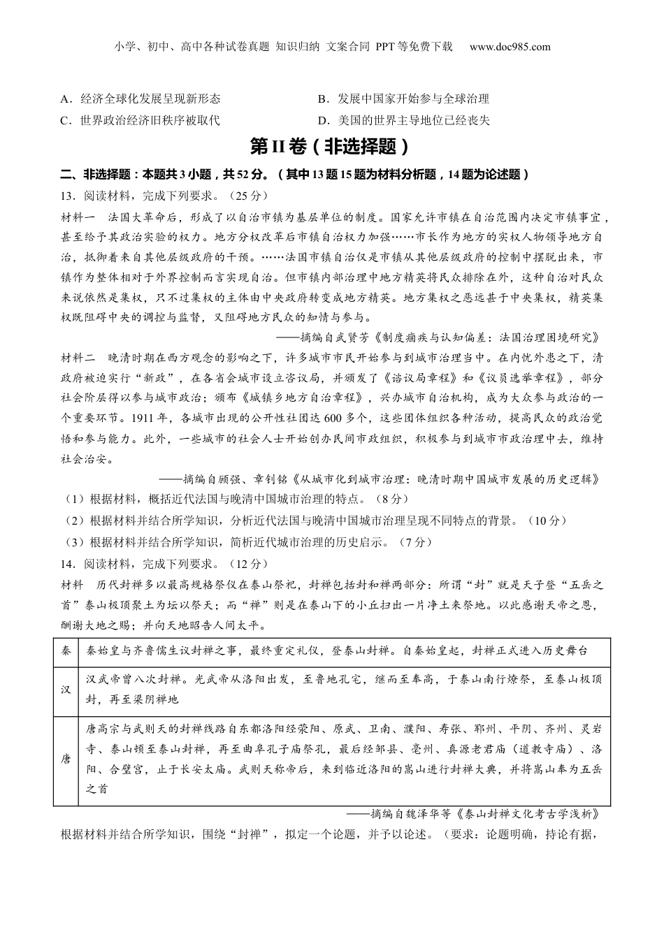 小学、初中、高中各种试卷真题知识归纳文案合同PPT等免费下载www.doc985.com【2024年一轮复习收官卷】(全国新课标卷)第二模拟注意事项:1.答卷前,考生务必将自己的姓名、准考证号等填写在答题卡和试卷指定位置上。2.回答选择题时,选出每小题答案后,用铅笔把答题卡上对应题目的答案标号涂黑。如需改动,用橡皮擦干净后,再选涂其他答案标号。回答非选择题时,将答案写在答题卡上。写在本试卷上无效。3.考试结束后,将本试卷和答题卡一并交回第I卷(选择题)一、选择题:本题共12小题,每小题4分,共48分。1.距今1万多年前的中国以炊器划分,长江流域为釜文化圈,淮河流域和黄土高原为三足器文化圈,燕山南北地区为筒形罐文化圈。各地区努力开展远距离交流,交流内容主要是原始宇宙观、天文历法、权力表达方式、丧葬和祭祀礼仪等当时最先进的文化精粹。据此可推知()A.炊具是中国最原始的文化形态B.中华文明起源具有多元一体的特征C.长江流域是饮食文化的发源地D.南北交流是文化多样性的主要原因2.《管子》中强调,五谷是“万物之主”,是“民之司命”。从这种认识出发,管仲在齐国担任丞相期间,把土地分给农户经营,提出了“均地分力”“相地而衰征”等鼓励开垦、发展农业的政策,根据土地的好坏贫瘠征收赋税。管仲的做法()A.奠定了华夏农耕文明根基B.强化了丞相赋税管理职能C.加速了西周礼乐制度崩溃D.承认了土地私有的合法性3.如图是南阳汉画像石《投壶》(古代士大夫宴饮时做的一种投掷游戏)。画面中间两个人正在投壶喝酒,左边的人眼皮下垂给人以昏沉之感;右边的人眼睛圆睁,精神正足。从两个人面部的刻画来看,两个人的正侧面都存在于同一张脸上。该作品反映了()A.时代特征影响绘画特色B.古代艺术与现代主义的融合C.艺术创作源于丰富想象D.史料价值与艺术审美的统一4.明清时期,西南土司的承袭方式有两种:一是“赴京告袭”,即土司亲自或遣人赴京请求承袭,其显著特点是将承袭与朝贡结合;二是“就彼冠带”,即土司在地方请求承袭,但土司承袭时需按品秩向中央纳粮。到清康熙时期,“就彼冠带”被正式确立为土司的承袭方式。雍正年间,进行了一次较大规模的改土归流,同时采取了一系列措施。这些变化反映出()A.边疆地区经济得到稳定的发展B.西南地区土司权力逐步扩大C.中央对西南土司的管控不断加强D.西南地区开始实行“编户齐民”政策小学、初中、高中各种试卷真题知识归纳文案合同PPT等免费下载www.doc985.com5.1912年3月,上海《时报》报道:南京政府进行服饰改革后,“绸缎铺估衣店闭门贴招,盘外国细呢,西式新衣,列肆相望,无论何店,皆高悬西式帽”。据此可知,当时的服饰改革()A.不利于民族工业的发展B.导致了传统服饰的消亡C.得到广大民众广泛支持D.推动了社会新风尚形成6.1953年3月1日中央人民政府公布施行《中华人民共和国全国人民代表大会及地方各级人民代表大会选举法》,此后全国共选出基层人大代表566万余名,在此基础上,选举产生出全国人大代表1226名。该部法律的实施()A.巩固了社会主义制度B.建立起基层群众自治制度C.践行人民民主的原则D.由全国人民代表大会决定7.从全国发展脉络看,1949年之前,我国没有一个城市GDP超过百亿元;1986年之前,我国也没有一个城市GDP达到千亿元,但到了2021年,我国万亿GDP城市已达到24个。数量较多的万亿GDP城市的出现反映了()A.建国后我国城市化进程加快B.优先发展重工业的战略凸显优势C.改革开放激发了活力与创新D.社会主义市场经济体制的优越性8.位于地中海南岸的尼罗河三角洲气候炎热,服饰以亚麻为主;而居地中海北岸的古希腊气候较冷,羊毛服饰占据主流。亚历山大东征后,埃及的妇女也穿羊毛披肩,希腊人的穿戴中波斯、埃及的服饰元素也较为普遍。这说明()A.地中海阳隔导致南北两岸文化差异B.碰撞促进了区域间文化的交流C.亚历山大东征促进埃及文明的进步D.亚历山大推行希腊化成效突出9.日耳曼人在西罗马帝国的废墟上建立了诸多国家,其中法兰克王国逐渐发展壮大。800年,查理被教皇利奥三世加冕为“神圣罗马皇帝”,其时他统治下的法兰克王国...