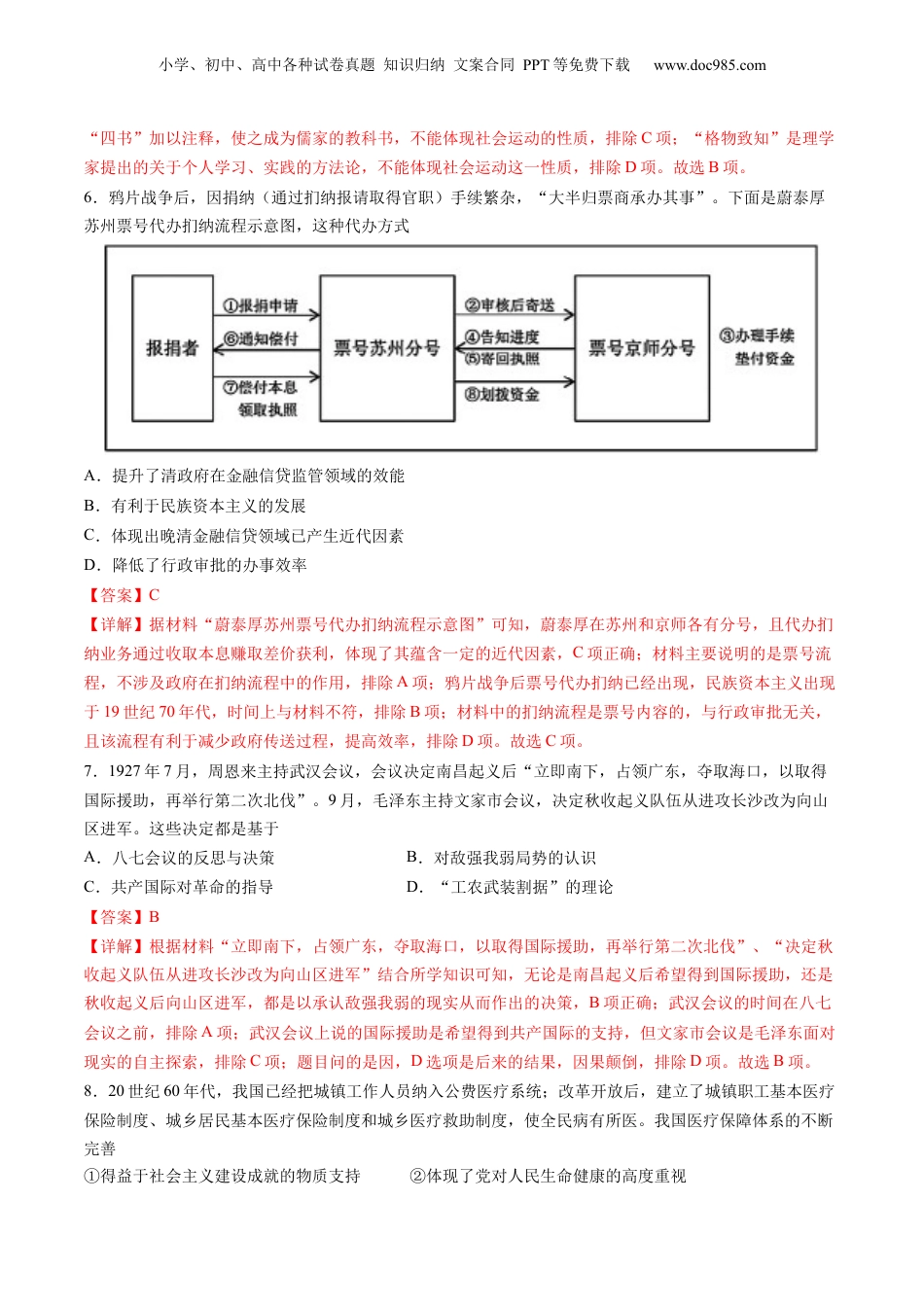 小学、初中、高中各种试卷真题知识归纳文案合同PPT等免费下载www.doc985.com【2024年一轮复习收官卷】(浙江卷)第二模拟注意事项:1.答卷前,考生务必将自己的姓名、准考证号等填写在答题卡和试卷指定位置上。2.回答选择题时,选出每小题答案后,用铅笔把答题卡上对应题目的答案标号涂黑。如需改动,用橡皮擦干净后,再选涂其他答案标号。回答非选择题时,将答案写在答题卡上。写在本试卷上无效。3.考试结束后,将本试卷和答题卡一并交回第I卷(选择题)一、选择题I(本大题共15小题,每小题2分,共30分。每小题列出的四个备选项中只有一个是符合题目要求的,不选、多选、错选均不得分)。1.史料分类和史料价值是史学研究的重要途径。下图是先秦不同时期文献记载的大禹治水区域范围变化情况。据图可知,先秦时期A.大禹治水一手史料不断丰富B.大禹治水传说和史料矛盾C.史料真伪需要考古文物印证D.研究对象的范围不断扩大【答案】C【详解】本题是单类型单项选择题。据本题主题干设问词,可知这是推断题,时空是先秦时期。根据材料“先秦不同时期文献记载的大禹治水区域范围变化情况”可知,不同文献对大禹治水的记载情况差异较大,说明先秦文献不能直观判断真伪,需要考古文物加以印证,C项正确;题干反映先秦文献关于大禹治水的区域范围扩大的记载,但不能说明这是大禹治水一手史料增加所致,排除A项;单凭文献记载的大禹治水的内容不能说明史料和大禹治水传说相矛盾,排除B项;图片显示西周到战国中期的文献记载有关大禹治水的区域范围不断扩大,说明对大禹治水所代表的华夏文明的认知不断增加,并不是研究对象的范围扩大,排除D项。故选C项。2.周礼规定国家举行祭祀大典或葬礼时,天子享用九鼎,诸侯享用七鼎。而在新郑郑公大墓(春秋时期)的祭祀坑遗址中却出土了“九鼎”。这一考古发现反映了当时A.尊卑等级关系受到冲击B.礼乐制度突破性发展C.封建政治制度初步形成D.奴隶社会手工业发达小学、初中、高中各种试卷真题知识归纳文案合同PPT等免费下载www.doc985.com【答案】A【详解】本题是单类型单项选择题。据本题主题干的设问词,可知这是本质题。据本题时间信息可知准确时空是:周朝(中国)。据材料可知,原本只有周王才能享用的“九鼎”出现在诸侯的祭祀坑中,表明等级森严的礼乐制度受到挑战,金字塔式的上下尊卑关系受到冲击,A项正确;当时礼乐制度并没有获得突破性发展,而是逐渐瓦解,排除B项;“初步形成”史实错误,封建政治制度初步形成是在战国后期,排除C项;材料强调的不是手工业的发展,排除D项。故选A项。3.汉文帝时“以御史不奉法,下失其职,乃谴丞相史出刺,并督监察御史”,但由于地方监察体制不健全,加之地方豪强势力的不断增长,汉景帝时,地方吏治已发展到“豪猾,二千石莫能制”的地步,直接威胁着政局的稳定。为此,汉武帝A.在郡一级设监御史专掌监察B.下令地方每年造计簿以作考核C.在中央设监察御史纠察百官D.分天下为十三州部设专员巡察【答案】D【详解】本题为单类型单项选择题。根据设问可知,这是推断题。时空范围为汉代(中国)。材料反映了汉初监察制度不健全和地方势力的抬头威胁着中央集权。为此,汉武帝将天下划分为13个州部,每州设刺史,依朝廷规定的监察法规纠举豪强和地方官员的不法行为,D项正确;秦朝在郡一级设监御史,负责监察,排除A项;秦汉官员的考核办法是上计制度,即要求地方制作计簿上交中央,这与材料信息不符,排除B项;监察御史是隋代开始设立的中央专门负责监察的官员,排除C项。故选D项。4.唐初藩镇节度使掌管所属地区军队,朝廷另外委派按察、安抚、度支、营田、转运各使管理其他事务,玄宗时按察、安抚、度支、营田、转运各使,都由节度使兼任。据此分析,这一变化A.缓解了冗官现象B.提高了地方行政效率C.减轻了边防压力D.加剧了外重内轻局面【答案】D【详解】本题是单类型单项选择题。据本题主题干的设问词,可知这是推断题。据本题时间信息可知准确时空是:唐朝(中国)。据材料可知,唐初藩镇节度使掌管所属地区军队,唐玄宗时按察、安抚、度支、营田、转运各使,都由节度使兼任,致使...
