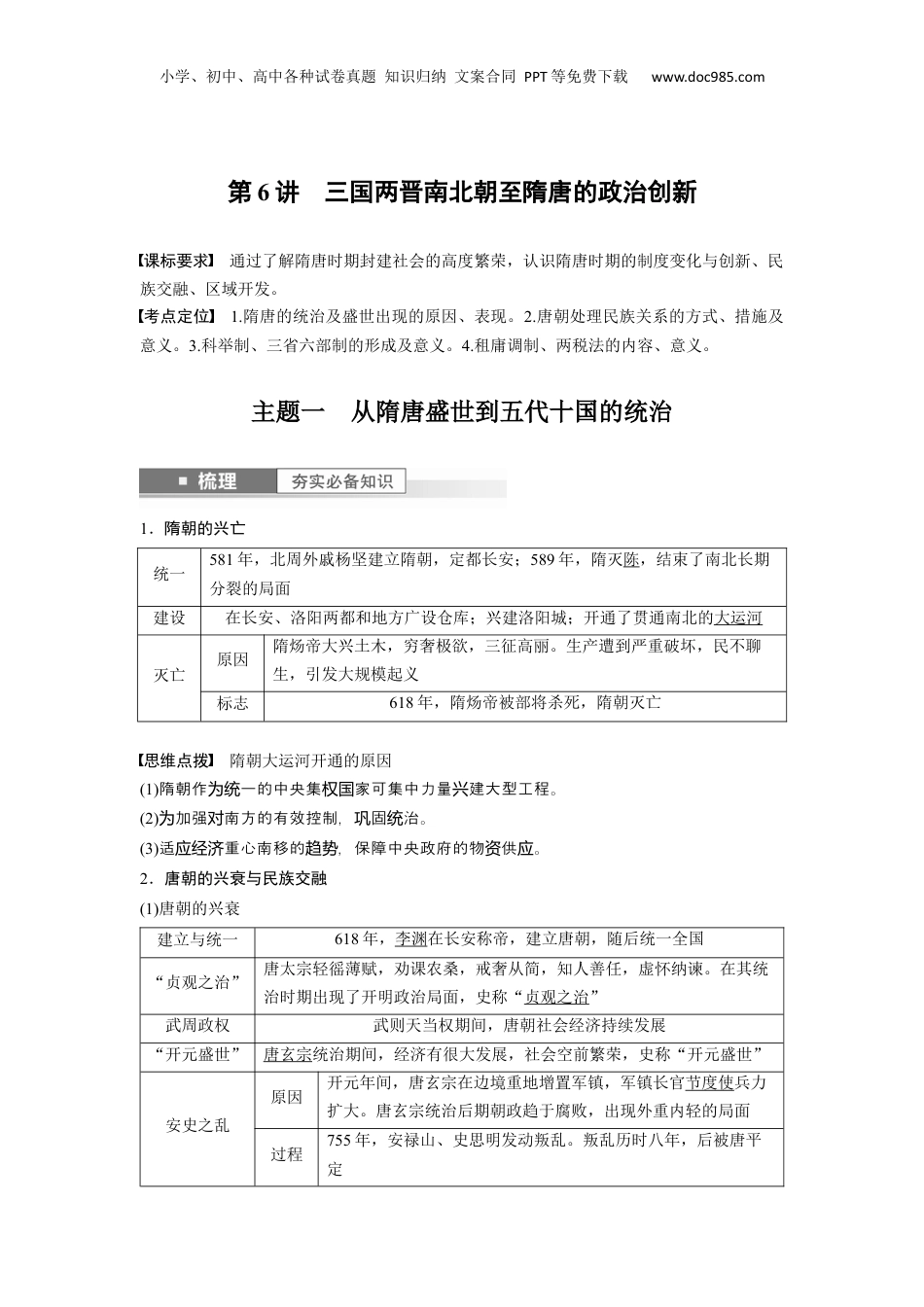 小学、初中、高中各种试卷真题知识归纳文案合同PPT等免费下载www.doc985.com第6讲三国两晋南北朝至隋唐的政治创新课标要求通过了解隋唐时期封建社会的高度繁荣,认识隋唐时期的制度变化与创新、民族交融、区域开发。考点定位1.隋唐的统治及盛世出现的原因、表现。2.唐朝处理民族关系的方式、措施及意义。3.科举制、三省六部制的形成及意义。4.租庸调制、两税法的内容、意义。主题一从隋唐盛世到五代十国的统治1.隋朝的兴亡统一581年,北周外戚杨坚建立隋朝,定都长安;589年,隋灭陈,结束了南北长期分裂的局面建设在长安、洛阳两都和地方广设仓库;兴建洛阳城;开通了贯通南北的大运河灭亡原因隋炀帝大兴土木,穷奢极欲,三征高丽。生产遭到严重破坏,民不聊生,引发大规模起义标志618年,隋炀帝被部将杀死,隋朝灭亡思维点拨隋朝大运河开通的原因(1)隋朝作一的中央集家可集中力量建大型工程。为统权国兴(2)加强南方的有效控制,固治。为对巩统(3)适重心南移的,保障中央政府的物供。应经济趋势资应2.唐朝的兴衰与民族交融(1)唐朝的兴衰建立与统一618年,李渊在长安称帝,建立唐朝,随后统一全国“贞观之治”唐太宗轻徭薄赋,劝课农桑,戒奢从简,知人善任,虚怀纳谏。在其统治时期出现了开明政治局面,史称“贞观之治”武周政权武则天当权期间,唐朝社会经济持续发展“开元盛世”唐玄宗统治期间,经济有很大发展,社会空前繁荣,史称“开元盛世”安史之乱原因开元年间,唐玄宗在边境重地增置军镇,军镇长官节度使兵力扩大。唐玄宗统治后期朝政趋于腐败,出现外重内轻的局面过程755年,安禄山、史思明发动叛乱。叛乱历时八年,后被唐平定小学、初中、高中各种试卷真题知识归纳文案合同PPT等免费下载www.doc985.com影响唐朝由盛转衰;藩镇割据局面在唐朝后期持续了100多年唐朝的灭亡唐朝后期,宦官专权和朋党之争加剧875年,黄巢领导的农民起义爆发,沉重地打击了唐朝的统治907年,朱温废唐称帝,国号梁,史称后梁思维点拨正确认识“藩镇割据”局面出现的原因唐朝“藩割据镇”局面的出唐玄宗治政策的失密切相,但不是根本原因,藩现与统误关这割据出的根本原因是封建的分散性。镇现经济(2)唐朝的民族关系北方(突厥、回纥)东突厥贞观初年,唐军俘获东突厥可汗,东突厥汗国灭亡。草原各族共同尊奉唐太宗为“天可汗”西突厥唐高宗联合回纥灭西突厥后突厥汗国682年,安置在北方的东突厥部众反叛唐朝,一度建立了后突厥汗国政权。744年,唐朝与漠北回纥、葛逻禄等联手平定了后突厥汗国西域唐朝中央政府先后设置安西都护府和北庭都护府回纥唐玄宗册封回纥首领骨力裴罗为怀仁可汗;后回纥助唐平定安史之乱西南(吐蕃)唐太宗时期文成公主入藏,唐蕃和亲9世纪前期唐蕃会盟东北(靺鞨)唐玄宗统治时期,东北的靺鞨族粟末部强大起来。唐玄宗封其首领大祚荣为渤海郡王概念阐释和亲和,也叫作亲“和戎”“和蕃”,是指中原王朝治者周少民族或各少民族首统与边数数领之出于各各的目的而成的一政治姻。作朝民族政策的一成部分和间种样达种联它为历个组民族系的一表形,穿于中古代史的展程中,史展有着重要的影关种现态贯国历发过对历发。响3.五代十国政权更迭唐朝灭亡后,黄河流域先后出现后梁、后唐、后晋、后汉、后周五个短命王朝,称为“五代”。南方各地先后出现吴越、南唐等九个割据政权,连同五代末期在山西建立的北汉,称为“十国”后周世宗改革努力清除五代弊政,实力逐渐增强,为后来北宋结束五代十国分裂局面奠定了基础小学、初中、高中各种试卷真题知识归纳文案合同PPT等免费下载www.doc985.com视角1隋唐的盛世局面材料以,可以正衣冠;以古,可以替;以人,可以知得失。铜为镜为镜见兴为镜(唐太宗治期统时)天下大稔,流散者咸里,斗米不三四,死刑才二十九人。至于归乡过钱终岁断东海,南及五岭,皆外不,行旅不粮,取于道路焉。户闭赍给——摘自司马光《资治通鉴》元初,四方丰稔,城商林立,客商如云。丁之夫,不兵器。安西悉平开镇铺壮识诸国郡,置,亘地万余里。为县开远门——《开元纪事》根据材料,说明隋朝灭亡与“贞观之治”局面的出现有何关系,并谈谈如何辩证认识“贞观之治...