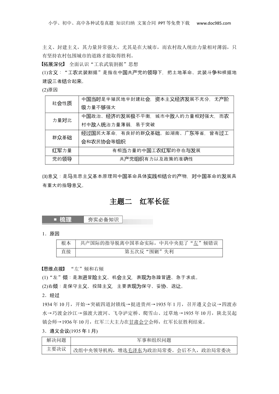 小学、初中、高中各种试卷真题知识归纳文案合同PPT等免费下载www.doc985.com第19讲中国共产党开辟革命新道路课标要求1.认识中国共产党开辟革命新道路的意义。2.认识红军长征的意义。考点定位1.“工农武装割据”道路是适合中国国情的革命道路,以及革命新道路开辟的意义。2.遵义会议是中国共产党由幼稚走向成熟的标志及长征精神。主题一工农武装割据开辟革命新道路1.发动武装起义南昌起义打响了武装反抗国民党反动派的第一枪八七会议总结了国民革命失败的教训,纠正了陈独秀的右倾机会主义错误,确定实行土地革命和武装反抗国民党反动派的总方针秋收起义起义军在进攻长沙途中受挫,决定改向敌人统治力量薄弱的山区进军2.开辟井冈山革命根据地井冈山根据地的建立1927年10月,毛泽东率领秋收起义的部队到达井冈山,开始创建第一个农村革命根据地;1928年,朱德、陈毅率领的革命队伍和毛泽东领导的工农革命军在井冈山会师意义点燃了“工农武装割据”的星星之火。从此,中国革命走上了建立农村革命根据地,以农村包围城市,武装夺取政权的道路概念阐释城市中心革命论城市中心革命是指以大城市中心,通攻打大城市以取政的革命道路。城市中心论为过夺权革命道路原是俄十月革命所走的一革命道路,是克思主俄情相合的物国条马义与国国结产民革命失后,中共党的南昌起、秋收起和广州起就是一革命道路的国败国产领导义义义这,果明,城市中心革命中情不符。实践结证论与国国3.工农武装割据的实践武装斗争到1930年夏,全国已经建立起大小十几块农村革命根据地,分布在十多个省,革命武装力量达十万人土地革命各农村革命根据地逐步开展土地革命,“打土豪,分田地”根据地建设1931年11月,中华苏维埃第一次全国代表大会在江西瑞金召开,宣布成立中华苏维埃共和国临时中央政府小学、初中、高中各种试卷真题知识归纳文案合同PPT等免费下载www.doc985.com图解历史“工农武装割据”三大要素的内在关系思维点拨井山道路模式是符合中情的革命道路。中的情是民占人口的大多,而冈与国国国国农绝数民党是大地主、大的政党,不重工尤其是民,其治力量主要集中在城国资产阶级视农农统市,中共党展土地革命民,建立工武装,在村建立根据地才是革命的出国产开发动农农农路。4.中国共产党在革命根据地的制度探索(必选1,P16)(1)背景:中国共产党领导建立起大小十几块农村革命根据地;各级苏维埃政权陆续建立起来。(2)探索①中华苏维埃第一次全国代表大会制定了宪法大纲,通过了土地法、劳动法等法令,宣布中华苏维埃共和国临时中央政府正式成立。②宪法大纲规定,苏维埃政权属于工人、农民、红军士兵及一切劳苦大众。③大会推选毛泽东为临时中央政府主席。(3)意义:中华苏维埃共和国临时中央政府的成立,是创建人民革命政权的尝试。视角中国民主革命道路的探索材料中革命采取什斗形式和走什道路,是有不同意的:对国么争么当时见一意是:种见“、游和色域的建立和展,是半殖民地中在无红军击队红区发国产阶级领之下的民斗的最高形式,和半殖民地民斗展的必然果;且无疑地是促导农争农争发结并义全革命高潮的最重要因素进国……”另一意是:种见1928年中共六大通的《政治案》指出:各省自的民游过议决发农击战,只有和争“无的城市的新的革命高潮相起产阶级联结来”,才可能成变“全利的民暴国胜众的出点动发”。材料反映了哪两种革命道路?你同意哪一种意见?为什么?试答:__________________________________________________________________________________________________________________________________________________答案道路:第一种意见反映了农村包围城市、武装夺取政权的革命道路;第二种意见反映了以城市为中心的俄国式革命道路。同意第一种意见。原因:中国是一个半殖民地半封建国家,对内没有民主制度,受封建主义压迫,对外没有民族独立;中国革命对象是帝国小学、初中、高中各种试卷真题知识归纳文案合同PPT等免费下载www.doc985.com主义、封建主义,其力量异常强大,尤其是在大城市,而农村敌人统治力量相对薄弱,只有坚持农村包围城市的道路才能取得胜利。拓展深化全面认识“工农...