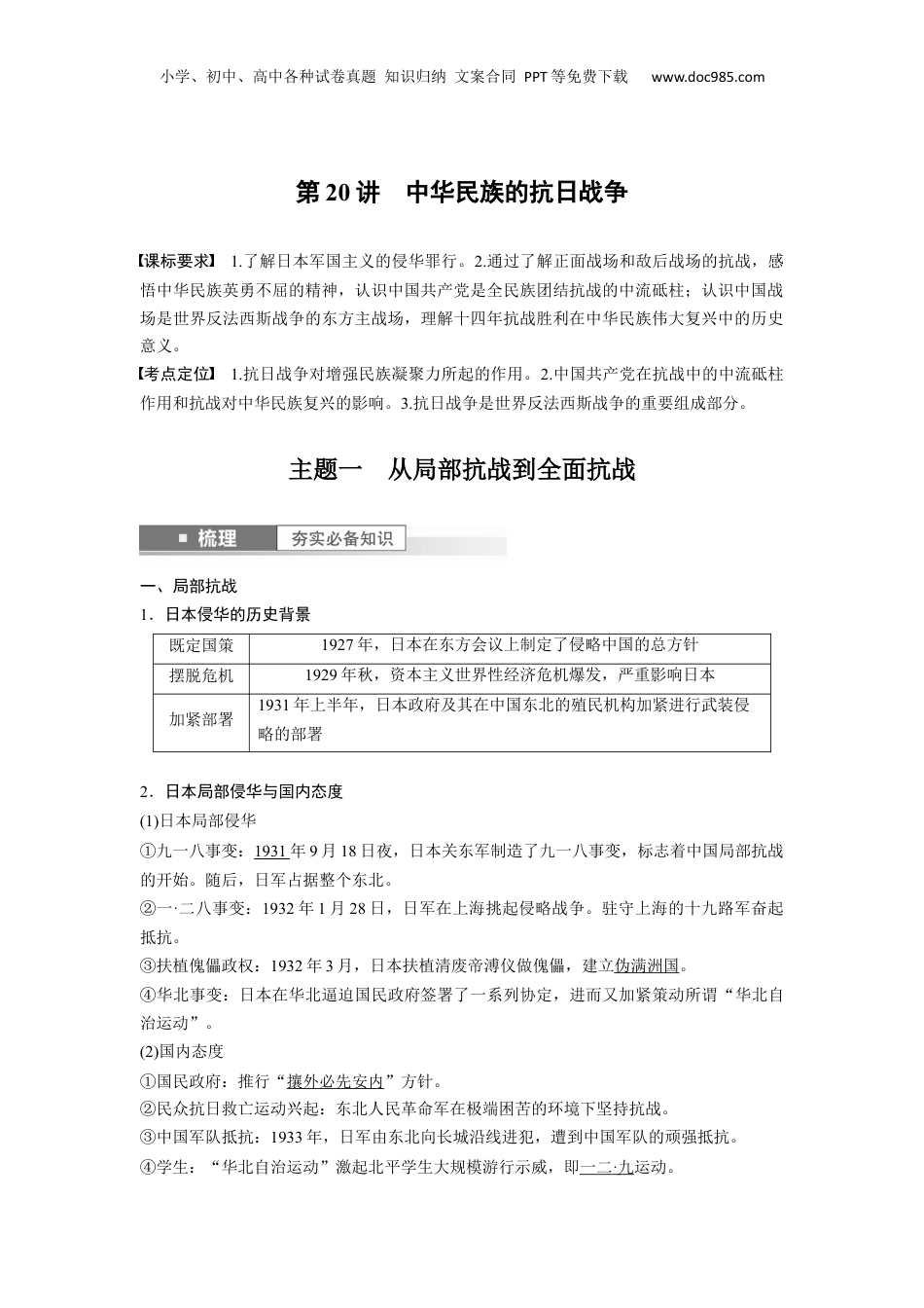 小学、初中、高中各种试卷真题知识归纳文案合同PPT等免费下载www.doc985.com第20讲中华民族的抗日战争课标要求1.了解日本军国主义的侵华罪行。2.通过了解正面战场和敌后战场的抗战,感悟中华民族英勇不屈的精神,认识中国共产党是全民族团结抗战的中流砥柱;认识中国战场是世界反法西斯战争的东方主战场,理解十四年抗战胜利在中华民族伟大复兴中的历史意义。考点定位1.抗日战争对增强民族凝聚力所起的作用。2.中国共产党在抗战中的中流砥柱作用和抗战对中华民族复兴的影响。3.抗日战争是世界反法西斯战争的重要组成部分。主题一从局部抗战到全面抗战一、局部抗战1.日本侵华的历史背景既定国策1927年,日本在东方会议上制定了侵略中国的总方针摆脱危机1929年秋,资本主义世界性经济危机爆发,严重影响日本加紧部署1931年上半年,日本政府及其在中国东北的殖民机构加紧进行武装侵略的部署2.日本局部侵华与国内态度(1)日本局部侵华①九一八事变:1931年9月18日夜,日本关东军制造了九一八事变,标志着中国局部抗战的开始。随后,日军占据整个东北。②一·二八事变:1932年1月28日,日军在上海挑起侵略战争。驻守上海的十九路军奋起抵抗。③扶植傀儡政权:1932年3月,日本扶植清废帝溥仪做傀儡,建立伪满洲国。④华北事变:日本在华北逼迫国民政府签署了一系列协定,进而又加紧策动所谓“华北自治运动”。(2)国内态度①国民政府:推行“攘外必先安内”方针。②民众抗日救亡运动兴起:东北人民革命军在极端困苦的环境下坚持抗战。③中国军队抵抗:1933年,日军由东北向长城沿线进犯,遭到中国军队的顽强抵抗。④学生:“华北自治运动”激起北平学生大规模游行示威,即一二·九运动。小学、初中、高中各种试卷真题知识归纳文案合同PPT等免费下载www.doc985.com⑤中国共产党:1936年,中国共产党领导的东北抗日联军牵制了大量日军。思维点拨九一八事志着中日民族矛盾始上升,而北事志着中日民族矛盾上升中变标开华变则标为国社的主要矛盾,是中共党整斗策略的根本依据,也是抗日救亡高会这国产调争国内运动涨的根源。3.西安事变背景红军长征到达陕北后,蒋介石调集包括张学良的东北军和杨虎城的西北军在内的军队围攻陕北。在中共抗日民族统一战线政策的感召下,张学良和杨虎城在西北地区实行联共抗日经过1936年12月12日,张学良、杨虎城在劝说蒋介石抗日失败后,发动“兵谏”,扣留蒋介石,以武力逼蒋抗日结果中共中央确定了和平解决西安事变的方针,蒋介石被迫接受停止内战、联共抗日的主张意义西安事变的和平解决,促进了中共中央联蒋抗日方针的实现。十年内战的局面基本结束,全国团结抗战的局面初步形成二、抗日民族统一战线的形成1.全面抗战开始:1937年7月7日,日军制造卢沟桥事变,中国全面抗战由此开始。2.抗日民族统一战线的建立通电全国和庐山谈话1937年7月8日,中国共产党通电全国,呼吁全民族抗战。1937年7月17日,蒋介石在庐山发表了准备抗战的讲话洛川会议和红军改编洛川会议上通过了《关于目前形势与党的任务的决定》和《中国共产党抗日救国十大纲领》,标志着中国共产党全面抗战路线的形成。红军主力正式改编为国民革命军第八路军,南方八省的红军游击队改编为国民革命军新编第四军公布宣言和合作实现1937年9月,国民党中央通讯社发表了中国共产党提出的国共合作抗战宣言。蒋介石承认中国共产党的合法地位,国共第二次合作实现概念阐释党内合作与党外合作(1)党合作:是第一次共合作的方式。所党合作,是指共党以人身加入内国谓内产员个份国民党,共党的合作在民党一党部行。国两国内进(2)党外合作:是第二次共合作的方式。所党外合作,是指共党有一到任何一国谓国两没统政党部,而是立政党行合作。个内两个独进三、日军的侵华暴行1.制造屠杀:1937年12月,日军攻陷南京,制造了惨绝人寰的南京大屠杀。2.殖民统治小学、初中、高中各种试卷真题知识归纳文案合同PPT等免费下载www.doc985.com政治侵略实行“以华制华”方针,在占领区扶植傀儡政权。1940年3月,汪精卫在南京成立伪国民政府,并签订大量卖国协定经济掠夺实行“以战养战”。垄断沦陷区工矿、金融、交通业...
