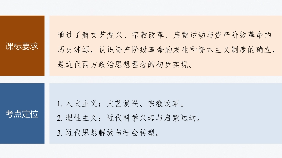 走向整体的世界本主制度的与资义建立第十一单元洲的思想解放欧运动第30讲课标要求通过了解文艺复兴、宗教改革、启蒙运动与资产阶级革命的历史渊源,认识资产阶级革命的发生和资本主义制度的确立,是近代西方政治思想理念的初步实现。考点定位1.人文主义:文艺复兴、宗教改革。2.理性主义:近代科学兴起与启蒙运动。3.近代思想解放与社会转型。主题一文艺复兴与宗教改革主题二近代科学与启蒙运动落实典题演练课时精练内容导航文宗改革艺复兴与教主一题一、文艺复兴1.背景(1)根本原因:西中世期本主生系的萌芽。欧纪晚资义产关(2)文化基:西文化自身的承展,丰厚的础欧传与发____________文化淀,又方汲取了大量文化料。积从东养(3)人才:聚集了一批具有新思想的者文人。优势学夯必知实备识梳理古希腊罗马2.实质:立符合新需要的新文化。创兴资产阶级3.精神内核:人文主义(1)以人中心而不是以神中心,提升人的地位,肯定人的价和尊。为为值严(2)反对_________,抨腐和守思想,崇理性。击教会败旧尚(3)重人的才智和造力,追求视发挥创_________的幸福生活。(4)提倡探索人自然的秘。与奥禁欲主义世社现会域领人物特点文三杰学薄伽丘刺的封建腐朽,宣人性的自由讽教会扬_____彼特拉克美三杰术________用高超的表手法,突破了中世呆运艺术现纪板僵硬的格,描世生活,展人物的风绘现现心世界内拉斐尔米朗琪开罗4.成就(1)意大利但丁达·芬奇(2)英:莎士比的《国亚_________》《李尔王》等,充分体了人文主现的政治理想和道德念。义观5.影响:在一定程度上冲了封建秩序,解放了期被宗戒律抑和击长教压禁的人性,使人始更多地注人本身世世界。锢们开关与现哈姆雷特人文主义者与宗教信仰文期的代表人物斗的矛指向天主,但不反艺复兴时将争头教会并宗信仰。文期的代表人物也是信仰宗的,只是反对教艺复兴时教宣的禁欲苦行,抨的腐。文期的思想对教会扬击教会败艺复兴时家力持和解的度,不愿走上宗改革的道路。对教会势态教思点维拨二、宗教改革1.背景(1)文使天主的威受到越越多的疑。艺复兴教会权来质(2)人廷的期日益不。们对罗马教长盘剥满序幕1517年,丁马·路德撰了《写_____________》丁马·路德宗改教革主张改革:人的魂救靠自己的信仰,不靠的教义灵获烦琐宗式;上帝面前人人平等教仪改革:主建立立的民族和廉,力教会张独教会俭教会主用民族言行宗活语进教动果结形成了新中的路德派教宗改革教的展扩西其他一些家也行宗改革,建立了立于廷欧国进教独罗马教的新,其中瑞士的教__________和英的影最大国国教响2.过程九十五条论纲加尔文派3.影响(1)一步解放了人的思想,播和展了人文主。进们传发义(2)有利于洲本主的成。欧资义长(3)推了洲动欧__________的形成和文化育事的展。教业发民族家国马丁·路德的主张所体现的人文主义精神丁马·路德只要有虔的信仰,魂便可以得救;每基督认为诚灵个徒都可以直接和解《》,而不是盲目听皇和阅读释圣经从教教会的。一思想使人得精神上的自由和魂得救的自主,说教这获灵权有明的人文主色彩。带鲜义思点维拨角视1文艺复兴与“人”的解放材料一于不同代的特定社之,近代西方社和古代希腊处时两个会间会社,我察到了的特征,我可以系会们观连续们将这种连续关喻为“血缘”系。雅典民主政治在家政治原、家力的形式、家策关国则国权组织国决方式和公、任期等方面近代西方民主政治生了深刻的影职选举对产积极;以人文主核心具有人文精神的智者、文和蒙,响义为运动艺复兴启运动是西方思想史上三大思想解放,有则运动关“人”的解放因此成人文主为的核心容。义内——摘自编[英]阿德诺·因比《史究》、《史汤历研历(必修)》强化能力关键探究根据材料一,指出近代“西方社会”古代与“希腊社会”在方面存在哪两个着的连续“血缘”系。合所,关结学从“人的解放”的角度,分用一句别话明智者、文的重要意。说运动艺复兴运动义答案方面:民主政治、人文精神。重要意义:智者运动使人开始从神灵和自然的控制下觉醒;文艺复兴使人的思想开始从基督教的神学束缚中解放出来。材料二在文期的宗中,人性神性不是立的存在,艺复兴时教绘画与对而是和地一。情形在意大利后...