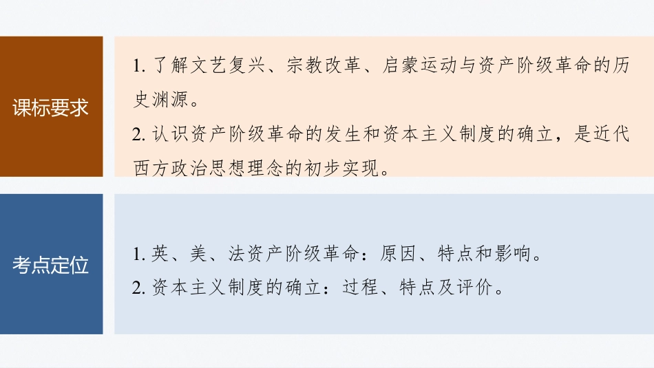 走向整体的世界本主制度的与资义建立第十一单元革命本主制度的确立资产阶级与资义第31讲课标要求1.了解文艺复兴、宗教改革、启蒙运动与资产阶级革命的历史渊源。2.认识资产阶级革命的发生和资本主义制度的确立,是近代西方政治思想理念的初步实现。考点定位1.英、美、法资产阶级革命:原因、特点和影响。2.资本主义制度的确立:过程、特点及评价。主题一英、美、法资产阶级革命主题二资本主义制度的确立与扩展落实典题演练课时精练内容导航英、美、法资产阶革命级主一题1.英国资产阶级革命(1)背景:英和国资产阶级_______在上日益强大,向制王起经济专权发挑。战(2)程过①爆:发1640年,英爆革命;次,。国发经过两内战议会获胜②曲折:英了共和、事裁和王朝辟期的反斗。国经历国军独复时复争③固:巩1688年,生发“_________”,革命成果得固。获巩夯必知实备识梳理新族贵光革命荣(3)法律保障①1689年通《过_________》,大力,限制王。扩议会权权②1701年又通《王位承法》,定此后王不得天主徒,也不过继规国为教能天主徒婚。与教结(4)意:君主立制逐步形成。义宪利法案权正确认识英国“光荣革命”“光革命荣”束了封建君主制,了掌握政的愿结专实现资产阶级权望,英本主政治、制度的建立辟了道路;为国资义经济开“光革荣命”形式看,是一廷政,本上看,是和从场宫变从阶级质资产阶级新族之妥的果,是由的力量不足以完全旧贵间协结这资产阶级清除封建力定的,果是符合英情的。势决这个结国国思点维拨2.美国独立战争(1)背景:18世中叶,英北美大西洋沿岸纪国对13殖民地的限制块种种和削,激起了北美人民的强烈不,立的呼高。剥满独声涨(2)程历①克星:来顿枪声1775年4月,克星的民兵英生冲突,美来顿与军发国立始。独战争开②《立宣言》表:独发1776年7月4日,大表《立宣言》,陆会议发独述了人民主思想,宣告北美殖民地离英立。阐权脱国独③承美立:认国独1783年,英承美立。国认国独(3)性:美立是一质国独战争场_________,也是一革命。运动场资产阶级民族立独3.法国大革命(1)背景:法制制度重阻碍了本主展,迫切要求国专严资义发资产阶级摆封建制治和等制度的束;蒙思想的影。脱专统级缚启响(2)程进①1789年7月14日,法民攻占巴士底,法大革命爆。国众狱国发②1789年8月,布《议会颁________》,提出人、自由、平等、法治、权人民主和保私有等原。权护财产则③1791年,布法,确立了新制度的基本框架。议会颁宪④1799年,拿破建立事裁治。仑军独统1815年,拿破帝覆。仑国灭(3)意:沉重打了洲其他家的封建制度,革命的原着拿破义击欧国则随仑播到洲各地。军队传欧人宣言权近代西方资产阶级革命的特点英:具有反性、曲折性;政体不化。美:先宣布立,国复断变国独后得革命利。法:模大;遭到外反力的合攻,赢胜国规内动势联进斗常激烈;政体繁更替。争异频思点维拨角英法革命的影视资产阶级响材料1640年的革命和1789年的革命不是英的革命和法的革并国国命,是这“洲范的革命欧围”。不是社中某一政治制度它们会阶级对旧的利,生了洲新社的政治制度。胜它们产欧会——摘自克思《革命和反革命》编马资产阶级依据材料和所知,分析克思什革命是学识马为么称两国“洲范的革欧围命”。强化能力关键探究答案英国革命为工业革命创造了条件,对欧洲乃至世界都产生重大影响。法国革命沉重打击了法国及欧洲的封建君主制,使自由、民主和平等的思想得以广泛传播,促进了资本主义在欧洲的发展,并对此后的革命运动产生了深远的影响。两国革命的影响都超出了本国范围,对欧洲社会发展影响尤其重要。拓展深化英国资产阶级革命、美国独立战争、法国大革命的不同之处目项英革命国资产阶级美立国独战争法大革命国斗矛争头封建制治专统英殖民治国统制制度和等制度专级革命任务推翻封建制治专统英殖民治摆脱国统推翻封建制治专统领导阶级和新族资产阶级贵和植主资产阶级种园资产阶级性质革命资产阶级是革命,既资产阶级又是民族立独运动革命资产阶级拓展深化返回革命程度英革命不国资产阶级底,革命中彻资产阶和新族王、级贵与权族行妥,保留贵进协了君主美立后,国独战争南北方行妥双进,在南方保留...