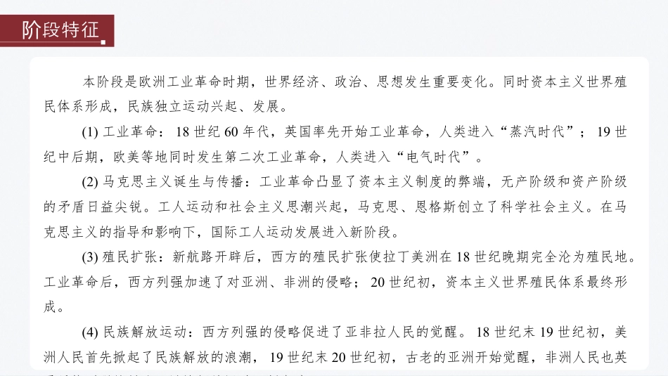 工革命、克思主的生和世业马义诞界殖民体系的形成第十二单元空坐时标1496年17世纪18世纪60年代1785年19世中期纪19世中后纪期19世末纪20世初纪拉丁美洲殖民地化洲殖民地亚半殖民地化工业革命瓦特蒸汽机使用英完成第一国次工革命业第二次工革命业帝主国义瓜分狂潮本主世界资义体系形成经济殖民工革命扩张与业手工生期产时“蒸汽时代”“电气时代”美国独立战争拉丁美洲民族独立运动克思主马生义诞巴黎公社洲醒亚觉非洲抗争墨西哥资产革命阶级工人民族解放运动与本阶段是欧洲工业革命时期,世界经济、政治、思想发生重要变化。同时资本主义世界殖民体系形成,民族独立运动兴起、发展。(1)工业革命:18世纪60年代,英国率先开始工业革命,人类进入“蒸汽时代”;19世纪中后期,欧美等地同时发生第二次工业革命,人类进入“电气时代”。(2)马克思主义诞生与传播:工业革命凸显了资本主义制度的弊端,无产阶级和资产阶级的矛盾日益尖锐。工人运动和社会主义思潮兴起,马克思、恩格斯创立了科学社会主义。在马克思主义的指导和影响下,国际工人运动发展进入新阶段。(3)殖民扩张:新航路开辟后,西方的殖民扩张使拉丁美洲在18世纪晚期完全沦为殖民地。工业革命后,西方列强加速了对亚洲、非洲的侵略;20世纪初,资本主义世界殖民体系最终形成。(4)民族解放运动:西方列强的侵略促进了亚非拉人民的觉醒。18世纪末19世纪初,美洲人民首先掀起了民族解放的浪潮,19世纪末20世纪初,古老的亚洲开始觉醒,非洲人民也英勇反抗列的侵略族解放动断高涨段特征阶影世界的工革命响业第32讲课标要求1.认识大机器生产、工厂制度等的出现对改变人们劳作方式及生活方式的意义。2.了解工业革命带来的社会生产力的极大发展以及所引起的生产关系的深刻变化。3.理解工业革命对资本主义世界体系的形成及对人类社会生活的深远影响。考点定位1.工业革命的背景、进程、特点。2.现代工厂制度的特点及影响。3.工业革命对人类生产和生活方式带来的变化。主题一工业革命的背景、进程和特点主题二工业革命的影响落实典题演练课时精练内容导航工革命的背景、业程和特点进主一题一、工业革命的背景1.内涵:手工向机器生的重大。从劳动转产飞跃夯必知实备识梳理家国英国件条政治英国“光革命荣”后,政局定,政府鼓国内稳积极励经济发展经济(1)本主展迅速,工展提供了充裕的农业资义发为业发农产品、自由力和市。劳动国内场(2)通过_________,促了本原始累,得大量廉价进资积获的原材料和广的海外市阔场技术手工工和工人生技水平高;科家心社技场产术较学关会对的需求;生技的步术产术进2.兴起殖民扩张圈地运动15世末至纪19世上半叶英族用暴力大模民土地的程。纪国贵规剥夺农过15世末,因毛工勃及羊毛价格上,英的新族用纪纺织业兴涨国贵栅栏和渠圈占民的土地,把耕地牧羊。被圈地的村庄房屋被毁沟农变为场区坏,民破,乞和流浪者,或在法律迫下成雇者,农产沦为丐压为佣劳动就是英史上的这国历“圈地运动”。在上,本主展提供了经济为资义发资本原始累和自由力;在社面上,促了英社的化,积劳动会层进国会结构变成推为动17世英政治革命、纪国18世工革命的重要因素。英纪业国实行圈地的是用本主方式代替封建方式。运动实质资义经营经营念概阐释二、工业革命的进程(一)第一次工革命业1.成果(1)技革新:术①:梭、水力布机;:珍机、水力机、织飞织纺妮纺纱纺纱机。骡②棉基本了机械生。纺织业实现产背景工革命前,英分散的手工工已向集中的手工工展,业国场经场发在一定程度上了生化实现产专业志标18世纪60年代以,以来___________代表的一系列技革命为术特点大批工人被工主聚集起,在化的房中作,底产业厂来专门厂劳彻改了手工作坊零碎分散的生变产状态(2)机器大生工制度产与厂(必选2,P25-26)①机器大生产改良蒸汽机端开1771年,_________在曼斯特了第一家水力,成彻开办纺纱厂为近代工的端厂开特点制度工人行倒班制,工主制定格的章制度,以款、实厂严规罚体和解雇等方式强化律意罚纪识生产____________被广泛用到生程中,各生应产过产环节协同作,整生程于工主的督管理之下劳个产过处厂监原料原料由工一供、合理配厂统...