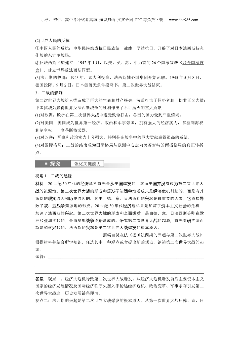 小学、初中、高中各种试卷真题知识归纳文案合同PPT等免费下载www.doc985.com第38讲第二次世界大战与战后国际秩序的形成课标要求通过了解第二次世界大战,理解20世纪上半期国际秩序的变动。考点定位1.第二次世界大战的背景、历程和影响。2.二战后国际秩序建立的背景、特点和影响。主题一第二次世界大战1.二战的背景(1)法西斯主义的形成过程意大利1922年,墨索里尼建立了法西斯政权德国1920年,德意志工人党改名,简称“纳粹党”,是德国法西斯运动的开始日本1921年,冈村宁次、东条英机等日本军人订立密约,是日本军部法西斯运动的开始特征法西斯主义以极端民族主义为基本特征,反对自由主义和共产主义,主张对内实行恐怖独裁统治,对外侵略扩张,发动战争,争霸世界(2)经济危机的影响①法西斯势力:面对1929年的经济大危机,法西斯分子鼓吹通过战争寻找出路。②罗斯福新政:美国走上了罗斯福新政的道路,缓解经济危机。图解历史经济危机后各国的发展(3)亚欧战争策源地的形成亚洲战争策背景①世界经济大危机重创日本经济。②日本法西斯分子妄图把中国东北变成日本独占的海外市小学、初中、高中各种试卷真题知识归纳文案合同PPT等免费下载www.doc985.com源地形成场和殖民地,进而征服中国,最终征服世界过程①1931年,日本军队发动九一八事变,侵占中国东北。②1936年,日本建立军事法西斯专政,以扩大对外侵略为基本国策欧洲战争策源地形成背景①经济大危机使德国经济落入低谷。②社会各阶层普遍对政府失去信任,法西斯势力迅速发展。③纳粹党煽动民族复仇主义,得到广泛支持过程①1933年,纳粹党攫取德国政权,建立法西斯独裁统治,积极扩军备战。②1935年,意大利入侵埃塞俄比亚。③1936年,意大利和德国结成轴心国(4)英法的绥靖政策背景1938年,德国吞并奥地利,并对捷克斯洛伐克提出领土要求表现英法与德意签订《慕尼黑协定》,把苏台德等地区割让给德国影响更加助长了法西斯国家的侵略野心概念阐释绥靖政策靖政策是一侵略不加抵制,姑息容,退屈服,以牲代价,同侵略者勾绥种对纵让牺别国为结和妥的政策。协20世纪30年代前,靖主要表扶植德、支持日本充防范的绥现为国当苏联屏障和人民革命的打手。镇压2.二战的过程(1)法西斯国家的侵略战争亚洲局部战争序幕1931年,日本制造九一八事变,发动了侵华战争爆发1937年7月7日,日本制造七七事变,发动了全面侵华战争,中国开始全民族抗战,这也成为第二次世界大战在亚洲爆发的标志欧洲战场扩大全面爆发1939年9月,德国以“闪击战”突袭波兰,英法被迫对德宣战扩大德国占领欧洲大部分地区,法国败降,英国坚持抵抗1941年6月,德国入侵苏联,苏联战场成为抵抗纳粹德国的主战场太平洋战争1941年12月,日本挑起太平洋战争,美国对日宣战,第二次世界大战发展到全球阶段小学、初中、高中各种试卷真题知识归纳文案合同PPT等免费下载www.doc985.com(2)世界人民的反抗①中国人民的反抗:中华民族结成抗日民族统一战线,团结抗日,开辟了对日本法西斯持久作战的东方主战场。②反法西斯同盟建立:1942年1月,以美、英、苏、中为首的26个国家签署《联合国家宣言》,建立世界反法西斯同盟。(3)法西斯的投降:1943年,意大利投降,法西斯轴心国集团开始瓦解。1945年5月8日,德国投降。9月2日,日本签署无条件投降书,第二次世界大战结束。3.二战的影响第二次世界大战给人类造成了巨大的生命和财产损失;沉重打击了侵略者和一切非正义力量;中国抗战为赢得世界反法西斯战争的胜利作出了不可磨灭的重大贡献(1)对欧洲:欧洲在第二次世界大战中遭受致命打击,各国的国力受到严重消耗。(2)对美国:美国成为世界第一经济、政治和军事强国,拥有强大的经济实力,掌握制海权和制空权,一度垄断核武器。(3)对苏联:军事和政治实力十分强大,特别是在战争中的巨大贡献赢得很高的威望。(4)对国际格局:二战的结束成为国际格局从欧洲中心走向美苏对峙的两极格局的真正转折点。视角1二战的起源材料20世纪30年代的危机首先是美爆的,然而美有成第二次世界大经济从国发国并没为的策源地。第二次世界大的形成和爆不能地看成只是危机引起的,而是有其战战发简单...