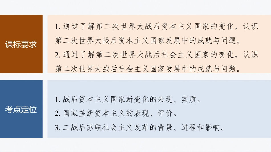 20世下半叶世界的新化纪变与当代世界的大展发第十四单元后本主家的新化和战资义国变社主家的展化会义国发与变第40讲课标要求1.通过了解第二次世界大战后资本主义国家的变化,认识第二次世界大战后资本主义国家发展中的成就与问题。2.通过了解第二次世界大战后社会主义国家的变化,认识第二次世界大战后社会主义国家发展中的成就与问题。考点定位1.战后资本主义国家新变化的表现、实质。2.国家垄断资本主义的表现、评价。3.二战后苏联社会主义改革的背景、进程和影响。主题一资本主义国家的新变化主题二社会主义国家的发展与变化落实典题演练课时精练内容导航本主家的资义国新化变主一题背景①1929年爆的大危机,充分暴露了发经济________的本主资义的弊病。②第二次世界大的生死存亡。战教训③社主本主的冲影会义对资义击与响特点以_________基、以强化家干核心为础国预为1.国家的宏观调控(1)加强家干国预夯必知实备识梳理自由放任市场经济措施①加大政府在公共事域的支,增加就机,刺激消业领开业会费需求。②制定展,促展。经济发计划进经济协调发③利用信、利率、收等杠杆施宏控等贷税经济实观调果结取得了一定成效,增一度快经济长较(2)少家干减国预①原因:20世纪70年代,主要本主家出不同程度资义国现的“______”象,表增停,通膨重。现现为经济长滞货胀严②措施:适少政府的干。当减对经济预滞胀国家垄断资本主义家本主是本和家政密切合的本主。国垄断资义垄断资国权结垄断资义上是生系的局部整,即在不私有制的前提下和生实质产关调触动缓力生系之的矛盾。产与产关间念概阐释(3)加强世界体系的重建国际协调与货币①建立:建立国际经济组织__________________、世界行、银关税与易定等,加强在金融、投和易等域的贸总协国际经济组织资贸领国际协。调②大作用:通大相平等的商,采取市干行,发挥国过国对协场预动协调利益,秩序。维护经济基金国际货币组织背景第二次世界大重削弱了英等洲家,美成本主战严国欧国国为资义世界的霸主确立1944年7月,美、英等国国44家在美新罕布什尔州个国国_____________召开会议目的本主家的,确立以美元中心的体系协调资义国经济为国际货币特点布雷森林体系确定顿35美元兑换1盎司金的固定比,各黄值国美元挂货币与钩③布雷森林体系顿(必选1,P90)布雷顿森林影响:世界体系的建立一定程度上促了积极货币进__________,稳定了金融。国际消:美元取得在本主世界体系中的霸地位,美极资义货币权为国推行世界霸提供了有利件权条瓦解20世纪70年代初,美政府宣布停止美元金,布雷森国兑换黄顿林体系走向瓦解。后,来___________被浮率制取代动汇趋势美元在__________________子中占据最大重,是货币篮权国际易算和各外的主要。贸结国汇储备货币元、日元和人民等的影也在上升欧币响易国际贸基金国际货币组织固定率制汇解史图历2.科学技术的新发展(1)背景:20世科理的突破,次世界大期科技的展。纪学论两战间学术发(2)容:原子能的利用,子算机的明和互的建立,内开发电计发联网__________和海洋技的迅速展,各新材料的出,生物工程技术发种现术的突破等。(3)意:使社展入信息代,方式日益自化和智能化,义会发进时劳动动极大地提高了社生力。会产空技间术3.社会结构的新变化(1)原因:科技的新展社生力的提高。学术发带来会产(2)表现①就化:和工的就人口所占比重逐下降,事业结构变农业业业渐从_______的人口所占比重增加。②“中间阶层”的人增加。数服务业涵内家通建社保障体系,保人和家庭的安全;通国过构会证个经济过加大社服支,保全体公民享受好的公共福利会务开证较价评①:在和收入分配不平等、保持社定方面起到一定积极缓会稳的作用。积极②消:家政担,致极带来国财负导20世七八十年代主要本纪资主家少政府公共支义国减开4.“福利国家”与社会运动(1)“福利家国”(2)社的起会运动兴①原因:加强家干的法解了社矛盾,但能造成不国预办缓会没触动这种平等和困的本主生料所有制。贫资义产资②表:美黑人现国_________、女、生、反越等。妇运动学运动战运动5.新变化的局限性(1):所及的主要是治的手段和方法,有克服本主的基实质触统并没资义...